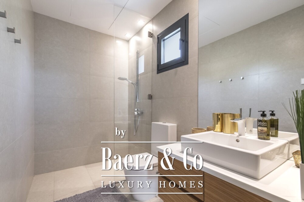 في الطابق العلوي، تضم الجناح الرئيسي خزانتي ملابس مزدوجتين وحماماً داخلياً، مع منفذ إلى الشرفة، بينما تشترك غرفتان إضافيتان في شرفة وحمام. الشرفة العلوية مكرسة للإطلالات البانورامية، مع برغولا وصالة رياضية على السطح. يحتوي الطابق السفلي على غرفتي نوم مضاءتين طبيعياً، ومنطقة سبا مع جاكوزي وساونا وحمام بخار ومساحات تخزين عملية. تتصل جميع الطوابق بمصعد ودرج من خشب البلوط مزود بحواجز زجاجية. تشمل هذه الفيلا شهادة الإشغال ورخصة التأجير، وتقع على مقربة من ملاعب الجولف ومرافق ماربيا، ما يوفر أسلوب حياة استثنائي مباشرة على البحر الأبيض المتوسط.