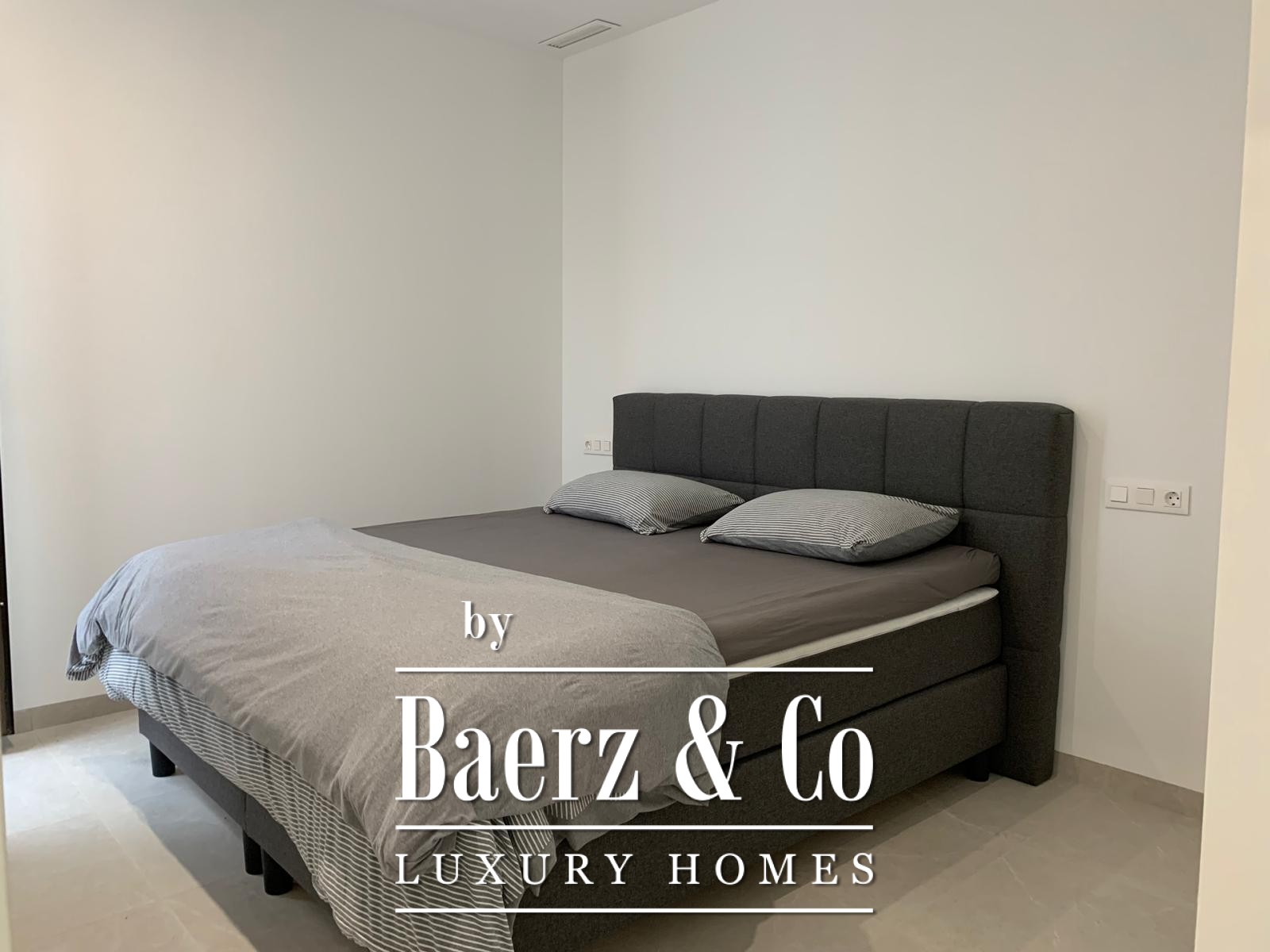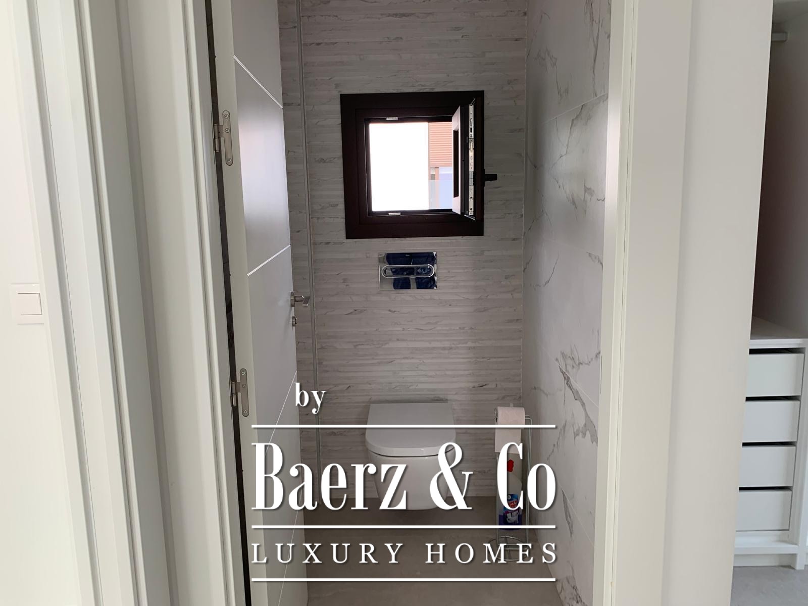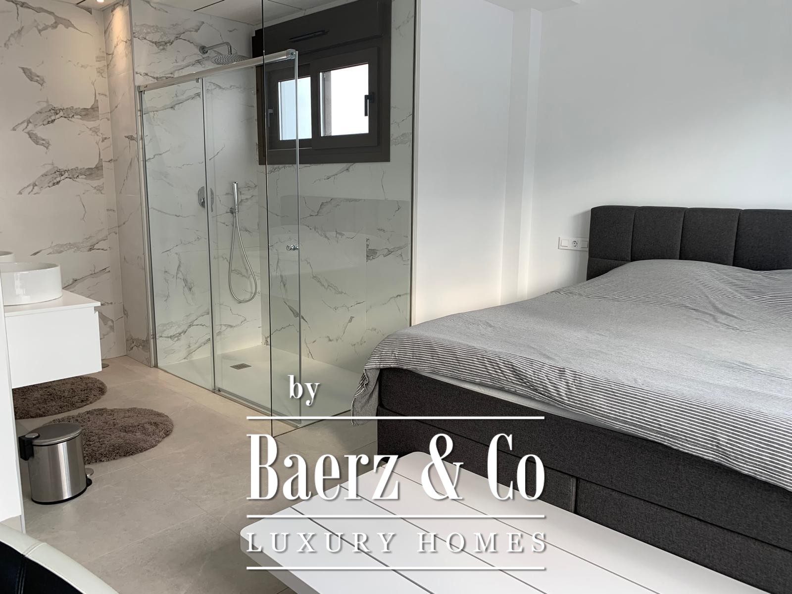 Das Obergeschoss beherbergt eine ruhige Mastersuite mit eigenem Badezimmer inklusive begehbarer Dusche und separater Ankleide sowie einer separaten Toilette. Im Erdgeschoss rahmt eine voll ausgestattete, offene Küche den Eingangsbereich und führt in ein helles Wohn- und Esszimmer. Zwei Schlafzimmer – eines davon mit eigenem Bad – sowie ein diskretes Gäste-WC ergänzen diese Ebene.