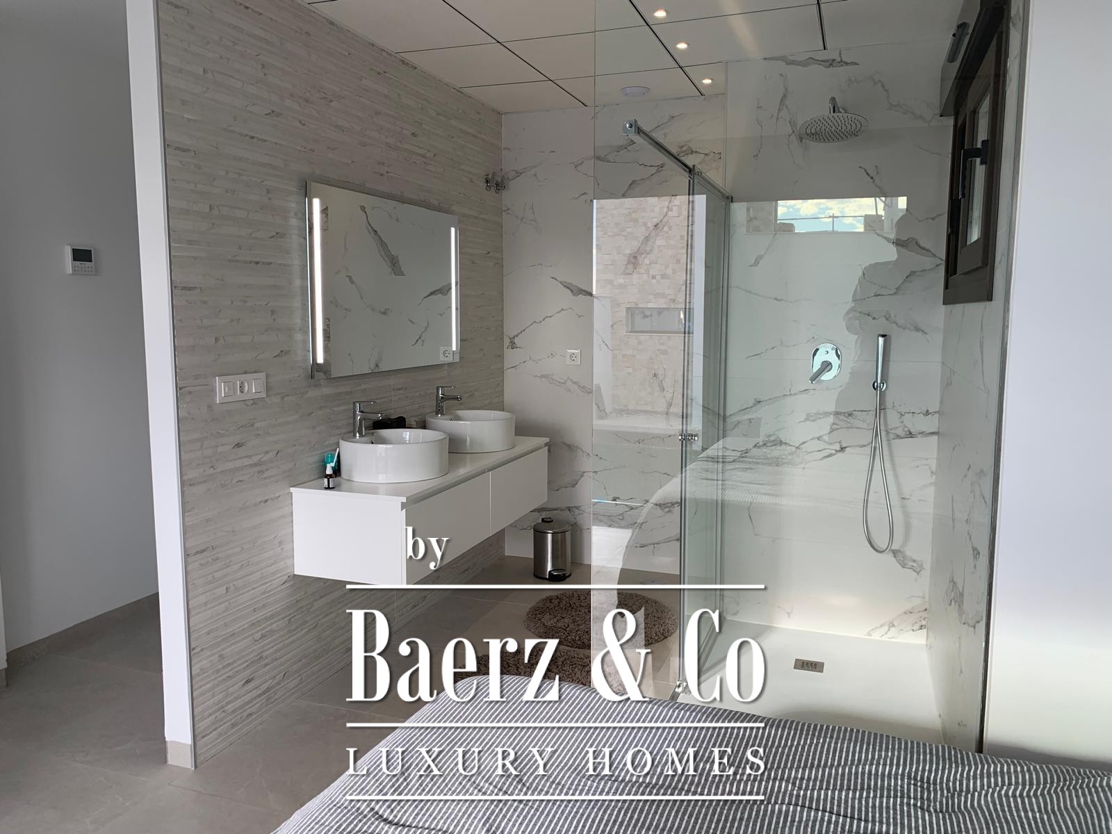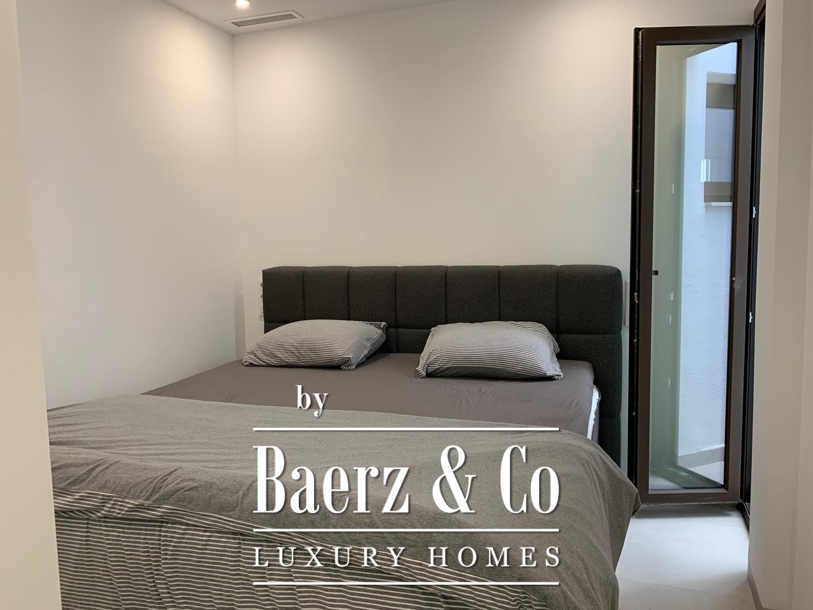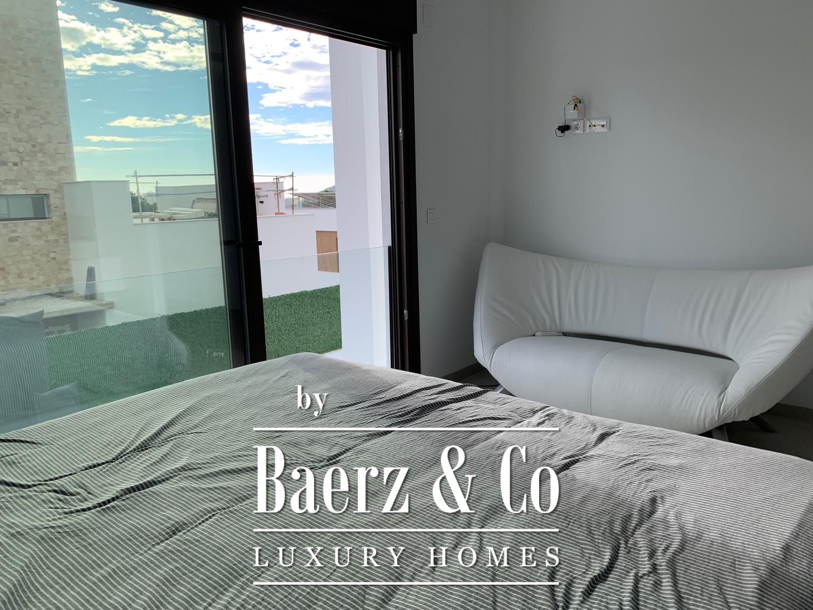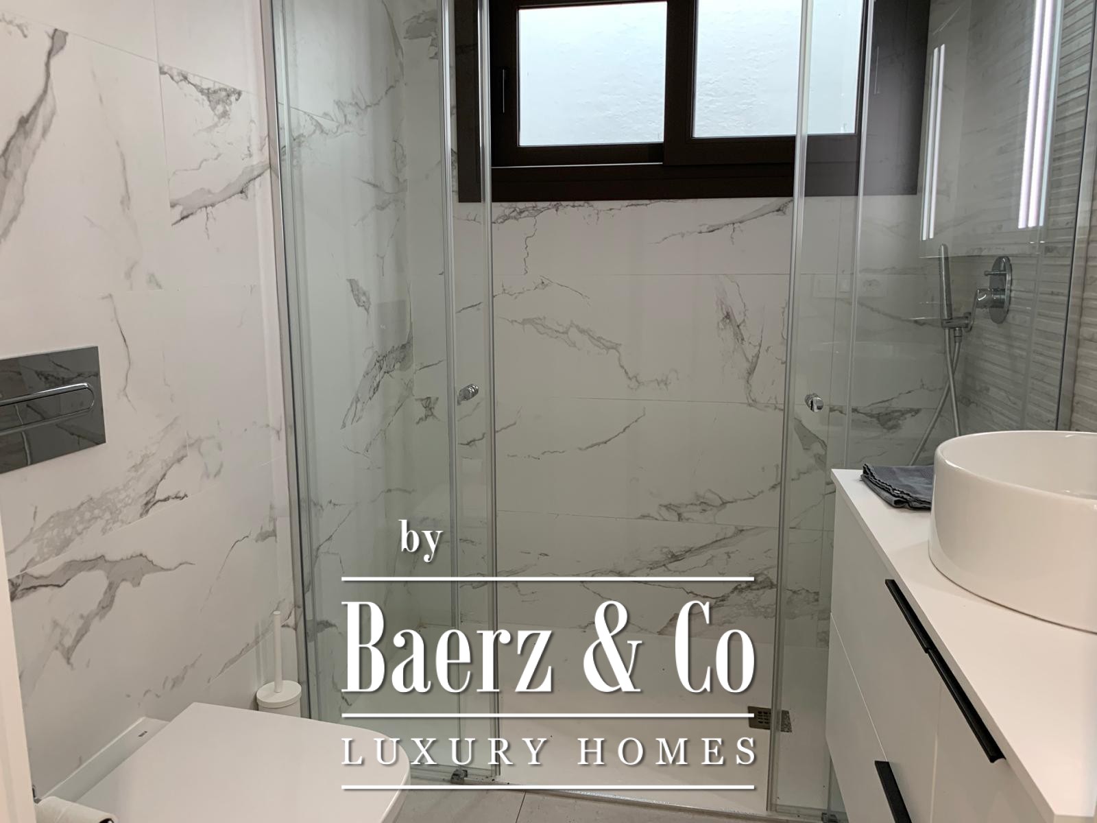Das Obergeschoss beherbergt eine ruhige Mastersuite mit eigenem Badezimmer inklusive begehbarer Dusche und separater Ankleide sowie einer separaten Toilette. Im Erdgeschoss rahmt eine voll ausgestattete, offene Küche den Eingangsbereich und führt in ein helles Wohn- und Esszimmer. Zwei Schlafzimmer – eines davon mit eigenem Bad – sowie ein diskretes Gäste-WC ergänzen diese Ebene.