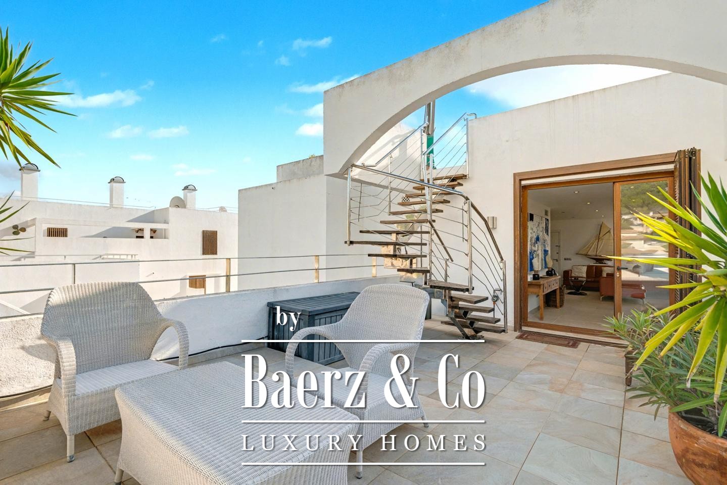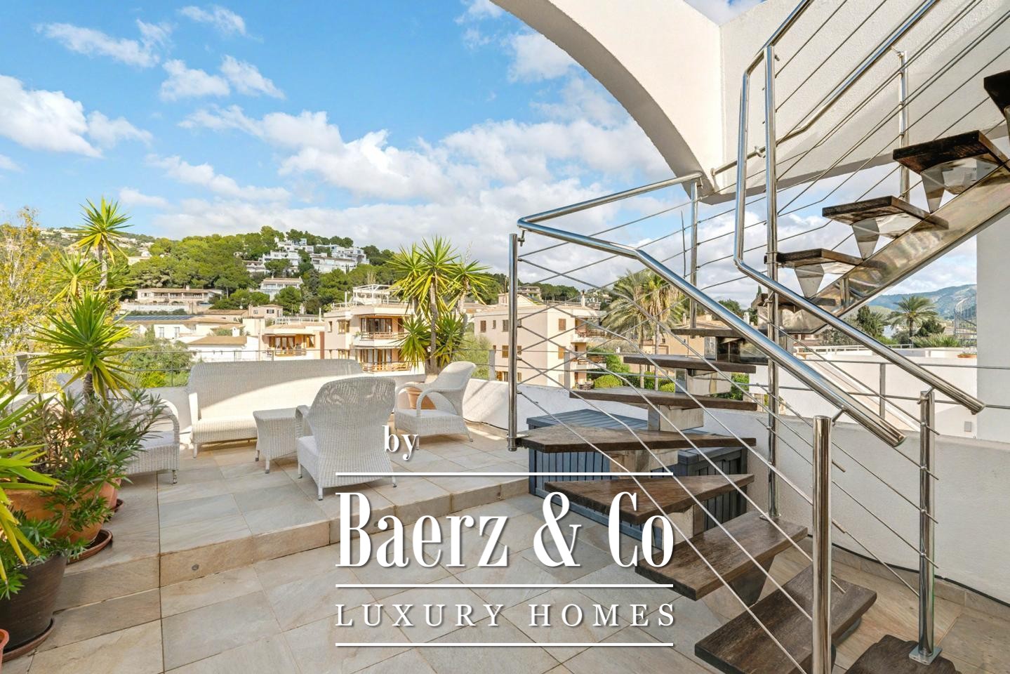 Eine private Treppe führt zur Dachterrasse des Penthouses, einem weitläufigen, sonnendurchfluteten Bereich für vielseitiges Outdoor-Leben. Hier werden Ausblicke auf Port d'Andratx mit Privatsphäre harmonisch kombiniert. Der Raum eröffnet vielfältige Möglichkeiten, etwa für eine Lounge, eine Außenküche oder einen Jacuzzi, und bietet einen exklusiven Rahmen für ganzjährigen Genuss des Inselklimas.
