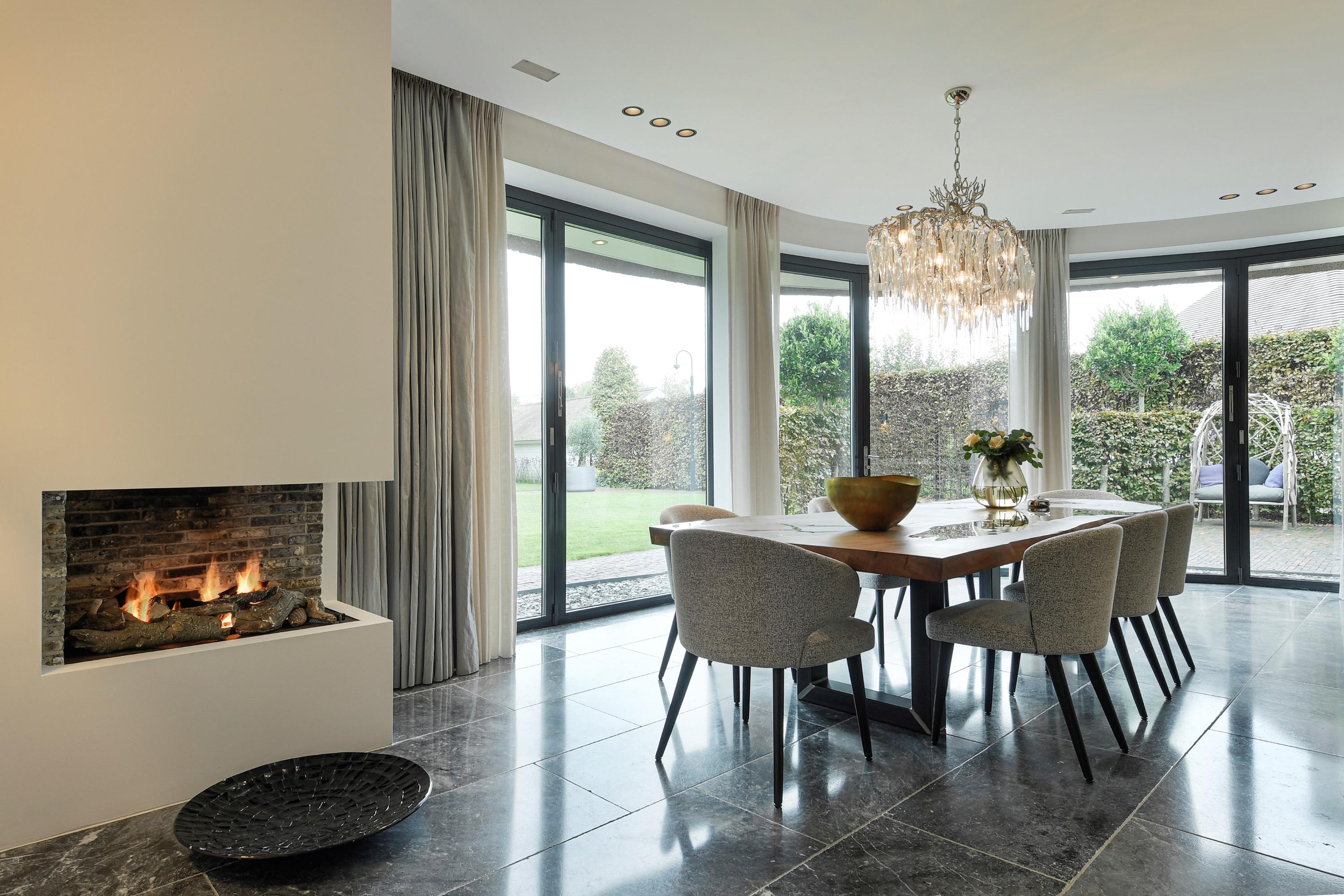 Der einladende Eingang empfängt mit einer großzügigen Halle, einer geschwungenen Treppe und hohen Doppeltüren. Von hier gelangen Sie in Wohnbereiche, in denen das Licht jeden Raum gestaltet. Das Wohnzimmer, dessen Mittelpunkt ein eleganter Kamin bildet, ist fließend mit den Terrassen und dem Garten verbunden; Schiebetüren aus Holz ermöglichen flexible Übergänge zwischen Lounge- und Essbereich. Die Küche begeistert mit einer Kochinsel aus Patagonia-Quarzit, Geräten von Gaggenau und führt in einen Hauswirtschaftsbereich mit direktem Zugang zur Doppelgarage mit elektrischen Toren.