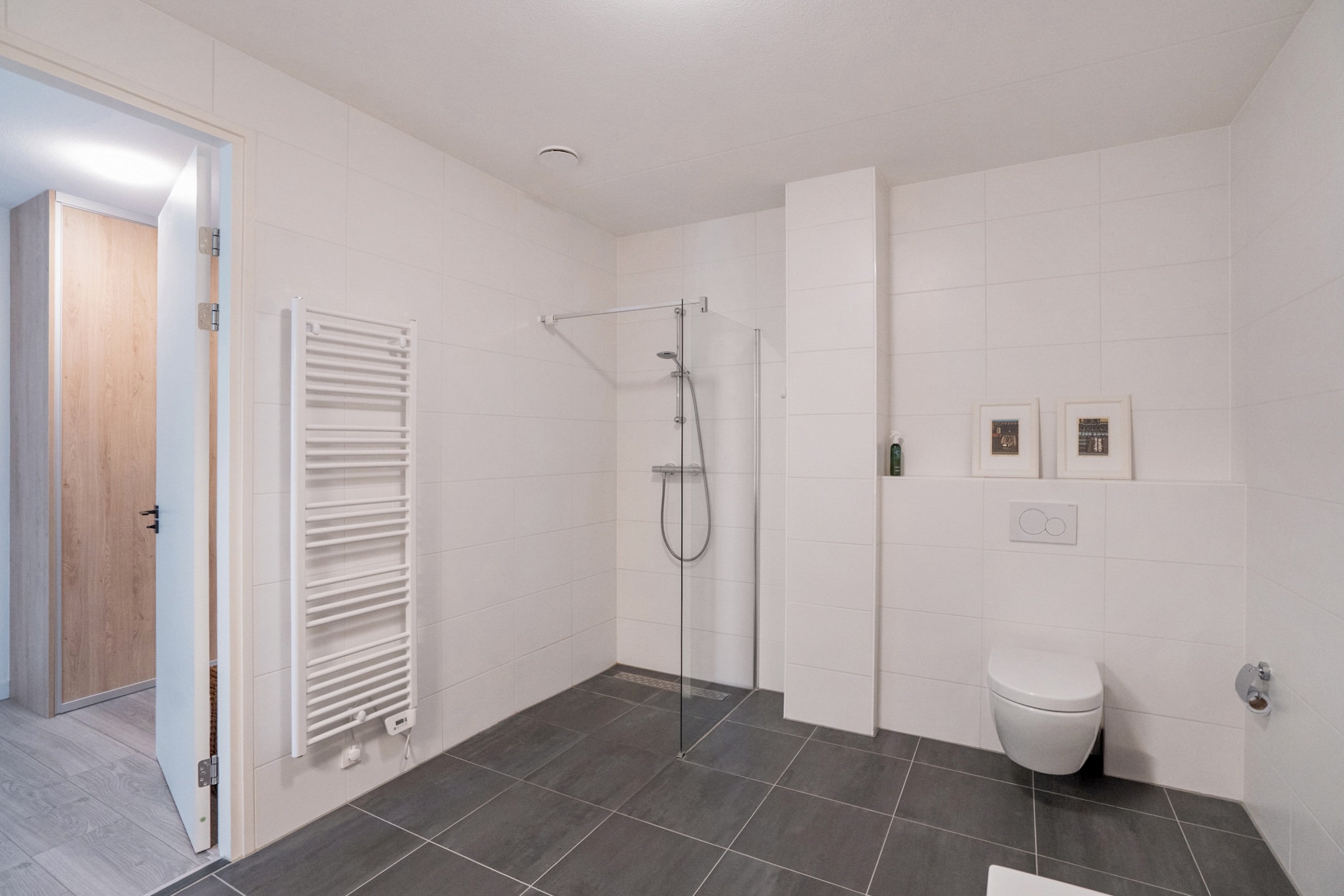 A door in the living room leads you to the hallway with a deep closet that offers plenty of storage space and houses the technical installations out of sight. A modern bathroom, the smaller of the two, with a tiled floor, deep walk-in shower, vanity unit, and toilet.