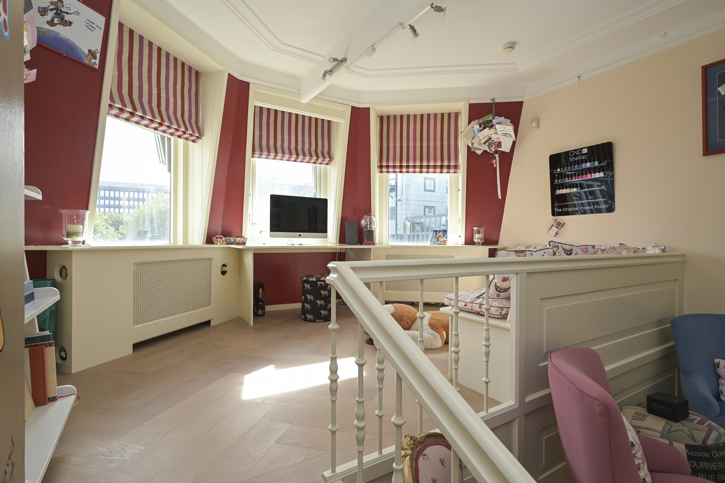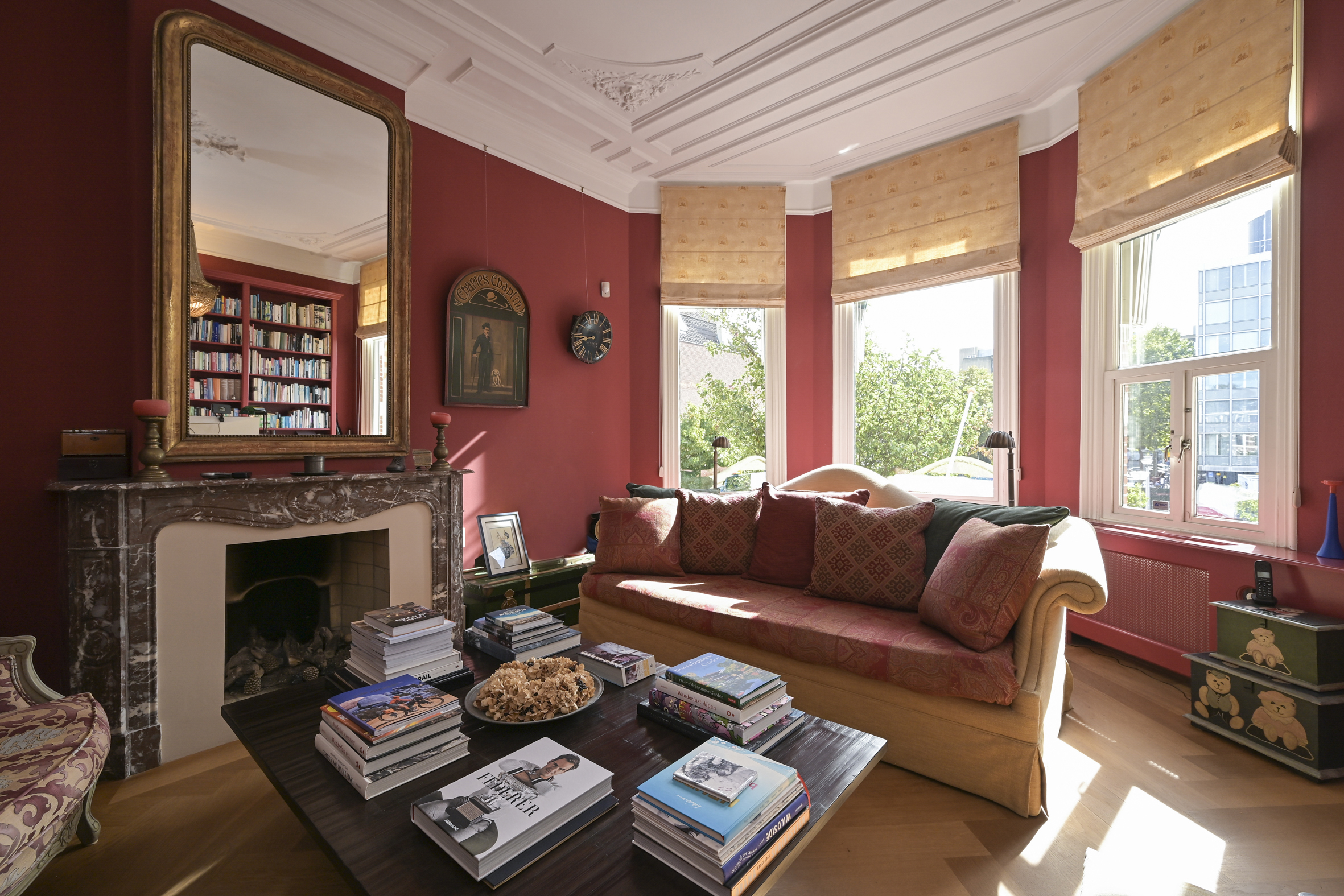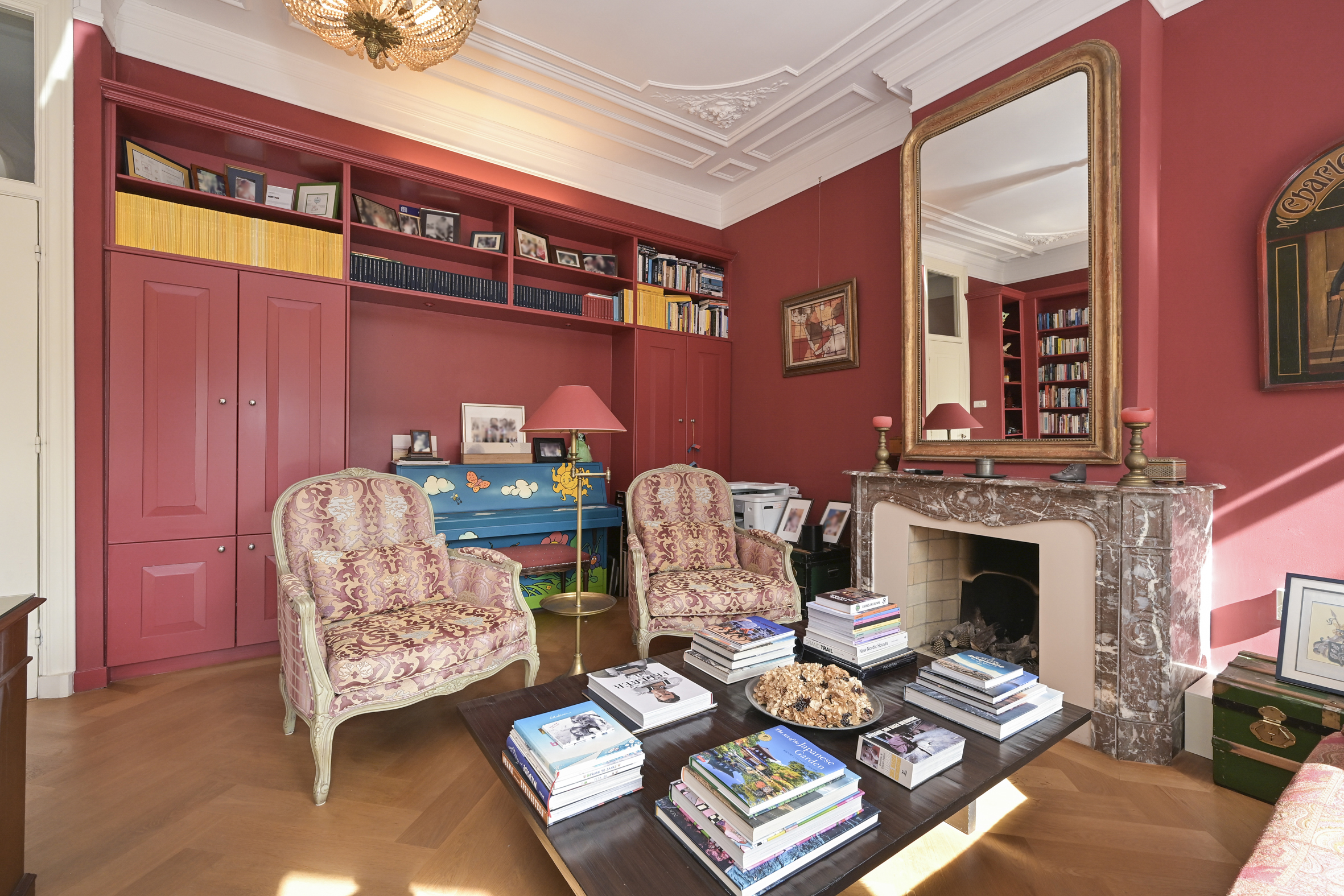 The beautiful staircase leads to the first floor, landing, modern toilet with washbasin, spacious rear bedroom with beautiful oak flooring, fireplace with gas fire, high ceilings, walk-in wardrobe, and an adjoining full bathroom with bathtub, separate walk-in shower, and double sinks with vanity units. At the front is the full-width classic study with high ceilings, fireplace with gas fire, oak floors, built-in bookcases, and an unobstructed view.
