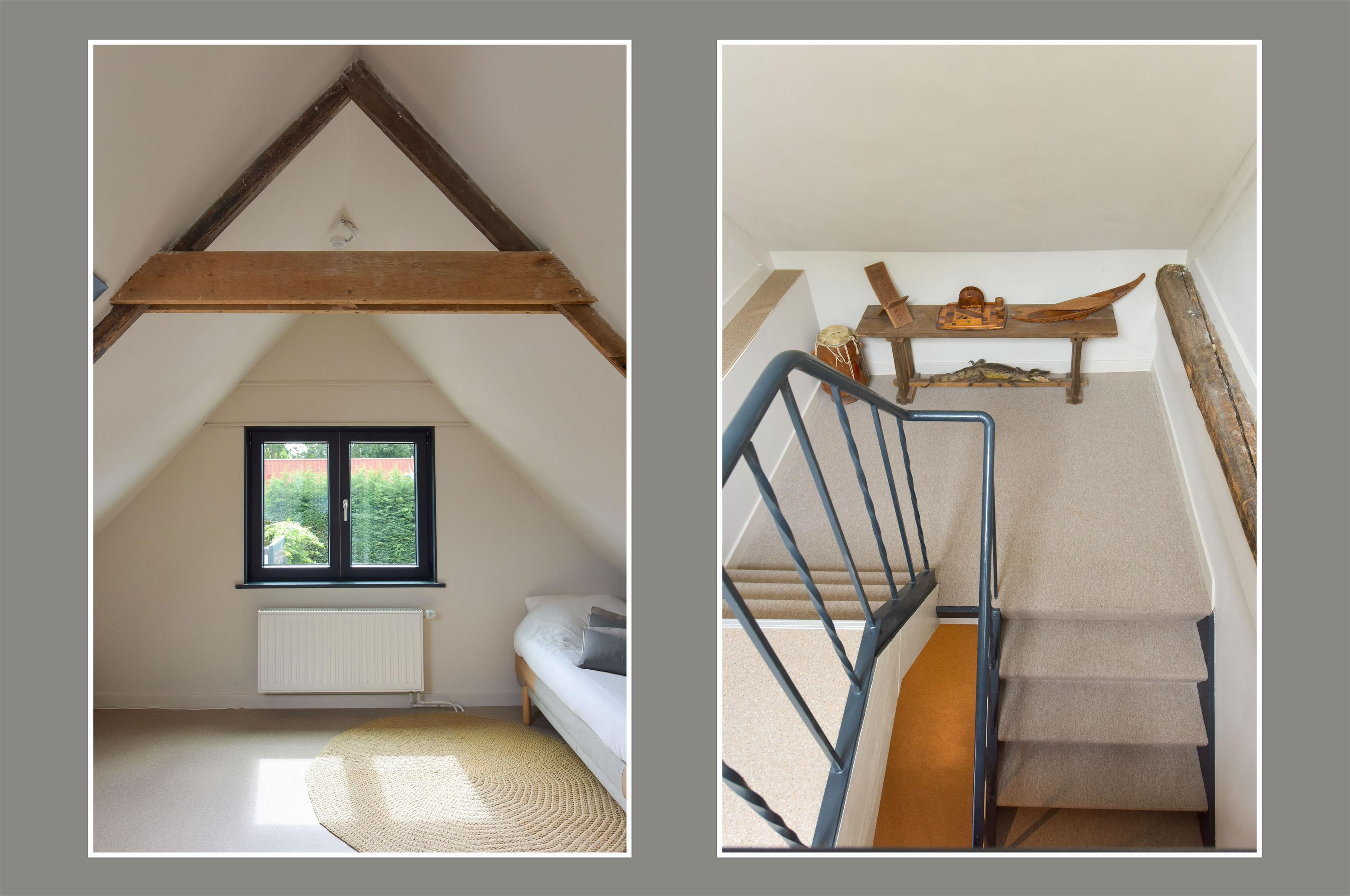A doorway in the studio provides direct access to the former cattle shed, now used as a workshop. The combination of studio and workshop makes this building perfect for creatives, makers or entrepreneurs wanting to combine living and working in one location. Converting it into an extra living unit — for example, a B&B or au pair quarters — is also possible.