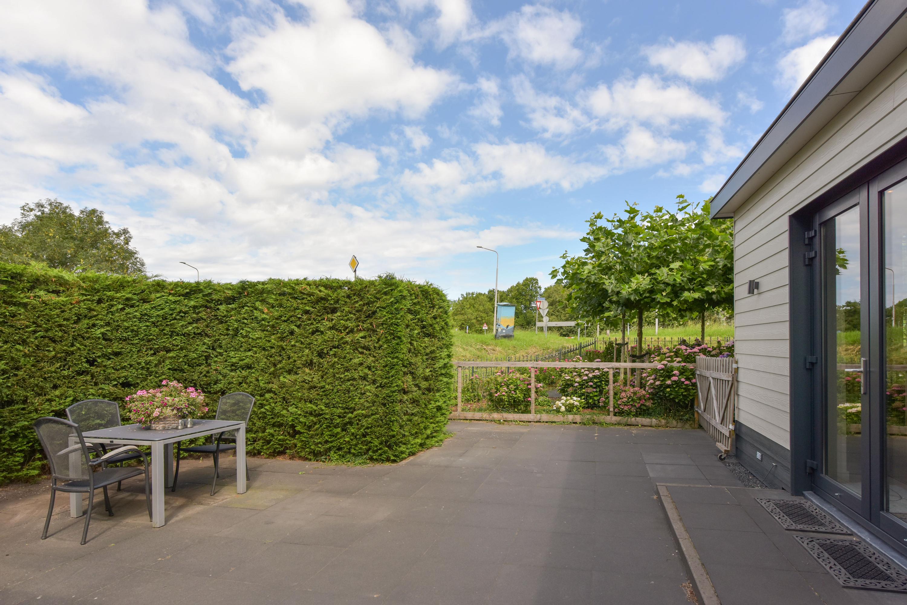A spacious tiled terrace lies adjacent to the living room, with ample space for a large dining table, lounge set or multiple seating areas. Thanks to its position and openness, you enjoy both sun and privacy — ideal for long summer evenings or quiet mornings with coffee and a view of the greenery. Next to the terrace is a stylish veranda, furnished as a comfortable lounge corner. Even in less favourable weather, this space is a joy: covered, sheltered, fitted with electricity and atmospheric lighting. A dedicated jacuzzi connection (jacuzzi optionally available) turns this into a private spa in your own backyard — luxury and relaxation at your fingertips.
