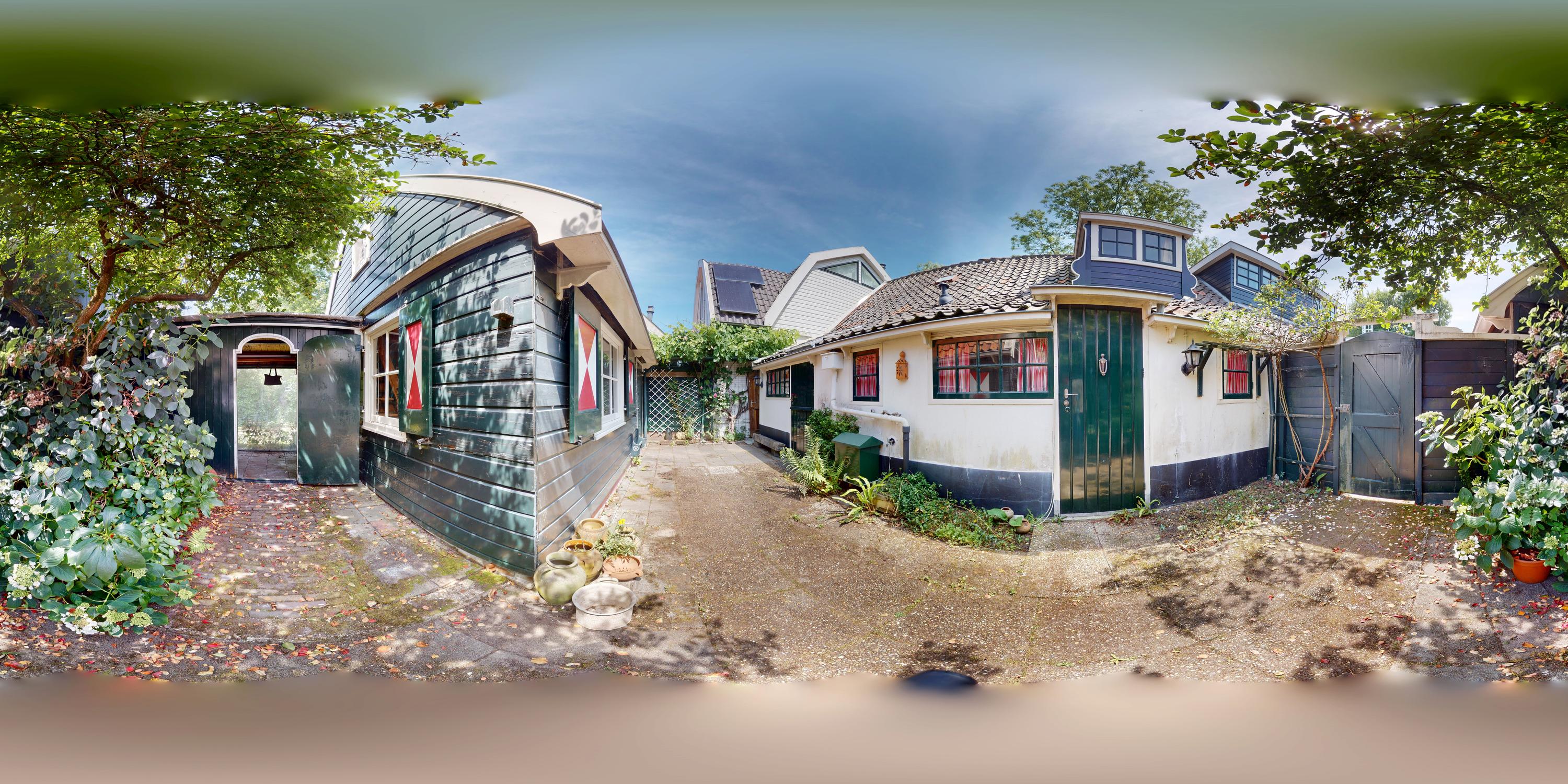 This authentic property offers a unique opportunity for those seeking a characteristic home in a special location, ready to be renovated entirely to one’s own taste. Situated along the Amsteldijk, the house lies slightly below road level and is partly hidden among the greenery. From the dike, a staircase descends to the front garden – a green space offering peace and privacy. On the right-hand side of the house, a narrow path runs along the façade to the front door, subtly set into the exterior wall.
