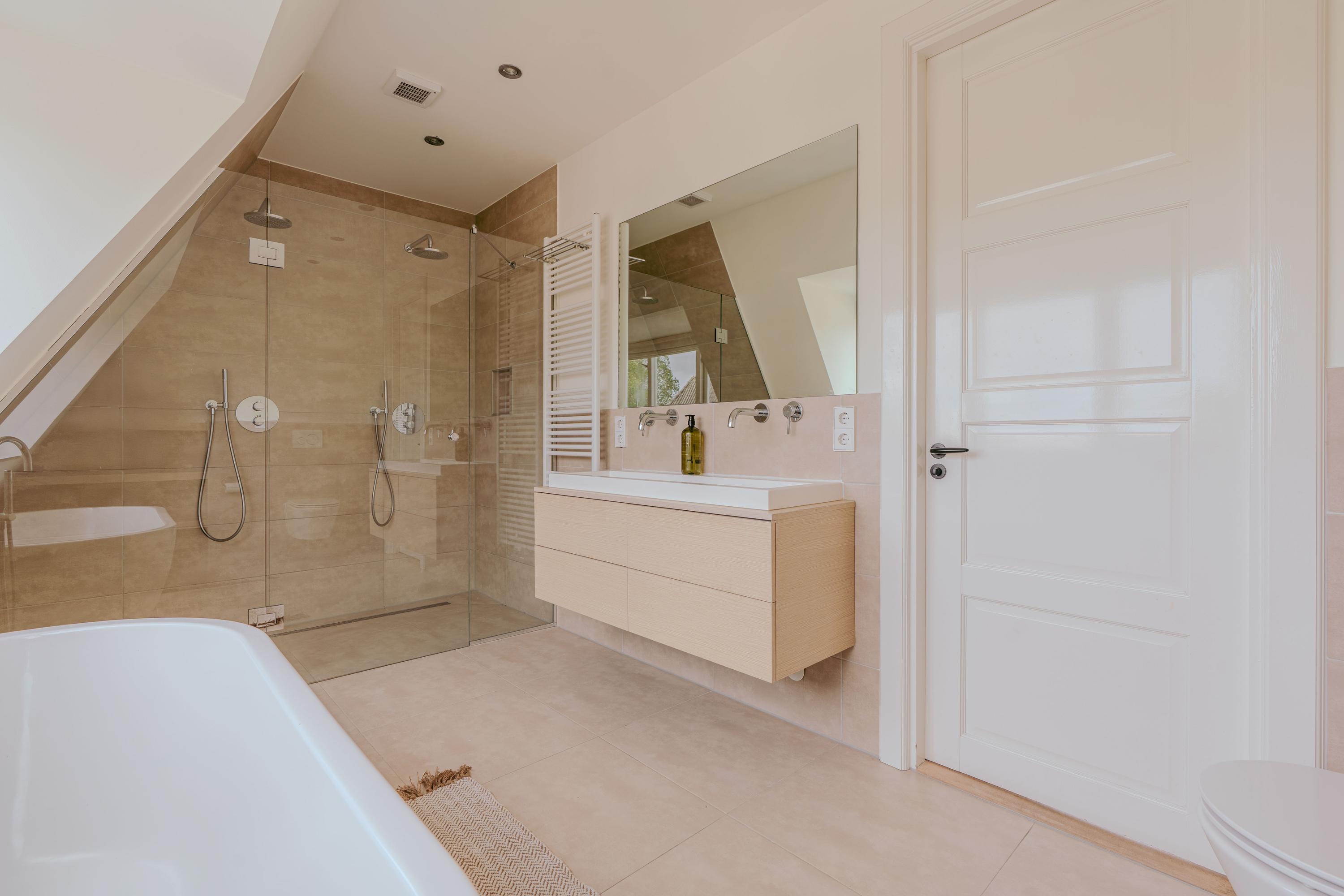 The landing—boasting impressive ceiling height reaching into the roofline, skylights, and clever storage—gives access to all rooms on this level. At the rear is a comfortable bedroom with built-in wardrobes and French doors to a sunny roof terrace. The master bedroom spans the full depth of the building and features air conditioning, custom-made wardrobes, and beautiful original wooden beams that create a warm and inviting atmosphere. Double doors open directly onto the spacious roof terrace—an exceptionally private outdoor area where you can soak up the sun in complete peace. Centrally located on this floor is the stylish bathroom, luxuriously appointed with underfloor heating, a freestanding bathtub, walk-in shower, double washbasin with cabinet, and a second toilet. Large skylights provide plenty of natural light.