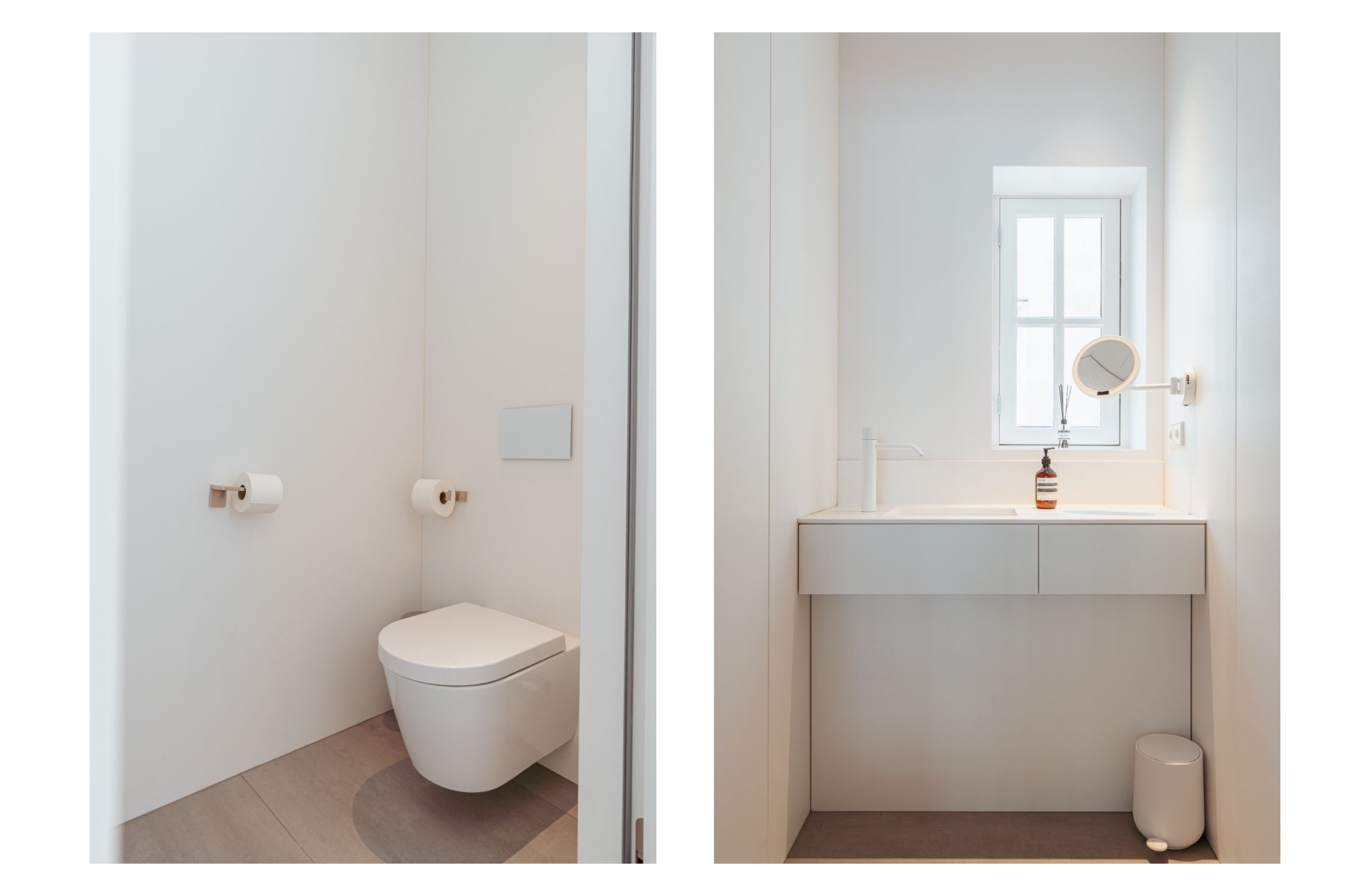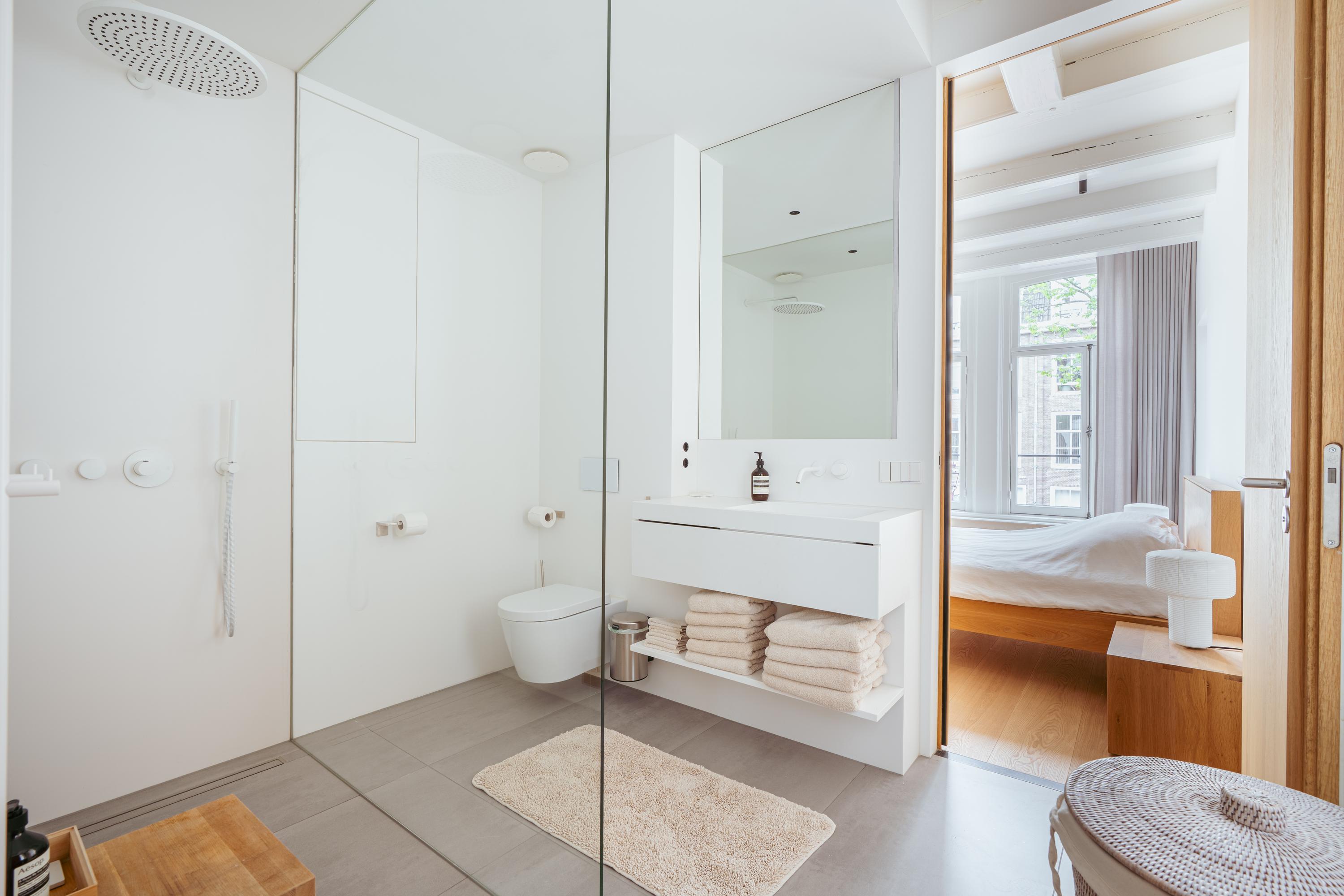 A tidy landing with built-in storage leads to two bedrooms. This floor features a beautiful wooden floor and premium finishes. At the front is a spacious bedroom with a custom-made built-in wardrobe that seamlessly integrates into the design. Large windows flood the space with natural light and offer a stunning view of the canal and historic facades. The second bedroom at the rear also includes built-in wardrobes. Centrally located on this floor is the modern bathroom, complete with a walk-in shower, sleek vanity, and stylish toilet — all finished to a high and timeless standard. Elegant steel-framed doors close off the bedrooms, combining functionality and design in harmony with the home’s aesthetic.