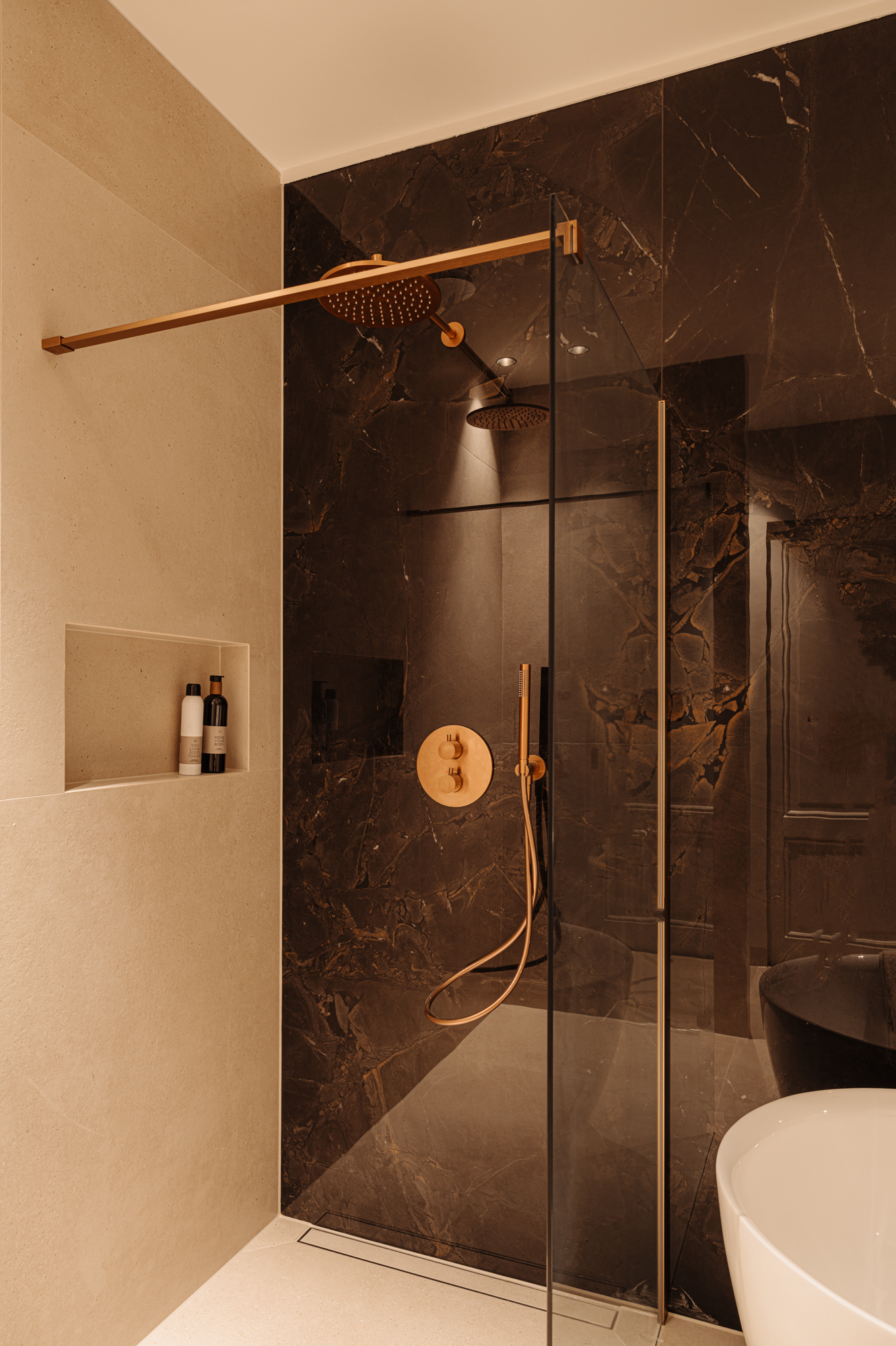 The front door to the apartment opens into a landing that gives access to storage space, a separate guest toilet and all the apartment’s other rooms. There is a large, bright living room (approx. 53 m2) and an open-plan kitchen of Italian design with a cooking island at the front of this floor. The luxury kitchen is equipped with a comprehensive range of built-in appliances and balances style and functionality perfectly. The sophisticated combination of white units with marble worktops and large units with the warm shade of walnut give the space a beautiful, atmospheric feel. A number of double doors open out onto the apartment’s sunny roof terrace.