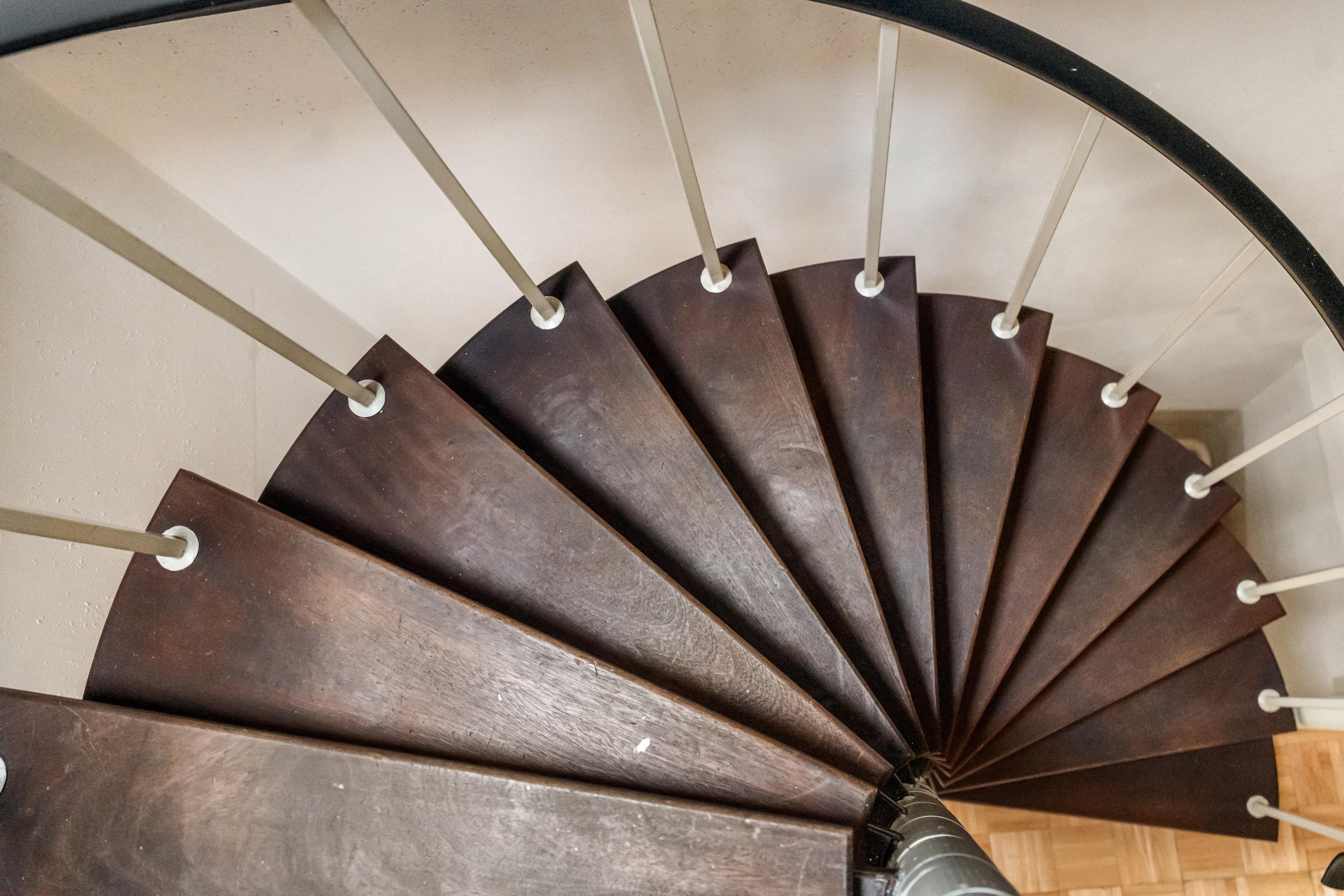 The first floor comprises three well-proportioned bedrooms. The rear bedroom has access to the balcony, overlooking the inner gardens. The centrally located bathroom is fitted with a shower, toilet and washbasin and can be accessed from both the landing and the front bedroom. This space offers good possibilities for modernisation or reconfiguration. From the landing, a fixed spiral staircase leads to the second floor.