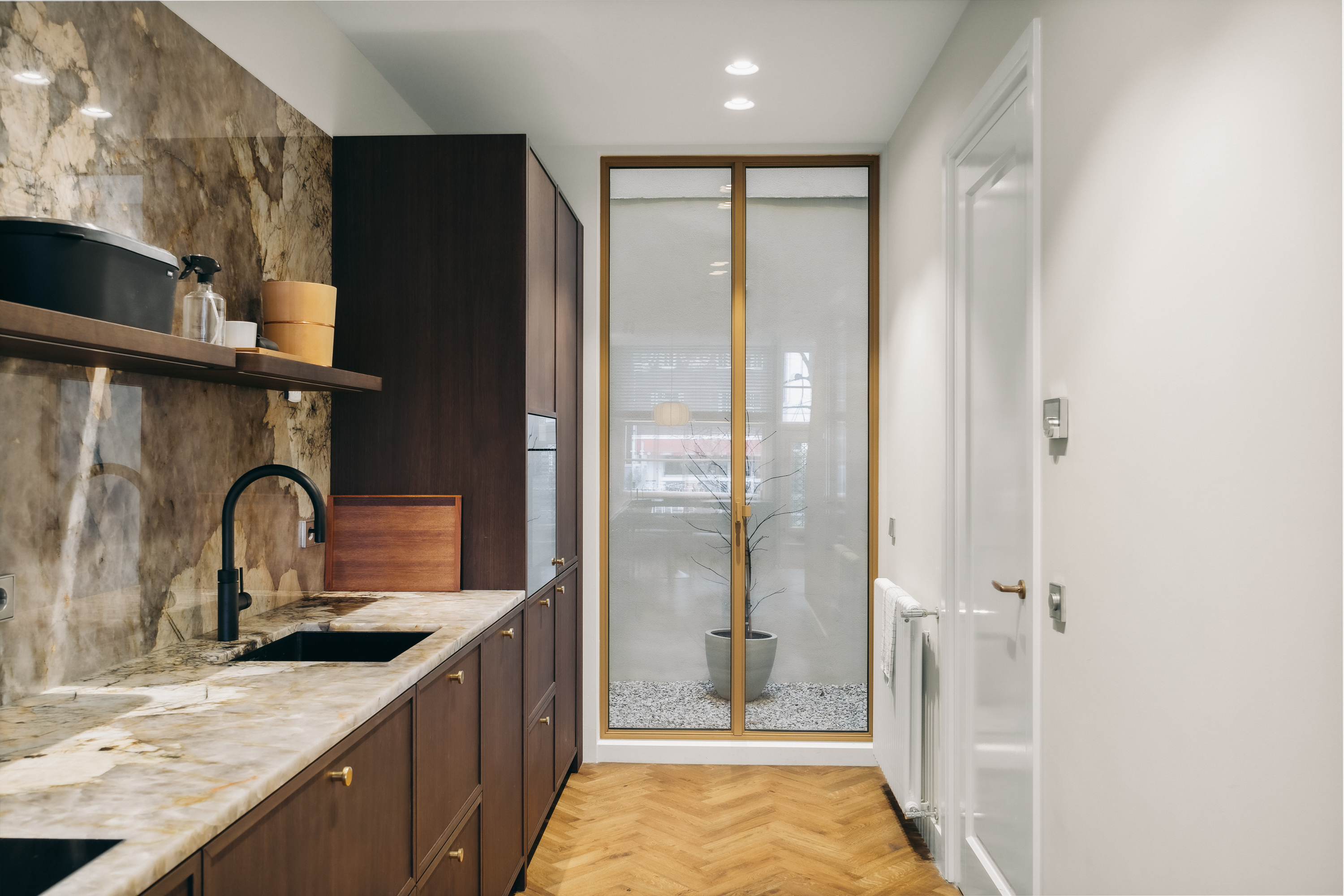 Below, the souterrain offers a tranquil living area with tailored storage in rich wood, alongside a spacious utility room equipped for practical daily needs. Ascending, the first floor presents an elegant salon marked by broad windows and a walnut-veneered wall for display or work. The top floors reveal a spacious bedroom, a bathroom finished in travertine with underfloor heating, and a dedicated dressing room lit by a skylight and cooled by air conditioning.
