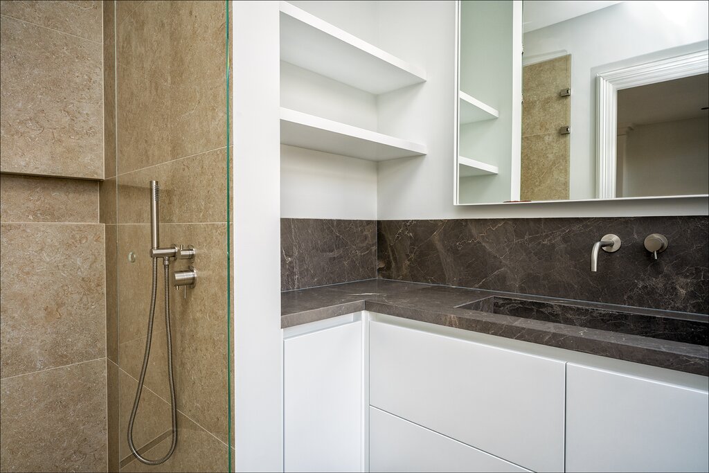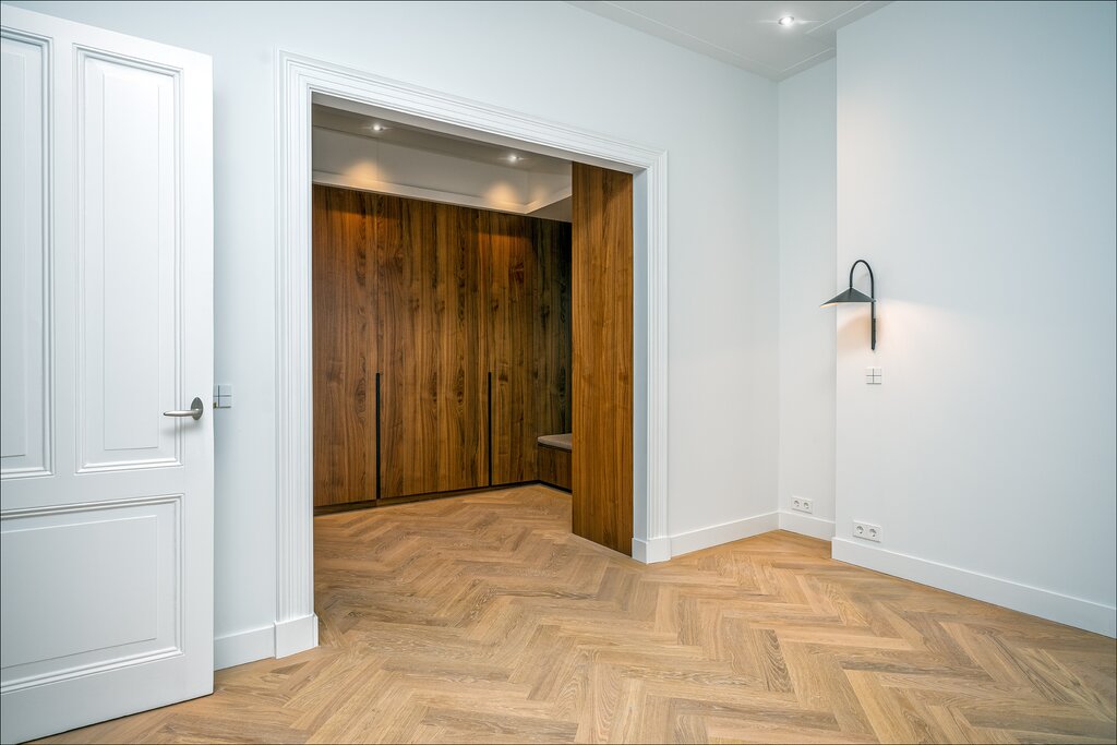 Deze ruime en lichte verdieping heeft ook hier een origineel royaal gedecoreerd plafond. Deze verdieping beschikt over 2 slaapkamers met beide een eigen badkamer