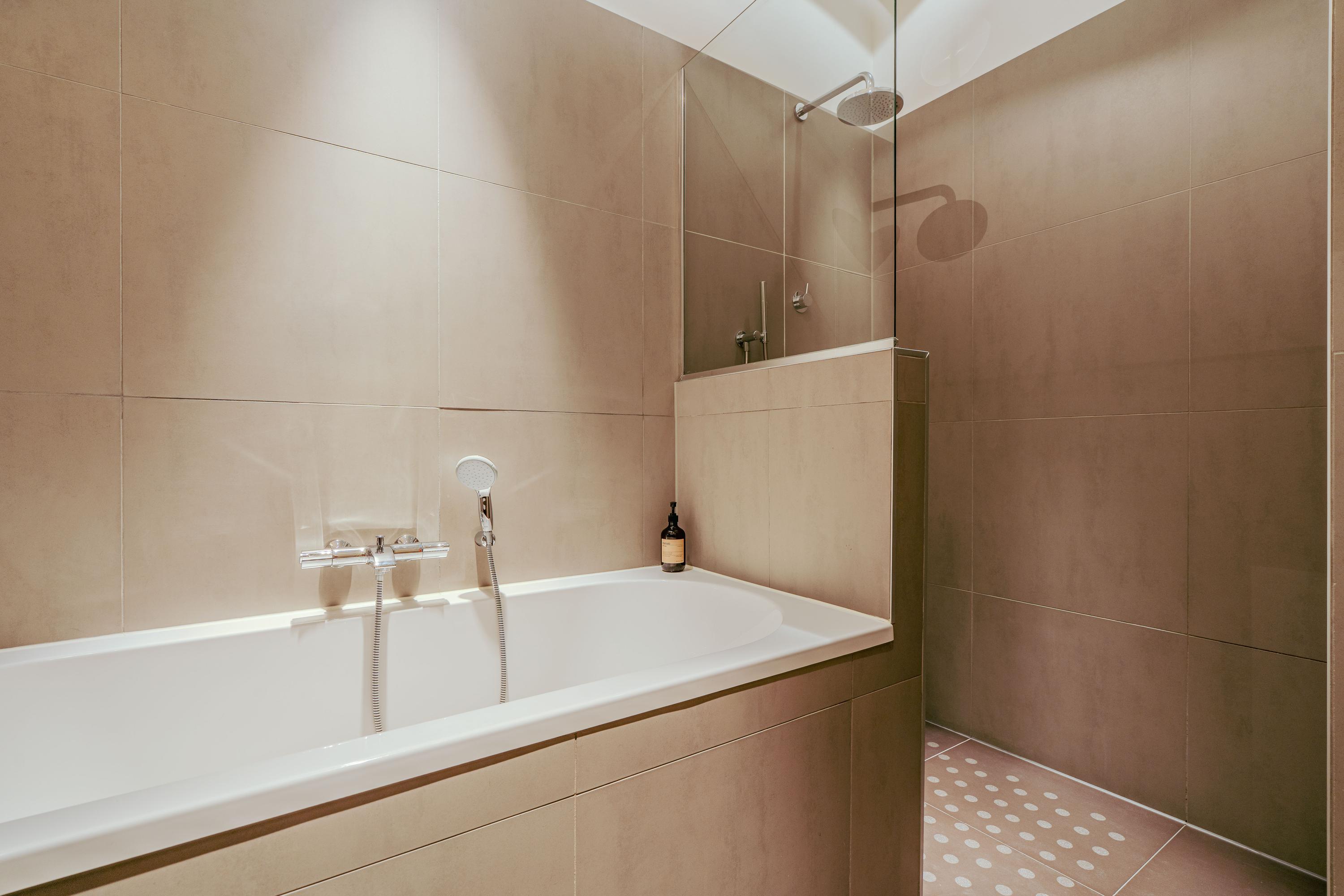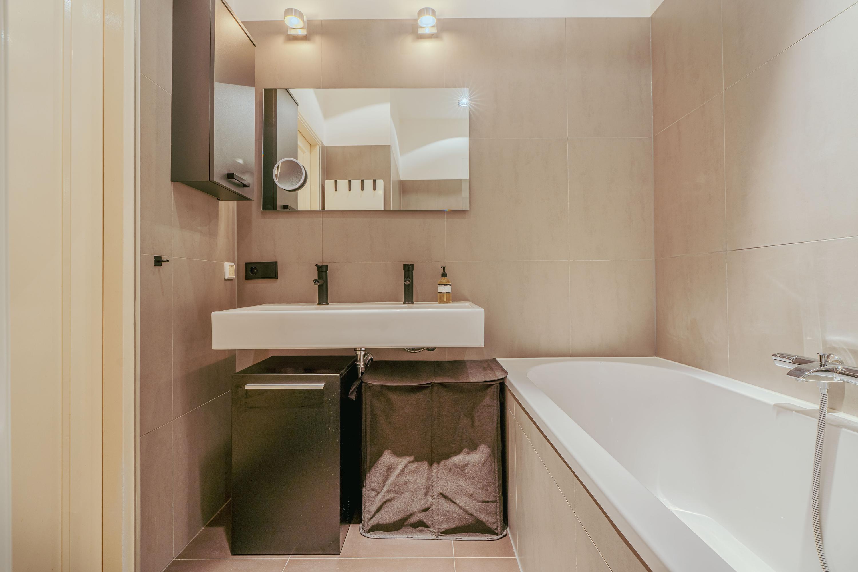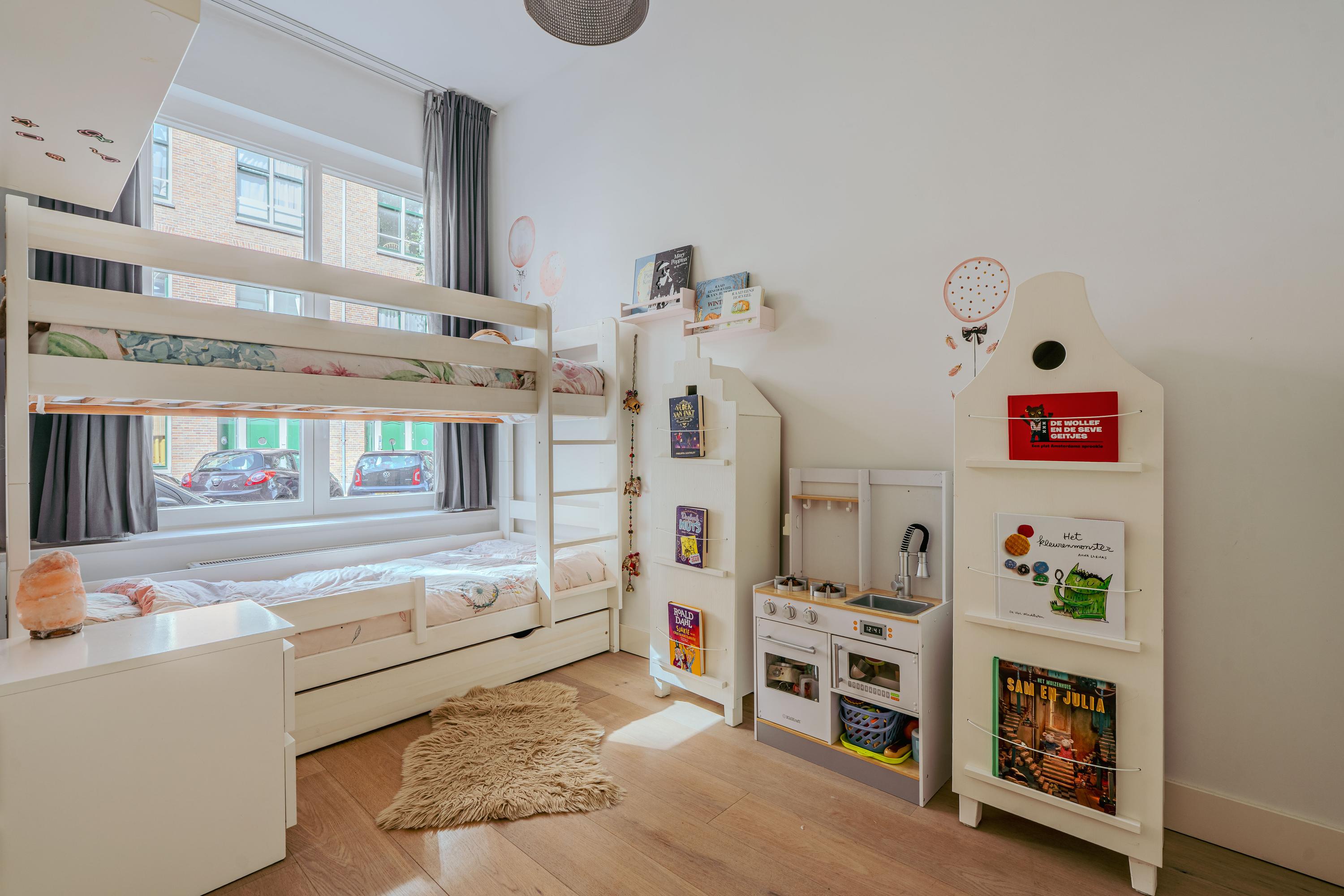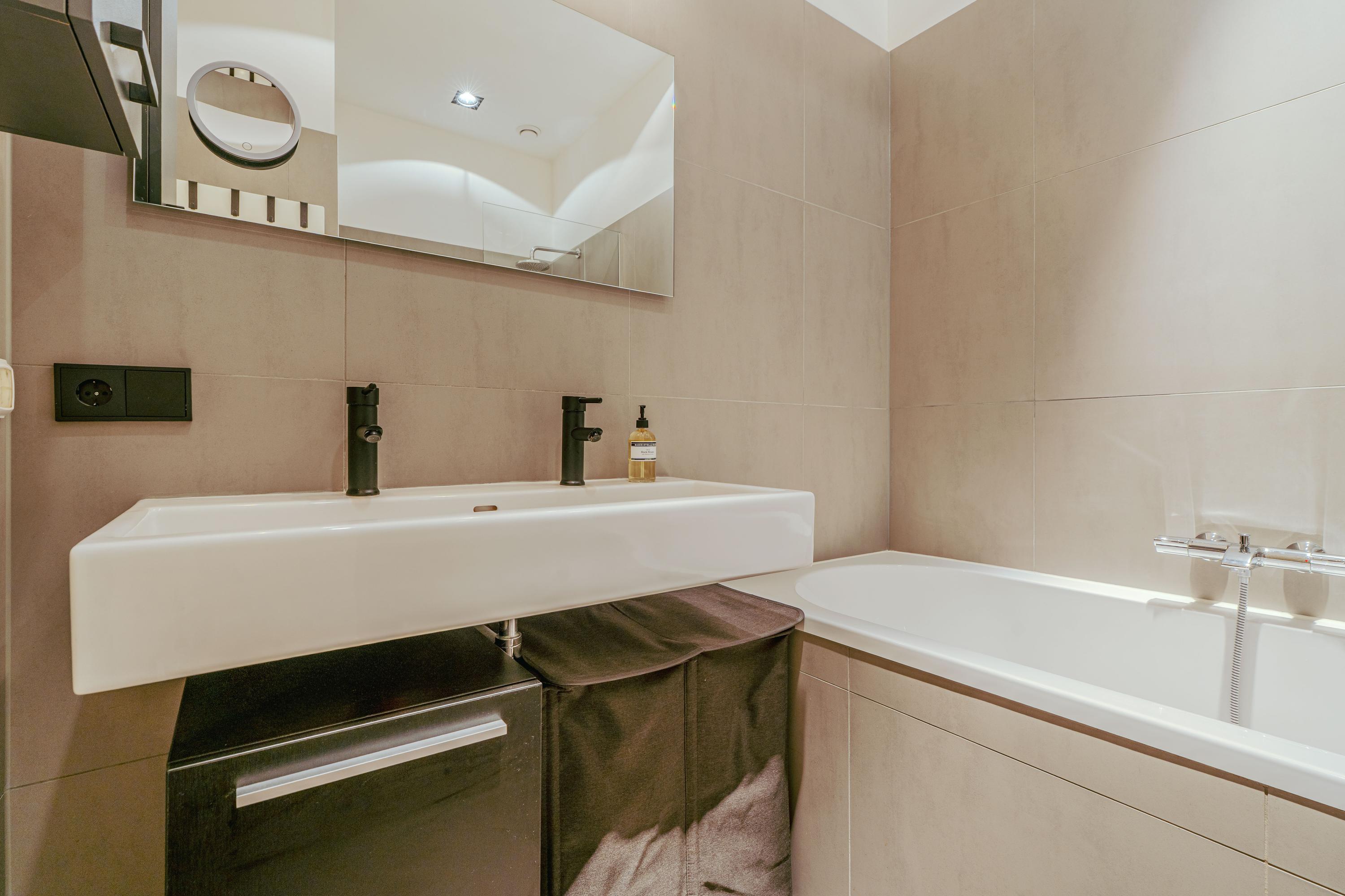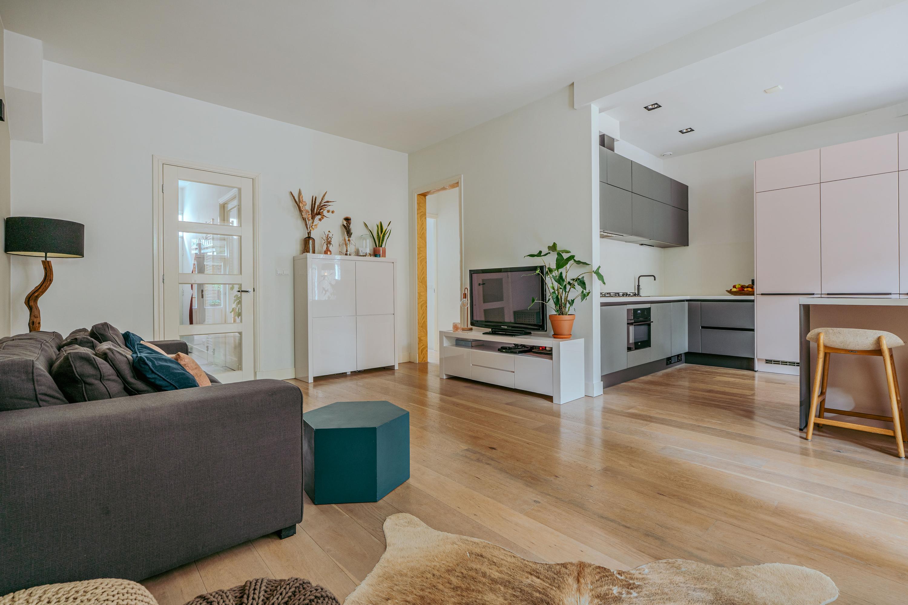 Via de hal bereikt u de ruime en lichte woonkamer, evenals de eerste goed bemeten slaapkamer aan de voorzijde van de woning. In de hal bevinden zich bovendien praktische inbouwkasten voor extra bergruimte. De woonkamer strekt zich uit tot aan de achterzijde van het appartement en profiteert van een prachtige lichtinval, mede dankzij de 2,5 meter diepe uitbouw, de grote raampartijen en de openslaande deuren naar de tuin. Indien gewenst kan hier eenvoudig een derde slaapkamer worden gerealiseerd. De zonnige achtertuin van circa 38 m² is gelegen op het zuiden en biedt uitzonderlijk veel privacy. Bovendien beschikt de tuin over een handige schuur met overkapping, ideaal voor extra opslag of fietsen. De moderne open keuken vormt het hart van de woning en is uitgerust met een 5-pits gasfornuis met afzuigkap, combi-oven, vaatwasser, koel-vriescombinatie, een extra vriezer, een Quooker en tot slot plintverwarming. Tevens beschikt de keuken over een karakteristiek eiland waaraan je gezellig hoog zit. Ook de wasmachine en droger zijn fraai weggewerkt achter een kast. De tweede royale slaapkamer bevindt zich eveneens aan de voorzijde en biedt voldoende ruimte voor een king-size bed en een ruime kastenwand. Centraal in het appartement treft u de stijlvolle badkamer, voorzien van een ligbad, dubbele wastafel met meubel en een inloopdouche. Aangrenzend bevindt zich nog een separaat toilet met fonteintje.