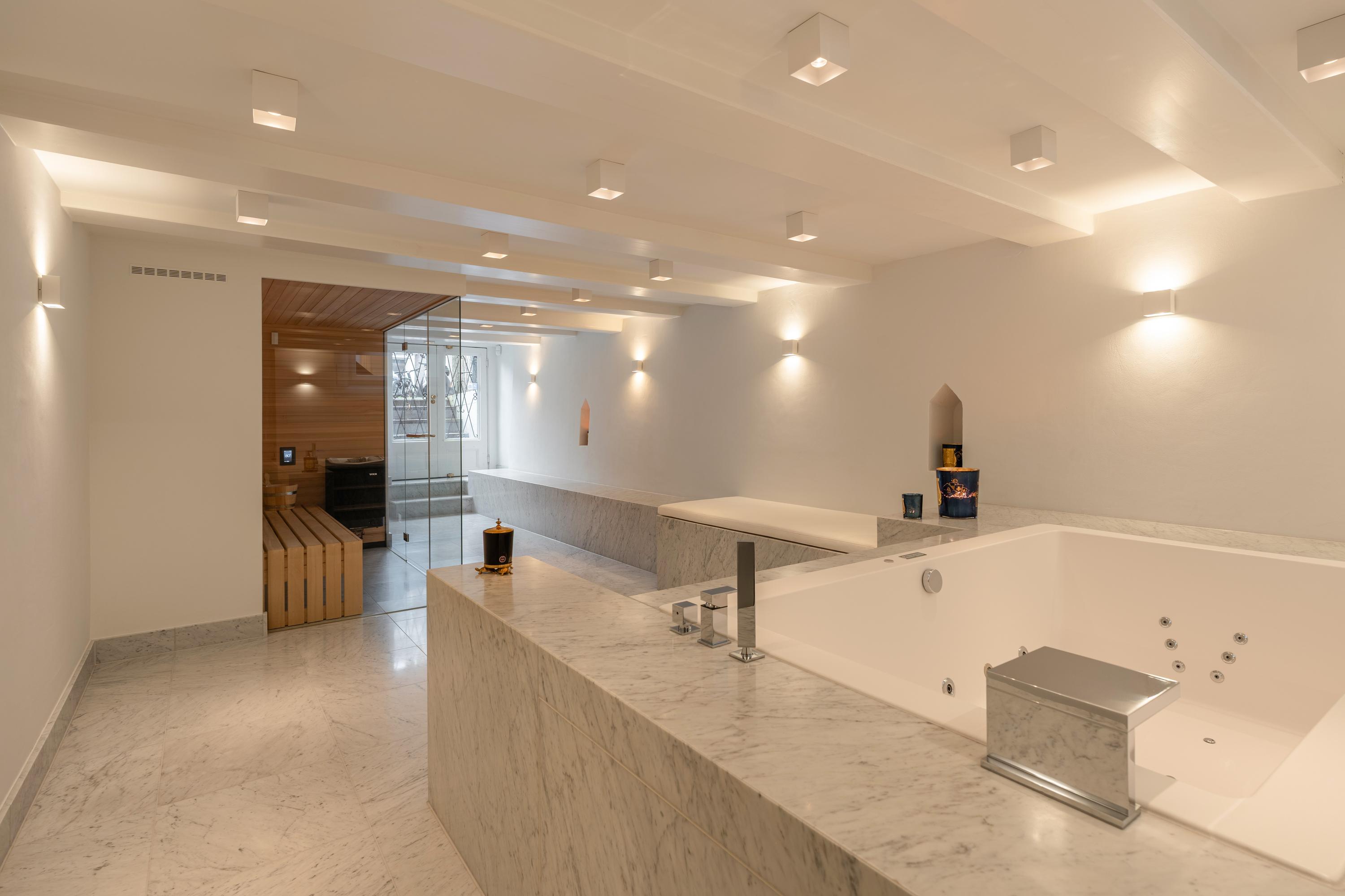 Aan de voorzijde bevindt zich een exclusieve wellnessruimte met jacuzzi en luxe sauna. De combinatie van marmer, hout en zorgvuldig afgestemde verlichting creëert hier een serene, spa-achtige ambiance.