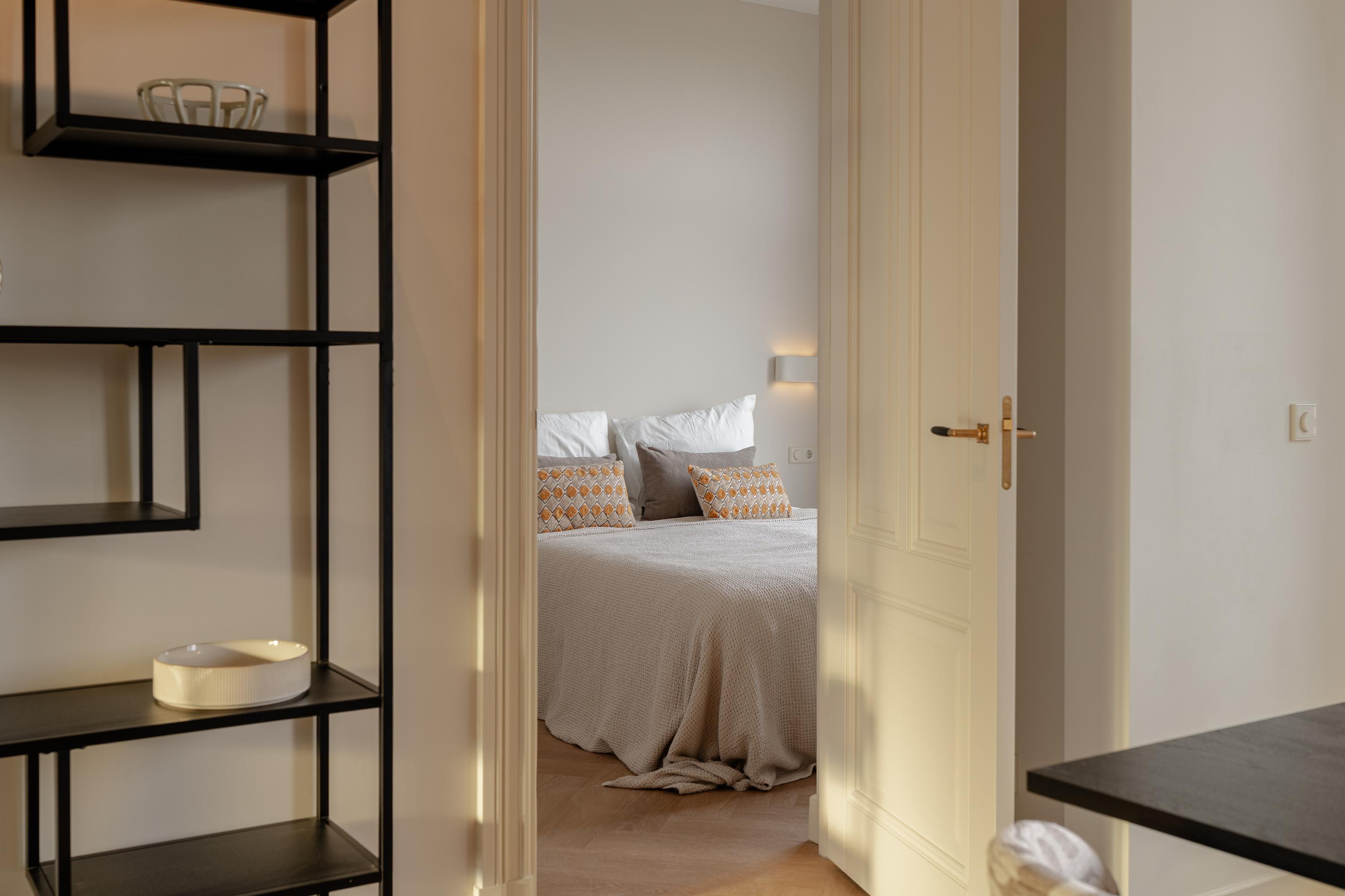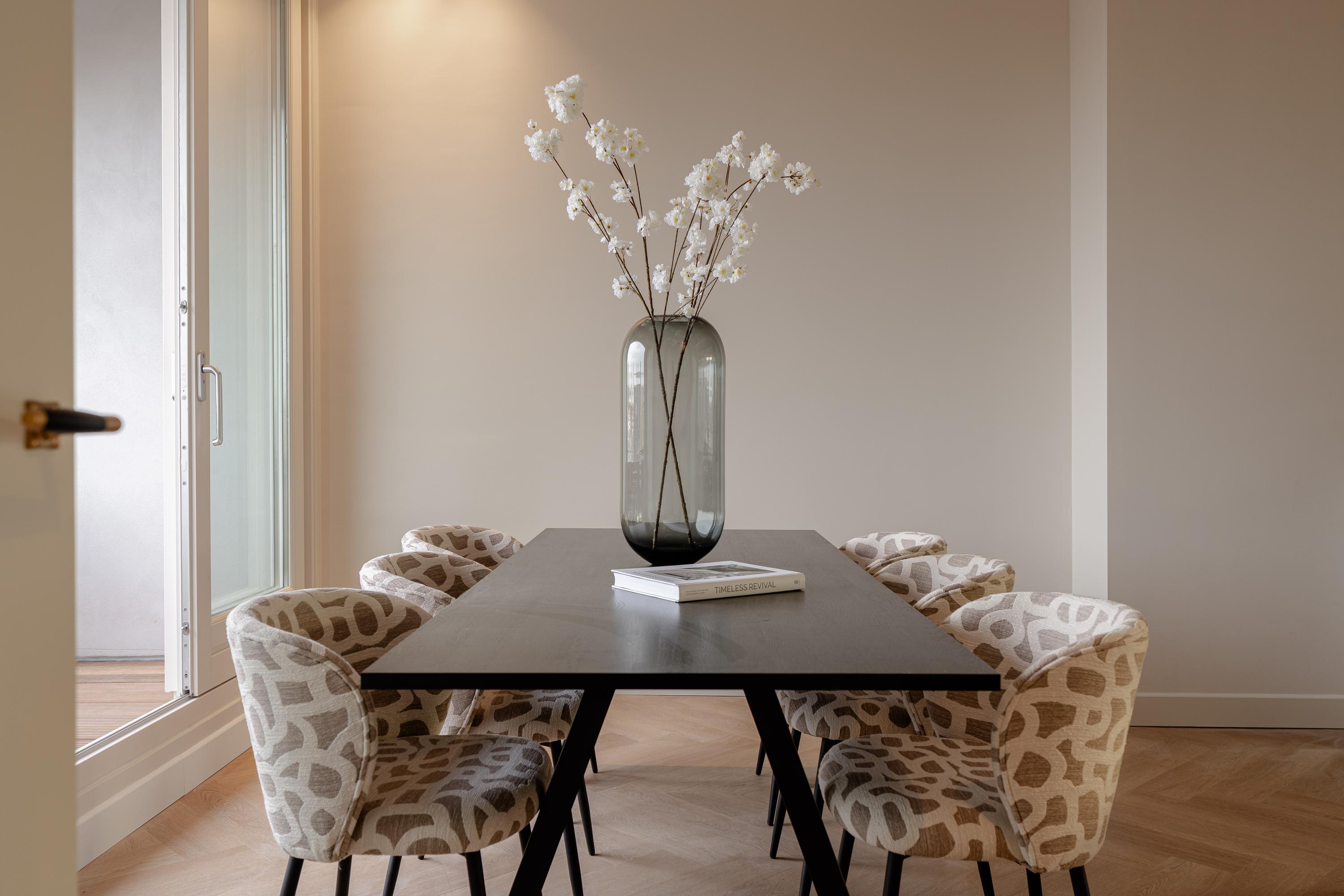 A luxurious and thoughtfully designed apartment with an open living area, high-quality finishes and a quietly situated balcony overlooking greenery.