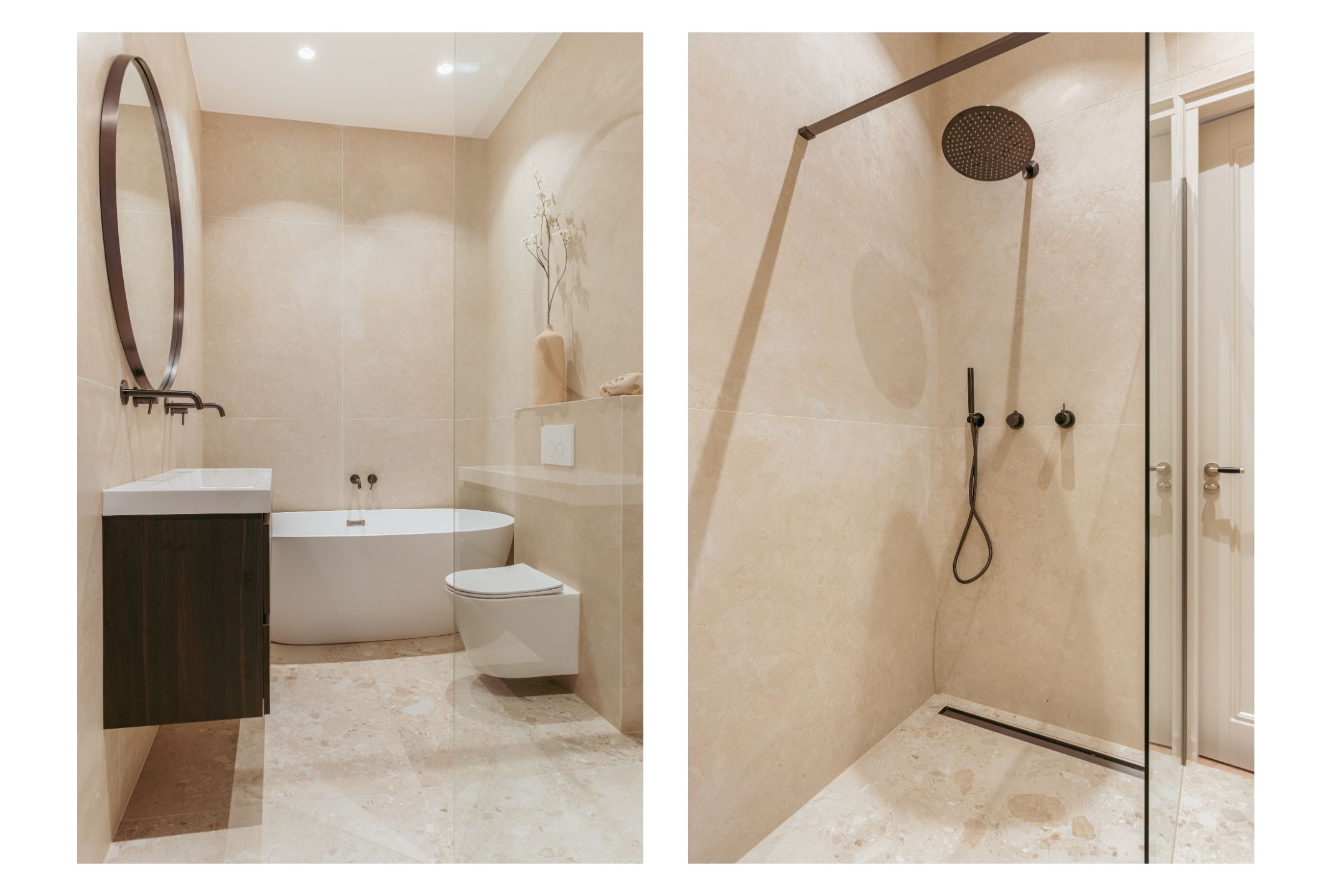 The open-plan kitchen with cooking island and bar forms an elegant whole with the living area and is equipped with all modern conveniences, including a combination oven, dishwasher, fridge-freezer, Quooker and an induction hob with integrated extraction. The island offers space for four to five bar stools, allowing you to cook with pleasure while enjoying views over the greenery and the water. A rare outlook in the city.