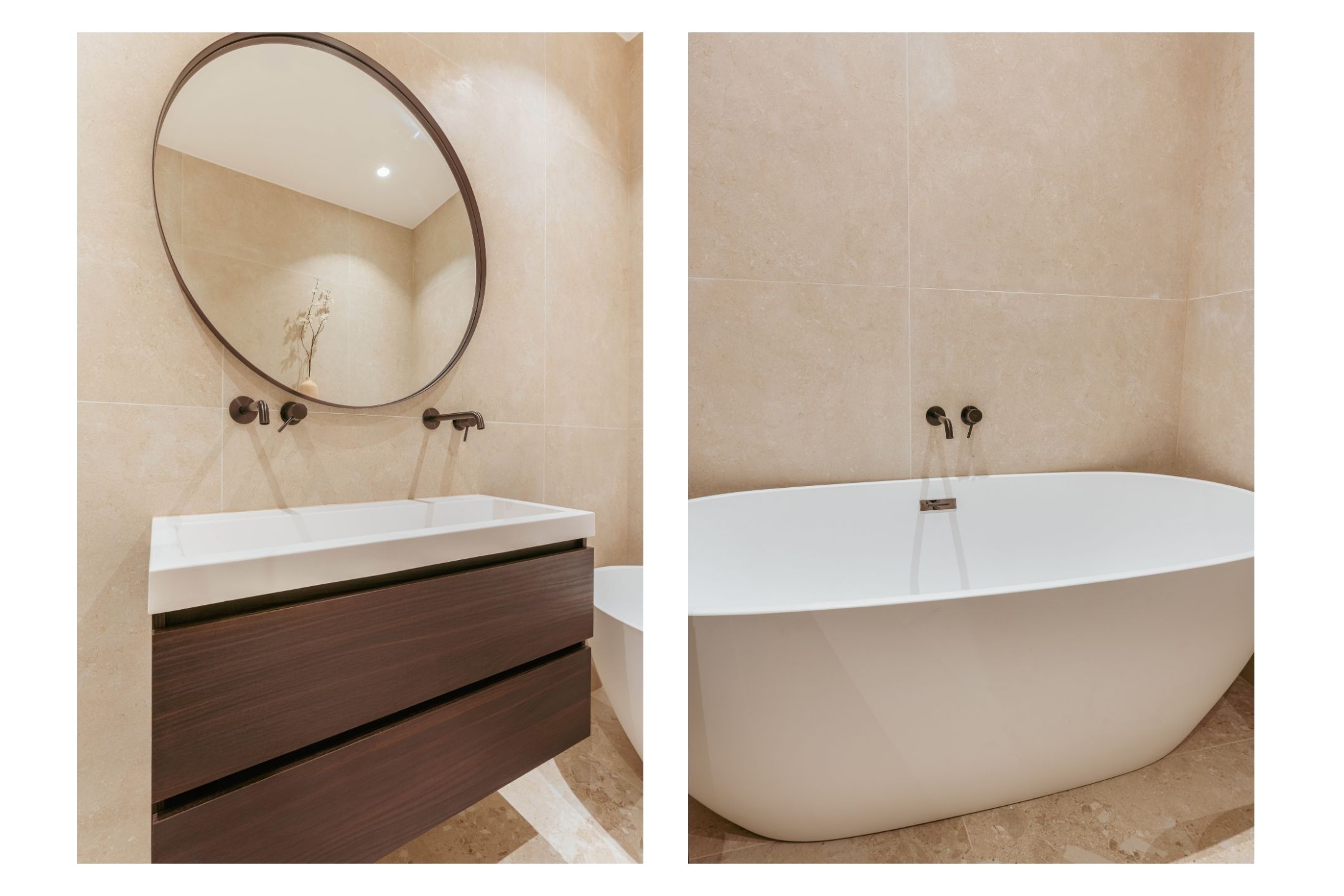 The master bedroom is located at the front of the apartment and is generously proportioned. This bedroom adjoins a second (bed)room, which also lends itself perfectly as a walk-in wardrobe or home office. The centrally located bathroom, where the high ceilings continue beautifully, is modern in design and fitted with a bathtub, walk-in shower and double washbasin with vanity unit. The third bedroom is quietly situated at the rear and again offers a stunning view over the large pond. With its three bedrooms, this apartment is ideal for families; if you are living as a couple, the additional rooms are perfect as workspaces. Throughout the apartment lies an oak herringbone floor, adding warmth and elegance.