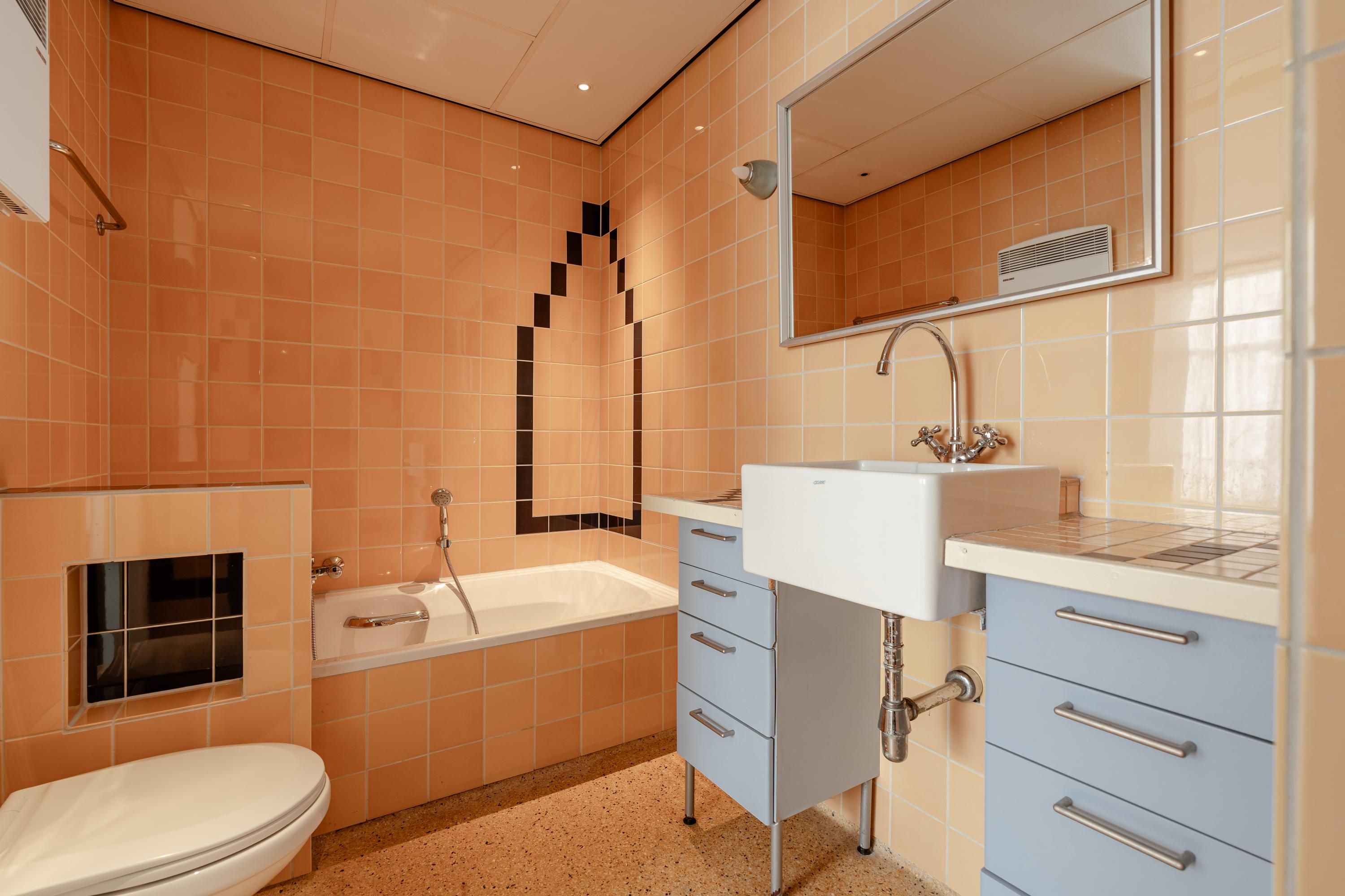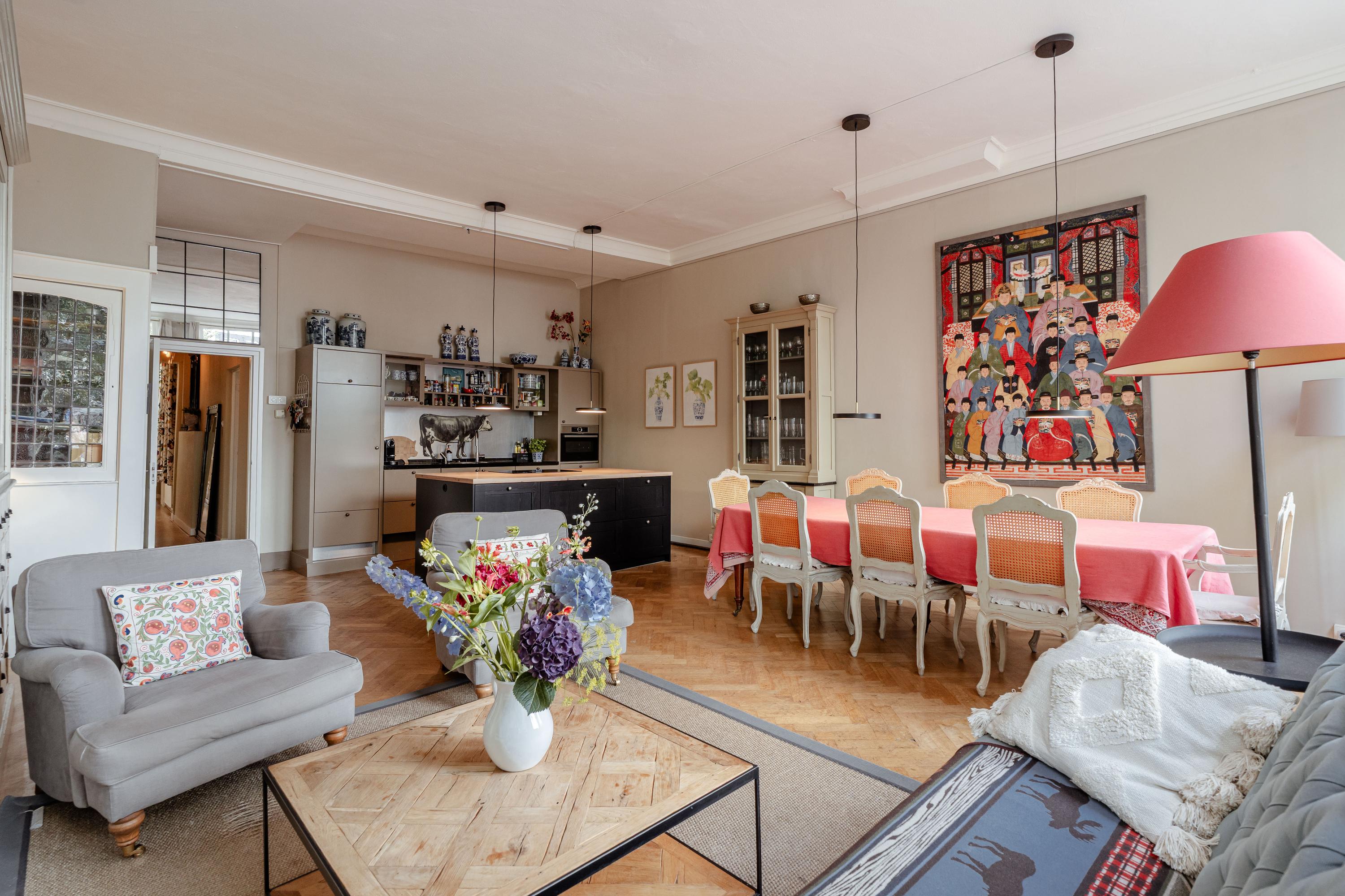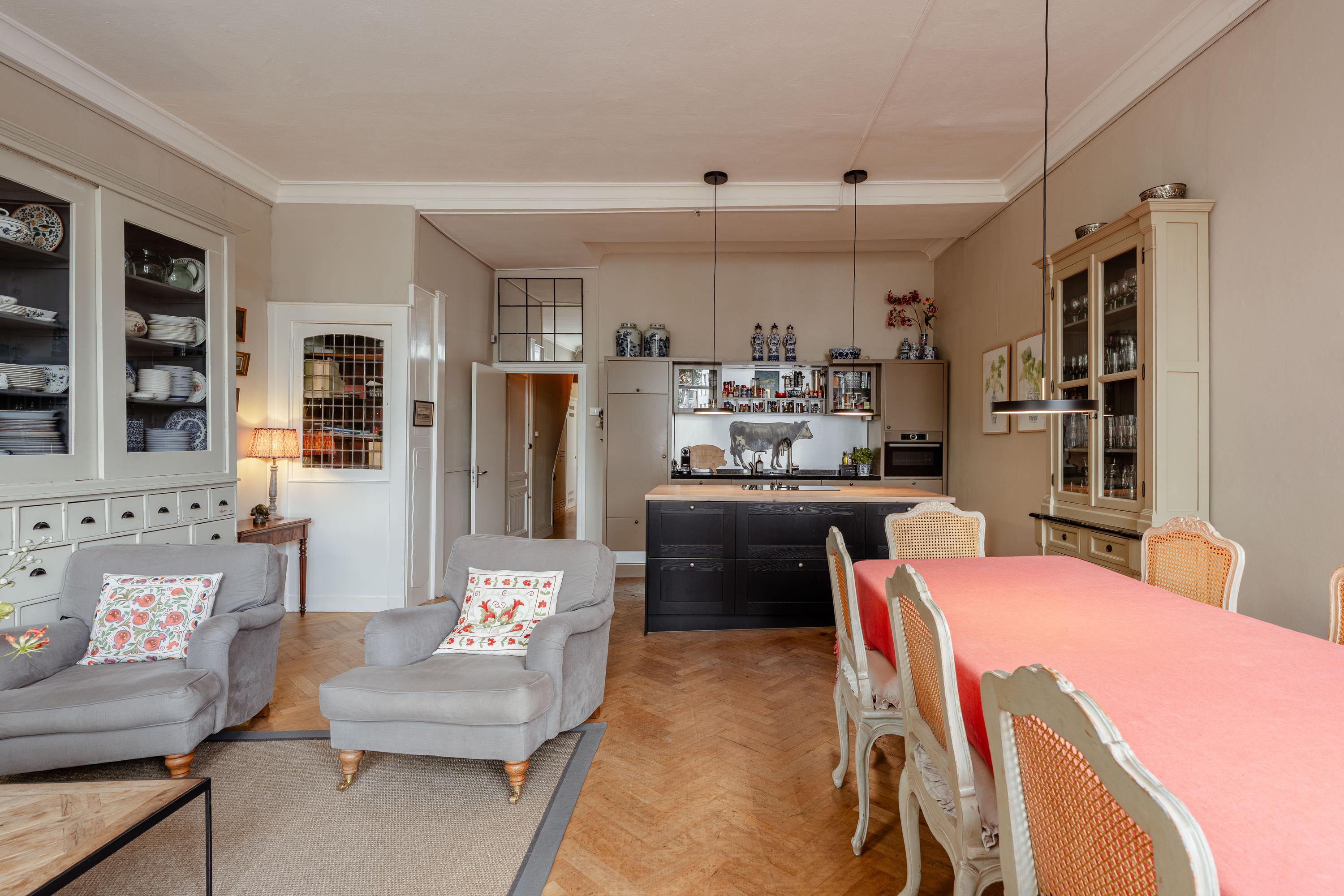 At the front is the spacious living room with high ceilings and large windows, flooding the room with natural light and offering beautiful views over the canal. The living room has ample space for both a seating and dining area and, together with the adjoining open kitchen, forms the heart of the home. The kitchen features a central cooking island and various built-in appliances, ideal for extensive cooking and entertaining.