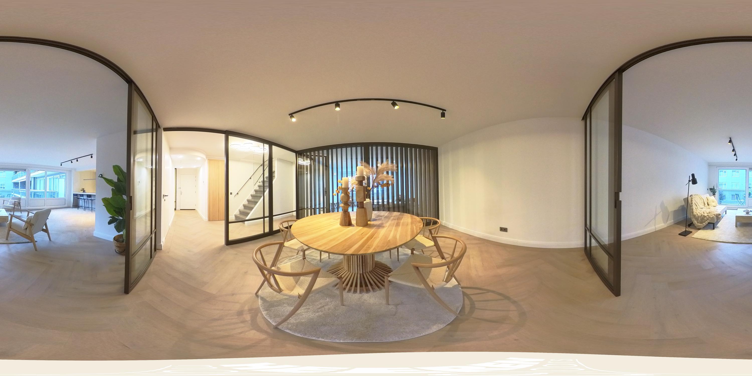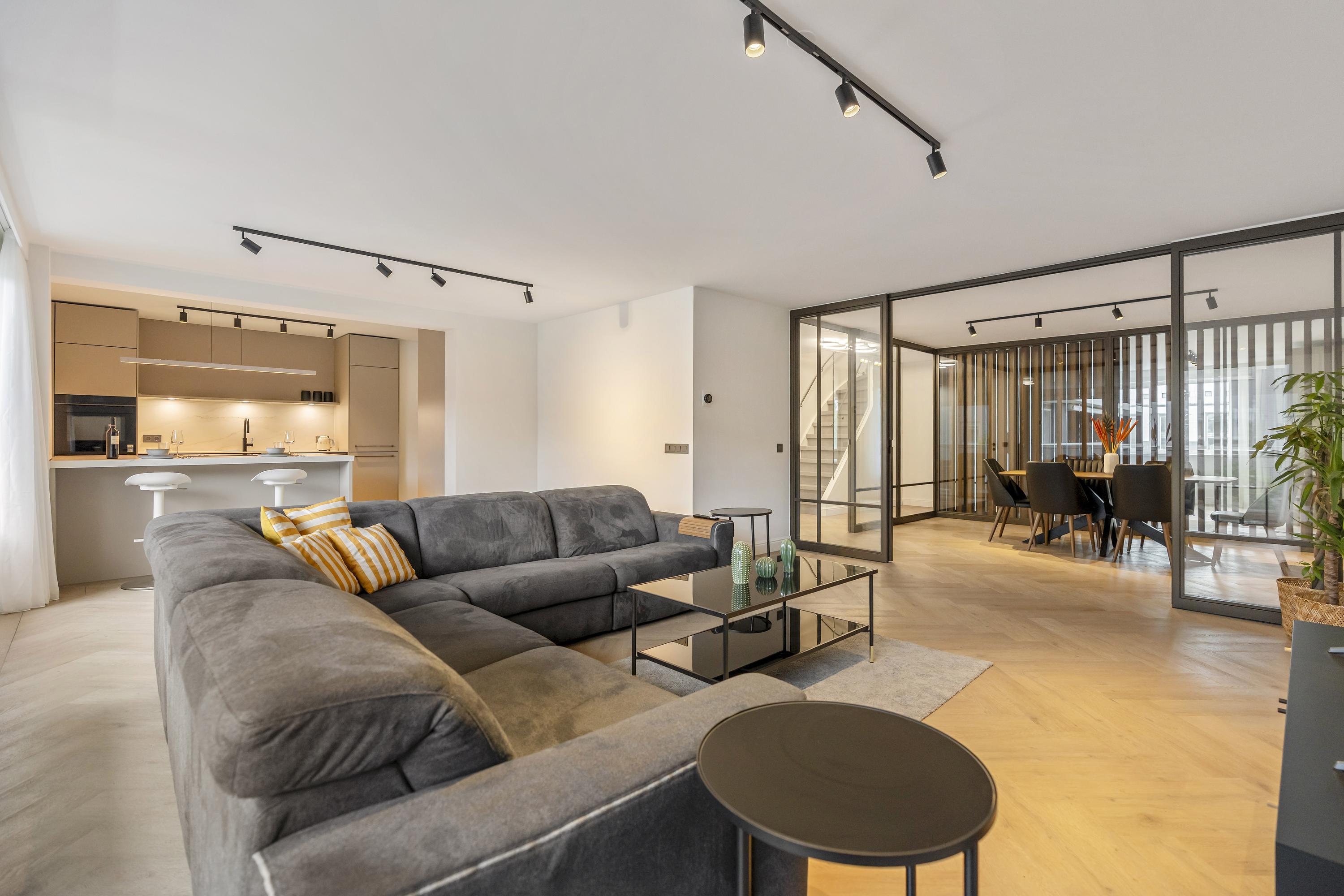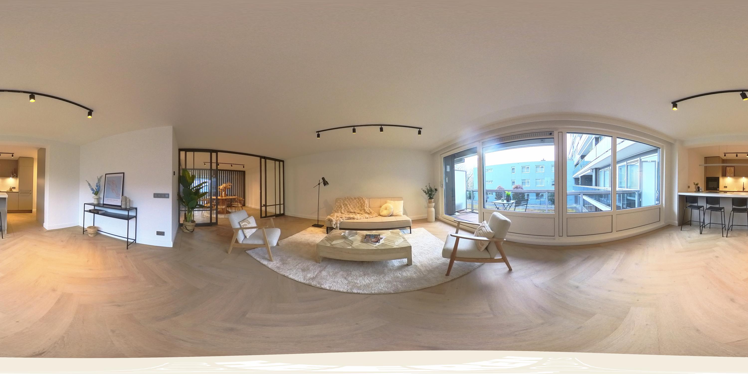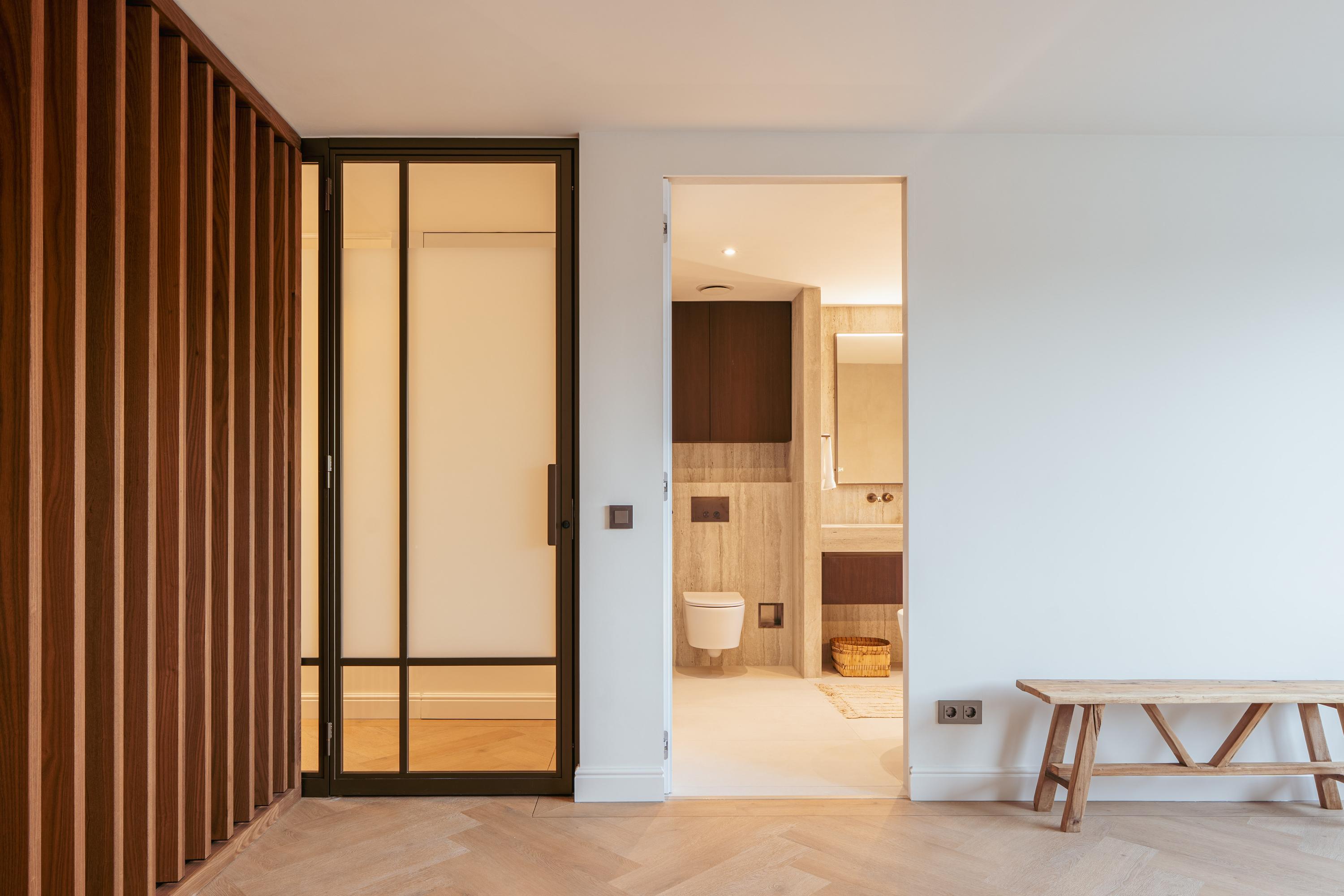 Upon entering, you are welcomed by a spacious hallway. On the right, built-in closets with washer and dryer connections lead directly to the open kitchen. The kitchen features an elegant cooking island with an induction cooktop, a dishwasher, a combination oven, a fridge-freezer, a climate cabinet, and a Quooker. The built-in lighting enhances the ambiance, making the kitchen a true centerpiece of the apartment. The open living area grants access to the generous southwest-facing sun terrace (approx. 8 m²). Floor-to-ceiling windows and sliding doors flood the living and dining areas with natural light, which extends through the steel-framed glass doors into the rear bedroom. This master bedroom, measuring nearly 22 m², accommodates a king-size bed and offers unobstructed views of the Singelgracht canal. The master bedroom includes a modern en-suite bathroom, featuring a freestanding bathtub, a walk-in shower with frosted glass, a custom double vanity unit, and a toilet. This bathroom is also accessible from the central hallway, which houses a tall built-in wardrobe and the staircase leading to the second floor.