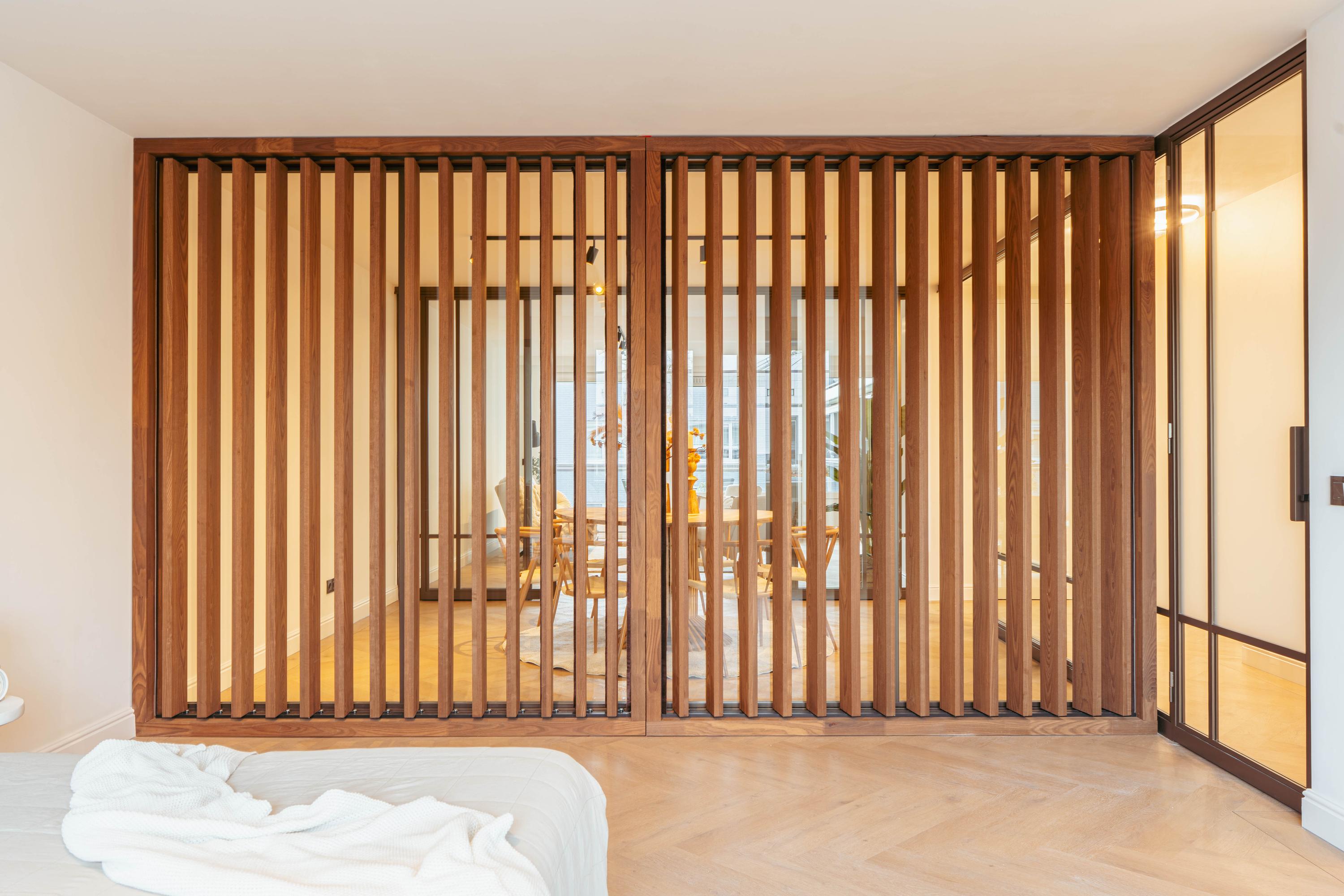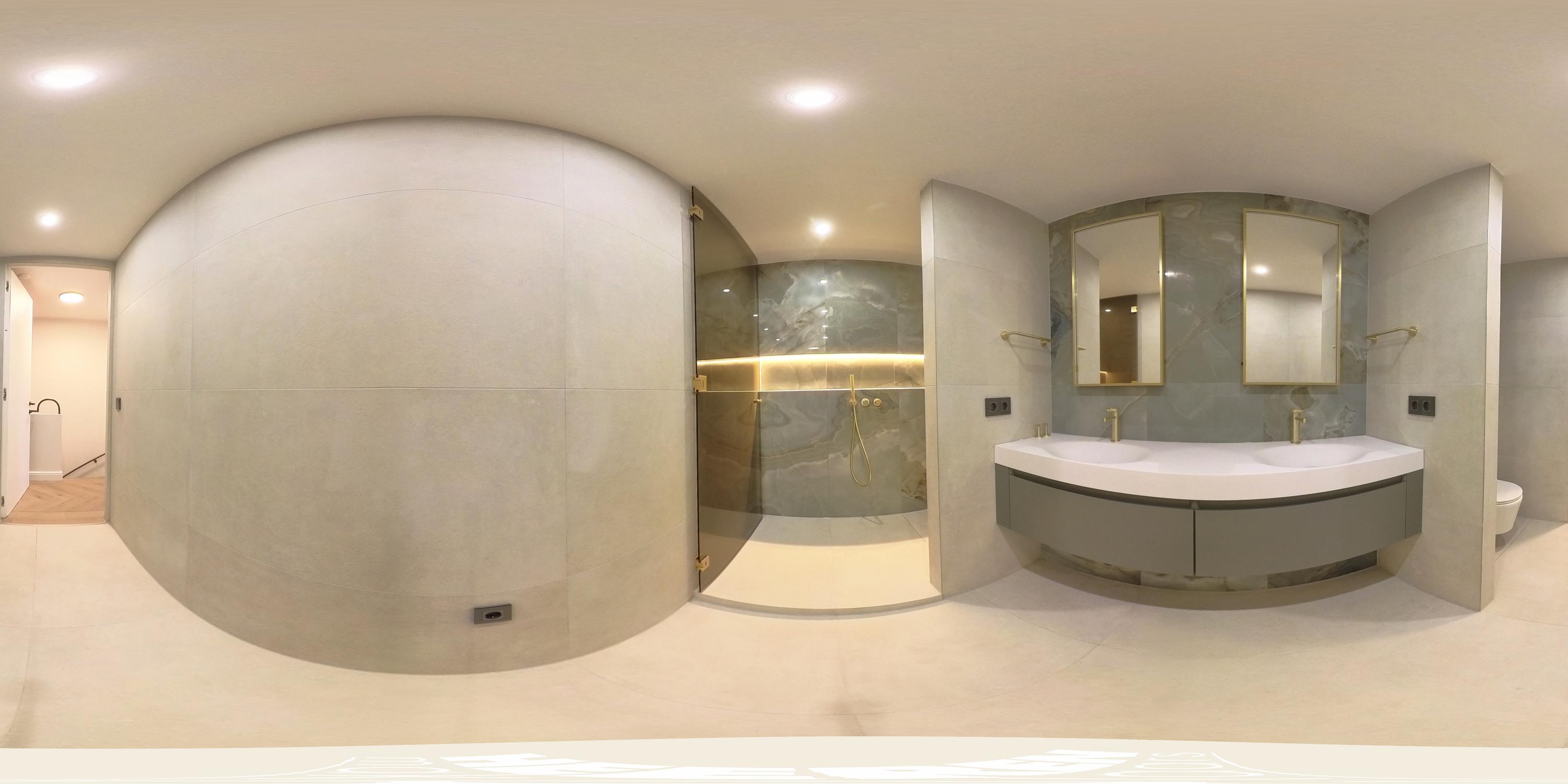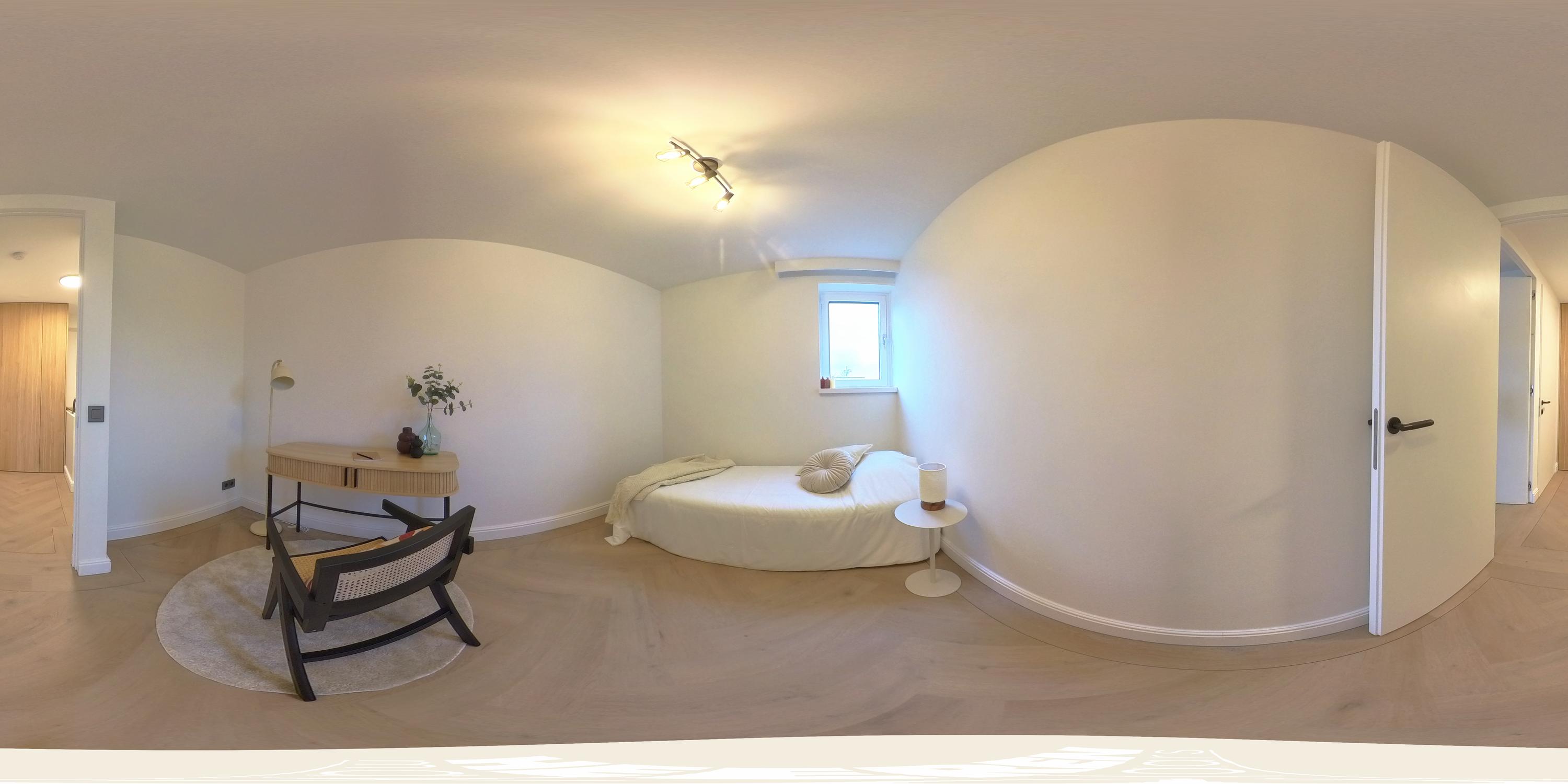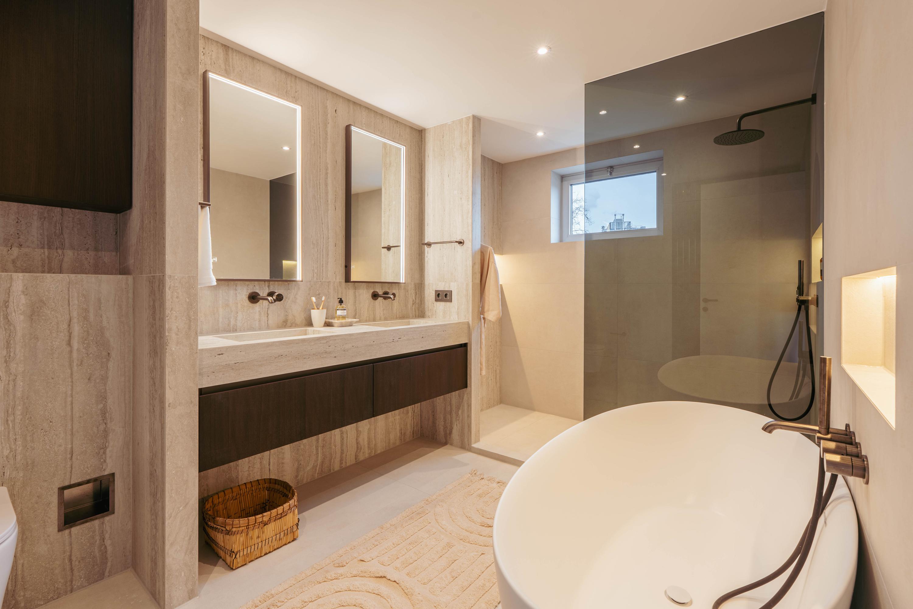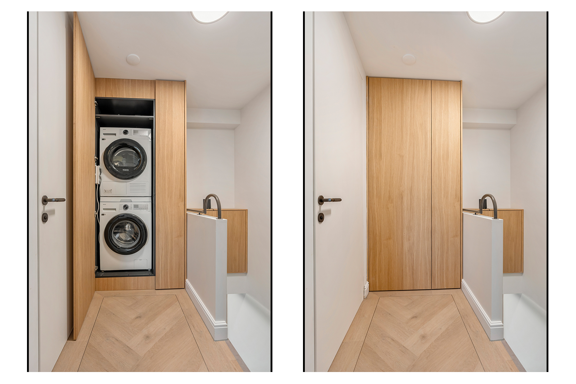 Upon entering, you are welcomed by a spacious hallway. On the right, built-in closets with washer and dryer connections lead directly to the open kitchen. The kitchen features an elegant cooking island with an induction cooktop, a dishwasher, a combination oven, a fridge-freezer, a climate cabinet, and a Quooker. The built-in lighting enhances the ambiance, making the kitchen a true centerpiece of the apartment. The open living area grants access to the generous southwest-facing sun terrace (approx. 8 m²). Floor-to-ceiling windows and sliding doors flood the living and dining areas with natural light, which extends through the steel-framed glass doors into the rear bedroom. This master bedroom, measuring nearly 22 m², accommodates a king-size bed and offers unobstructed views of the Singelgracht canal. The master bedroom includes a modern en-suite bathroom, featuring a freestanding bathtub, a walk-in shower with frosted glass, a custom double vanity unit, and a toilet. This bathroom is also accessible from the central hallway, which houses a tall built-in wardrobe and the staircase leading to the second floor.