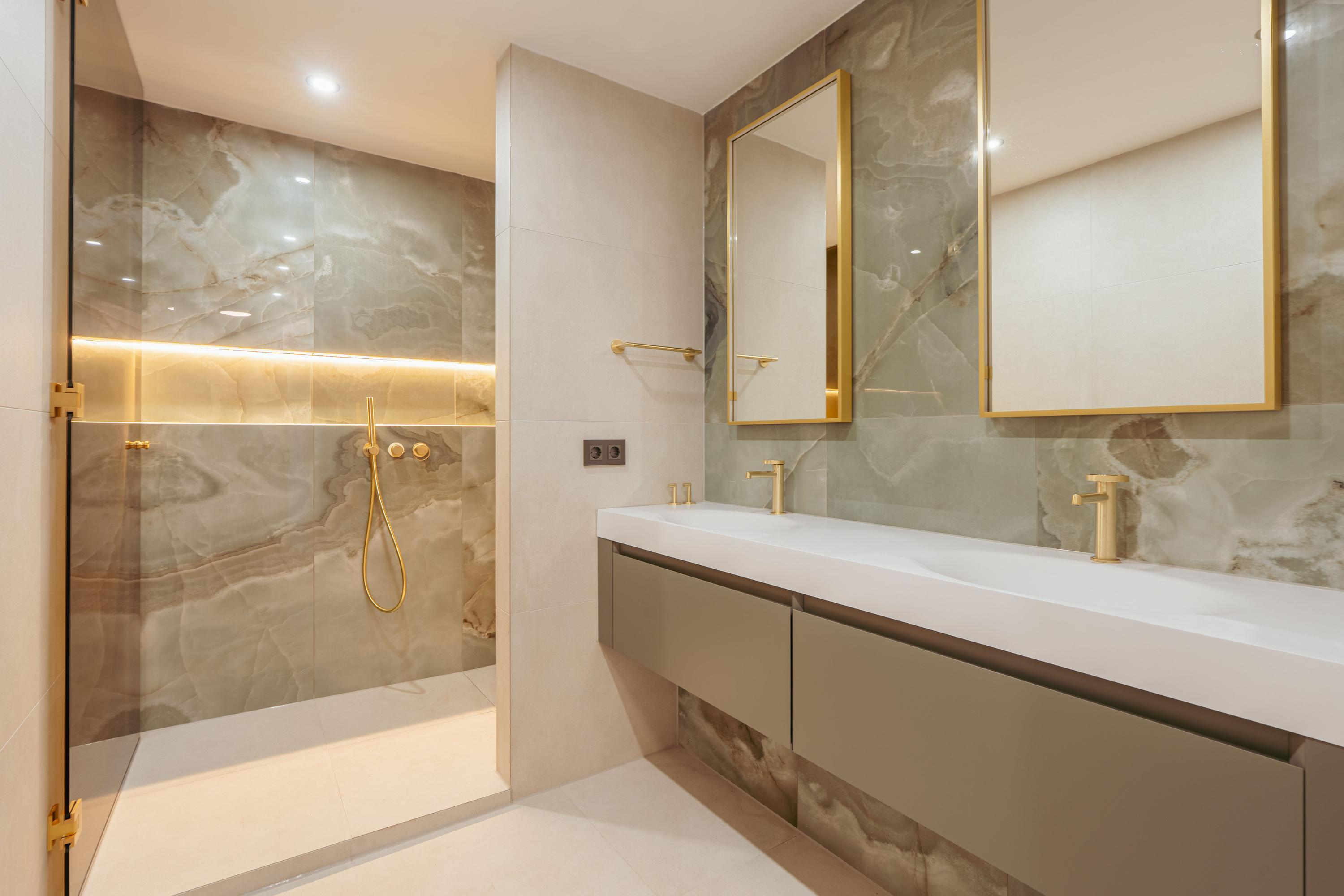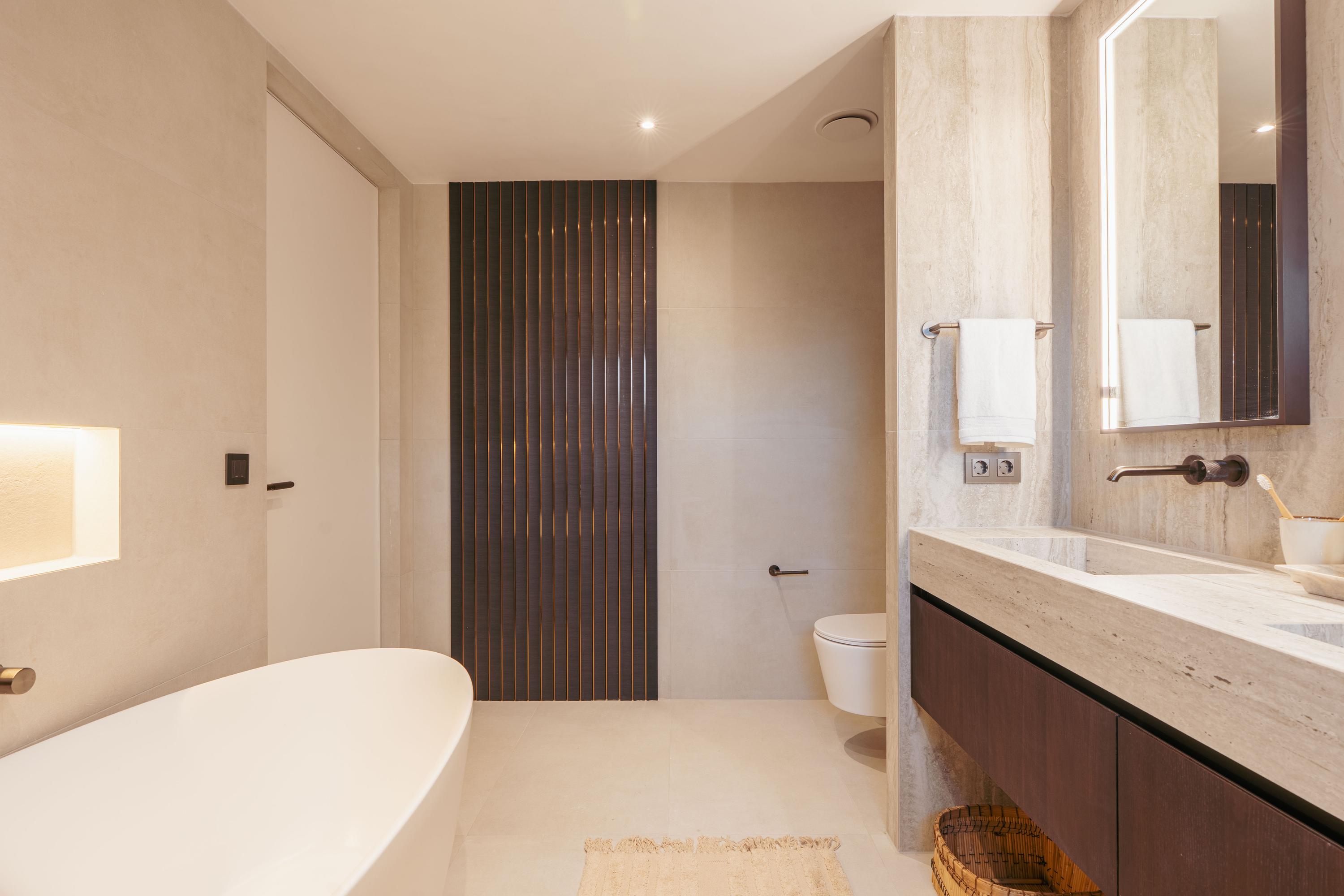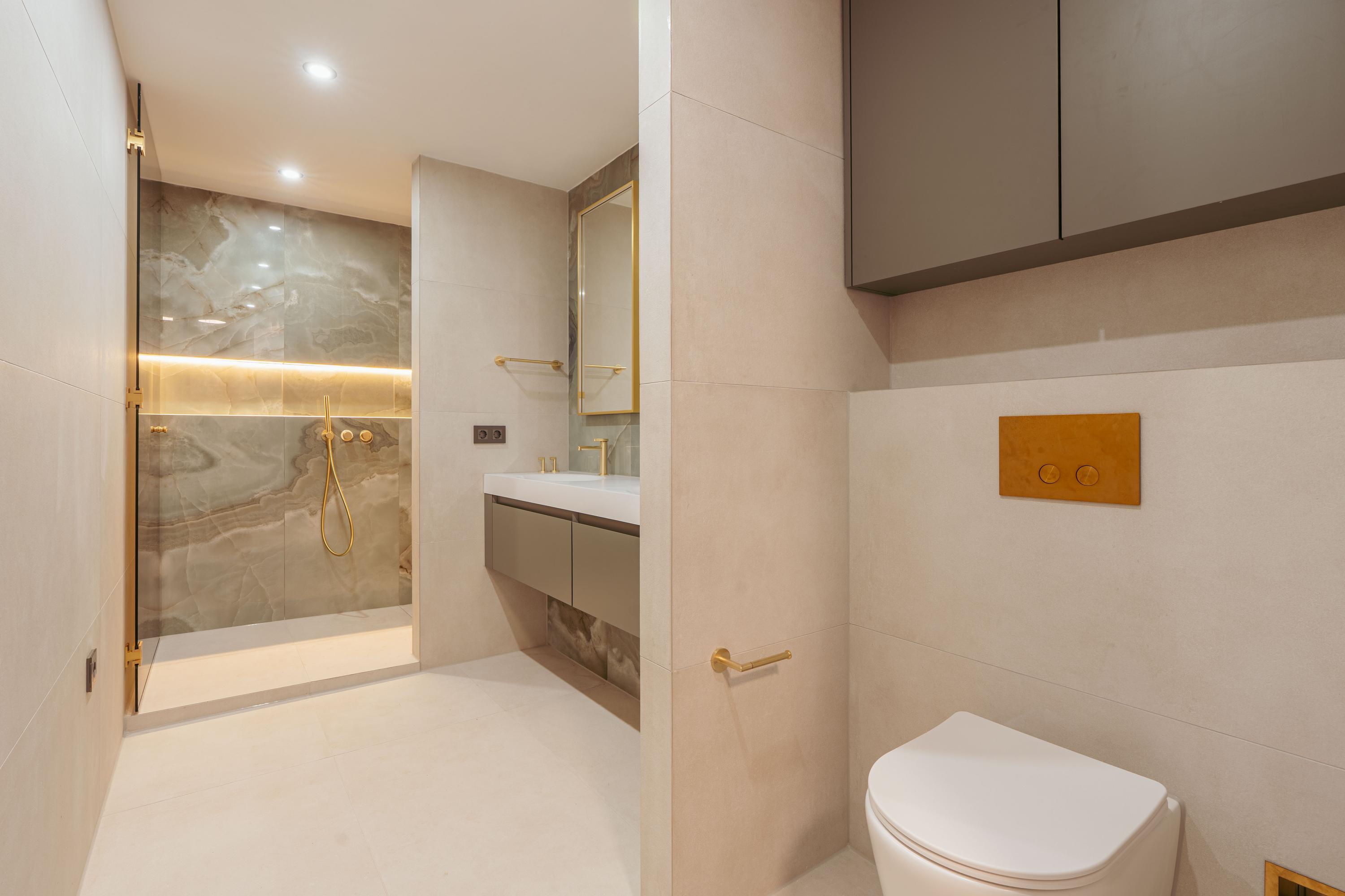 On the second floor of this turn-key apartment, a spacious landing provides access to two well-proportioned bedrooms, both benefiting from elegant lighting and refined window placements. The second-floor bathroom includes a walk-in shower, a double vanity unit, and a toilet. Additionally, a built-in closet on the landing provides convenient storage space for washing & drying machines.