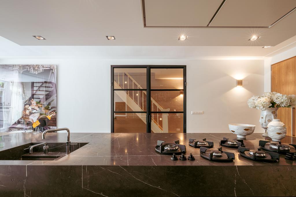 To the front is a bedroom with an en-suite bathroom featuring a washbasin and walk-in shower—currently used as a home gym, but easily repurposed. At the rear is the stunning open-plan kitchen, the centerpiece of this level. Outfitted with Gaggenau appliances, including a fridge, freezer, Quooker, five-burner gas stove integrated into the counter, oven, steam oven, dishwasher, and wine fridge, the kitchen combines luxury and functionality. A solid natural stone countertop with a wooden breakfast bar provides a warm, refined look.