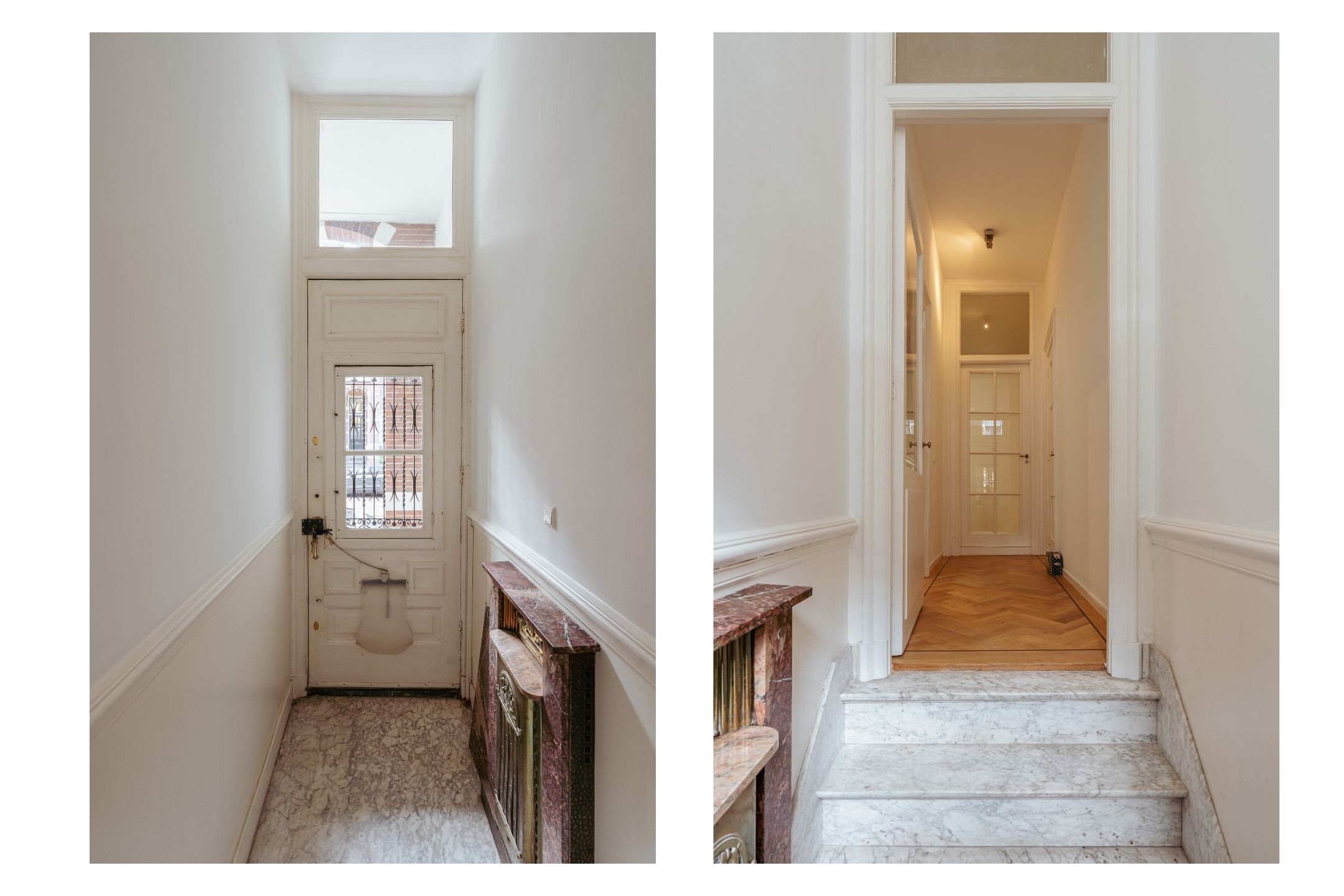 Aan de voorzijde van de woning bevindt zich de royale woonkamer met sfeervolle (open) haard en grote raampartijen, waardoor de ruimte baadt in natuurlijk licht. De woonkamer wordt extra gekenmerkt door prachtige authentieke details, waaronder rijk gedecoreerde plafondornamenten en originele schuifdeuren, die de ruimte een elegante en karaktervolle uitstraling geven. Dankzij de riante afmetingen is dit een ideale plek voor een comfortabele zithoek en een royale leefruimte.