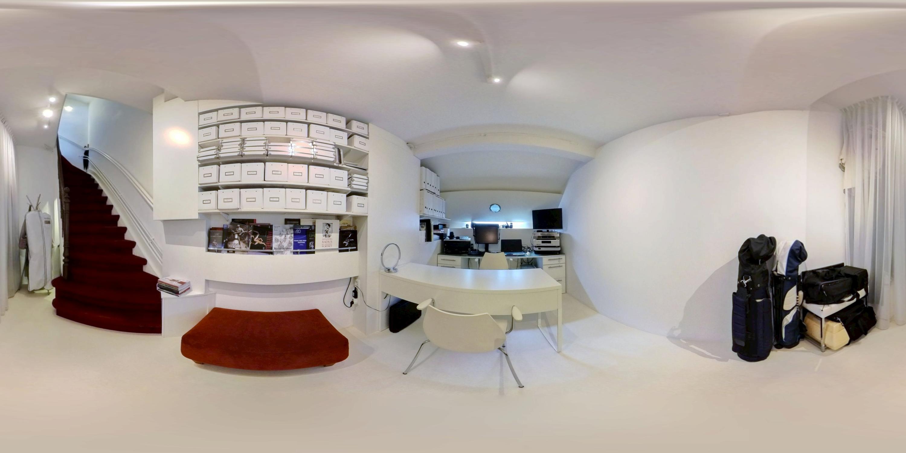 Een rood beklede trap leidt naar het souterrain met vloerverwarming. Deze ruimte van circa 13 m² is uitermate geschikt als logeerkamer, yoga of sportruimte, aangevuld met volop bergruimte. Momenteel is de ruimte in gebruik als kantoor.
