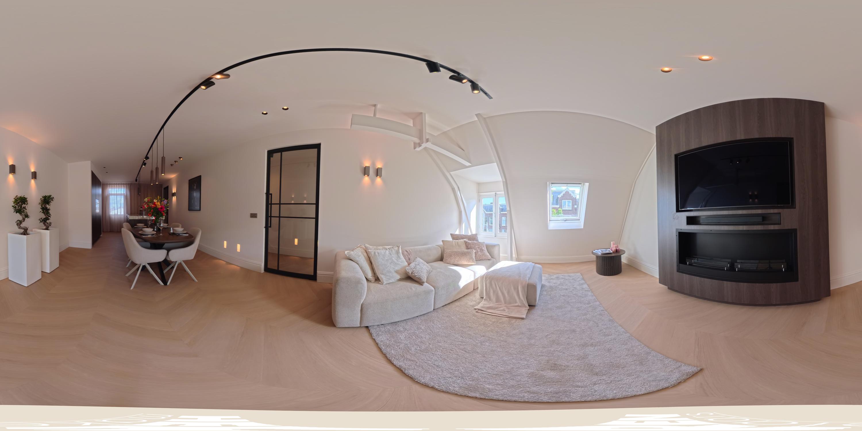 On the top floor, you enter through a sleek integrated sliding door into a beautiful, spacious hallway that provides access to all rooms. The heart of the home is the open-plan living and dining area, which spans the entire length of the apartment. With windows on both sides, the space is flooded with natural light. At the front is the sitting area, complete with a cozy bio-ethanol fireplace stylishly integrated into a built-in cabinet with TV. At the rear lies the modern open kitchen with a cooking island. Finished with a Dekton countertop, the kitchen is equipped with every luxury appliance imaginable, including a wine cooler, Quooker tap, dishwasher, fridge/freezer, Miele combi-oven, and a Miele induction hob with integrated extraction system. The bar section of the island also makes this a sociable spot to cook together or enjoy a glass of wine with family and friends.