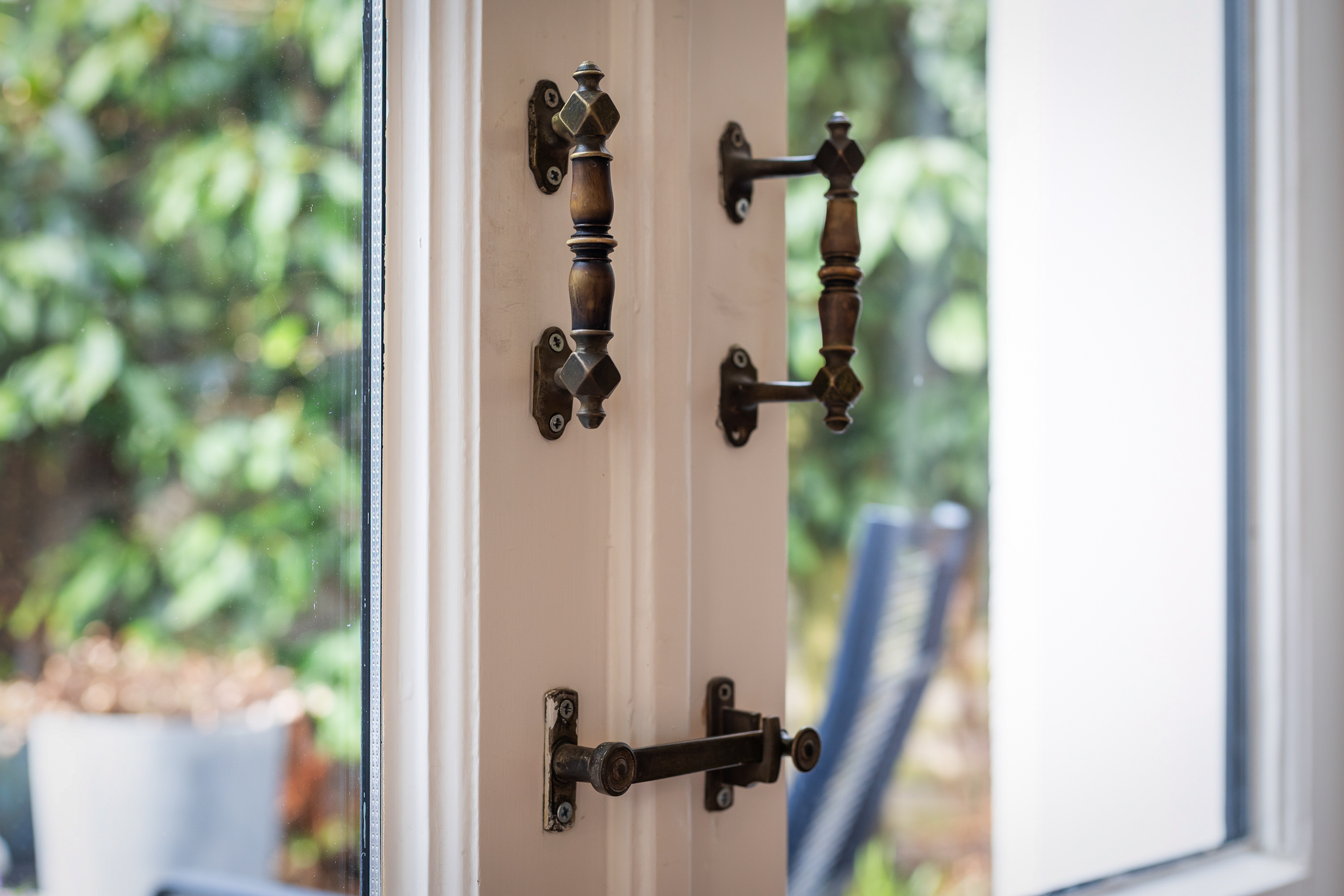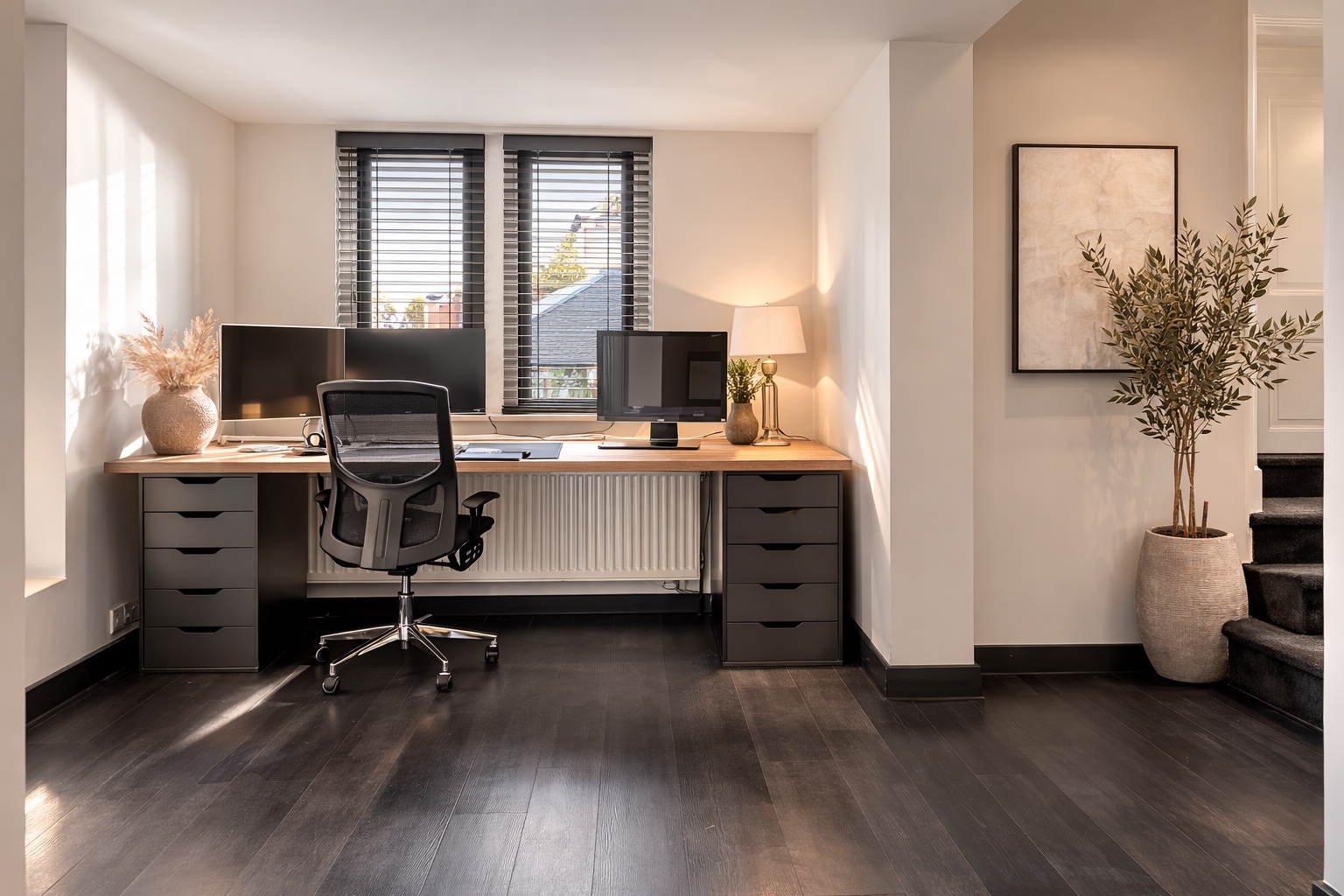 A door from the kitchen leads into the living room, which has a playful Z-shaped layout. At the rear, a study area provides a quiet space for working or studying from home. The ceilings are smoothly plastered, and through two elegant steel-framed glass doors one enters the L-shaped living area. Here, the character of the villa is fully expressed. Original ceilings with decorative cornices and mouldings, a granite fireplace with wood-burning stove, and an oak herringbone floor with border inlay create a rich and atmospheric setting. Double sliding doors open onto the terrace, creating a natural connection between indoors and outdoors.