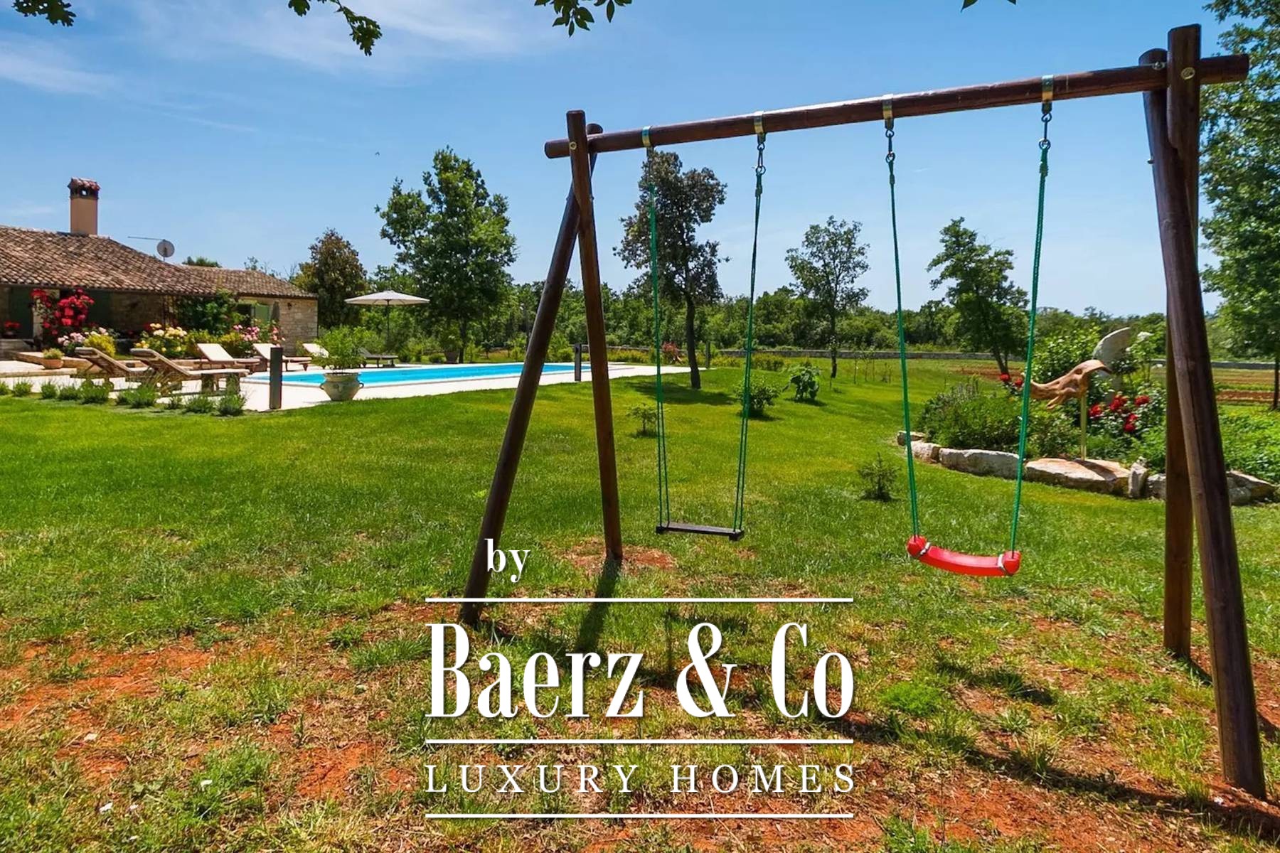 The grounds are marked by landscaped privacy, including a large olive grove comprising 170 indigenous Istrian trees, presenting both an aesthetic and agricultural legacy. An adjacent auxiliary apartment of 50 m², along with a smaller outbuilding, amplifies potential for guests or business utility. Terraces open towards the landscape, drawing in the clear Istrian light and broad views over nature, while a generous, enclosed garden shelters moments of solitude.