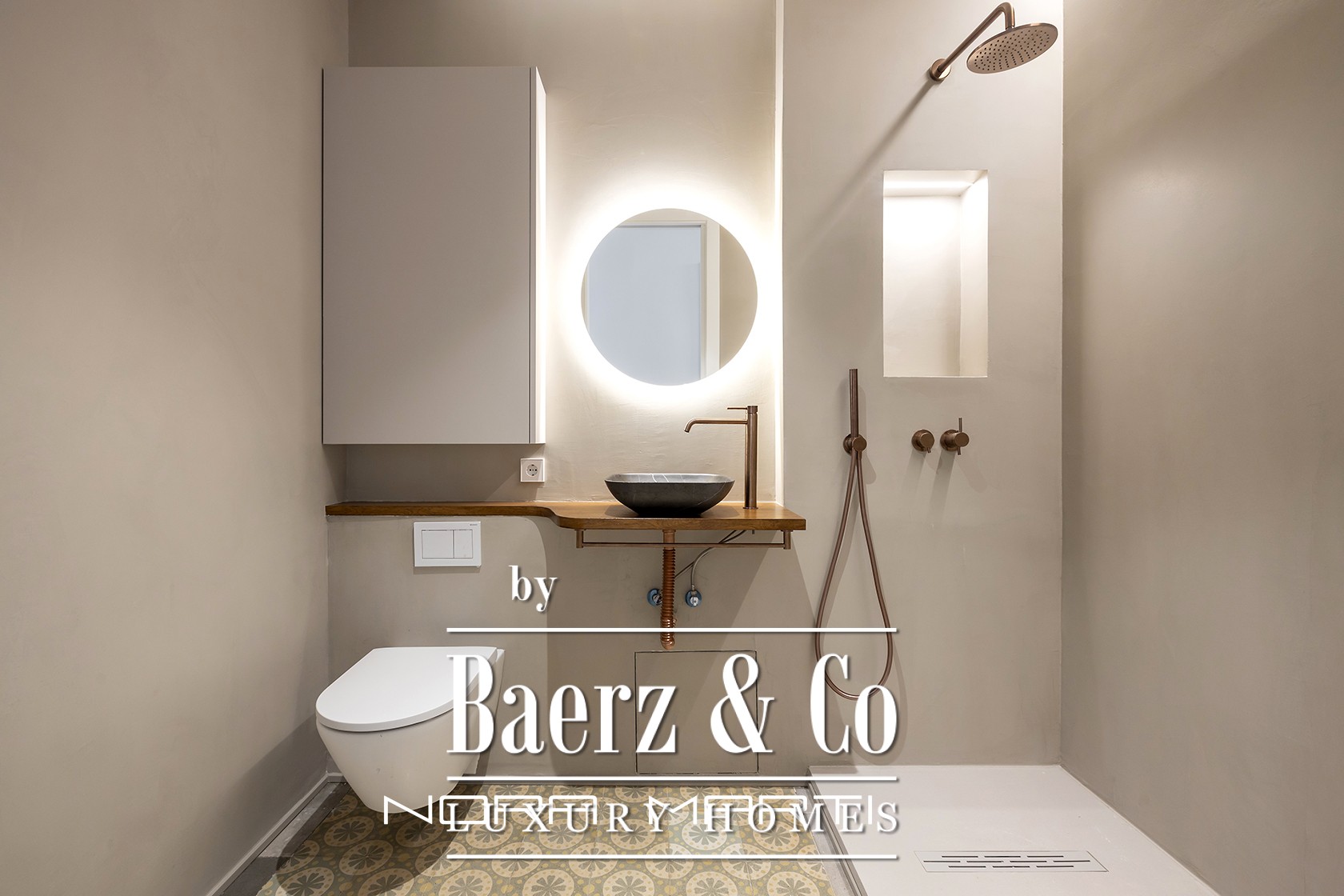 The apartment offers two well-proportioned bedrooms and two bathrooms, with an internal layout that instills a sense of openness and clarity. Restored galleries and windows shape the living experience, drawing in natural light and animating each space with warmth and rhythm throughout the day. Every lighting element has been chosen following an architectural light study, fostering a quietly sophisticated ambience from dawn to dusk.