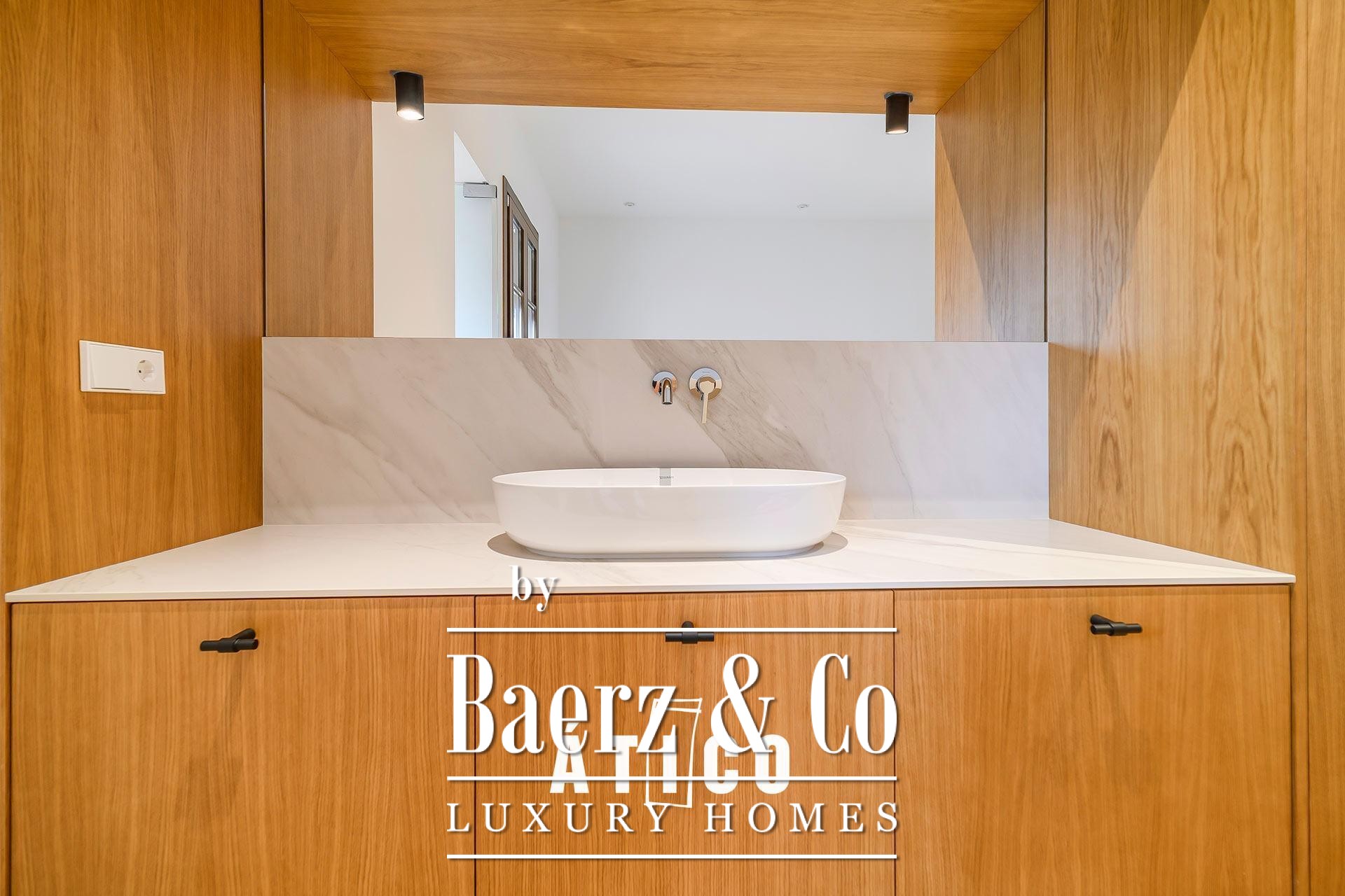 The upper floor features a bedroom, a versatile multipurpose room suited for work or leisure, and a full bathroom. A 38.85 m² terrace extends living outdoors, tailored for open-air gatherings or quiet moments under the sky above the city. Three bedrooms and three bathrooms offer a balanced sense of comfort and solitude, while thoughtful materials and immaculate finishes speak to the level of craftsmanship seen throughout. The kitchen is equally considered, providing ample storage and a measured approach to daily living.