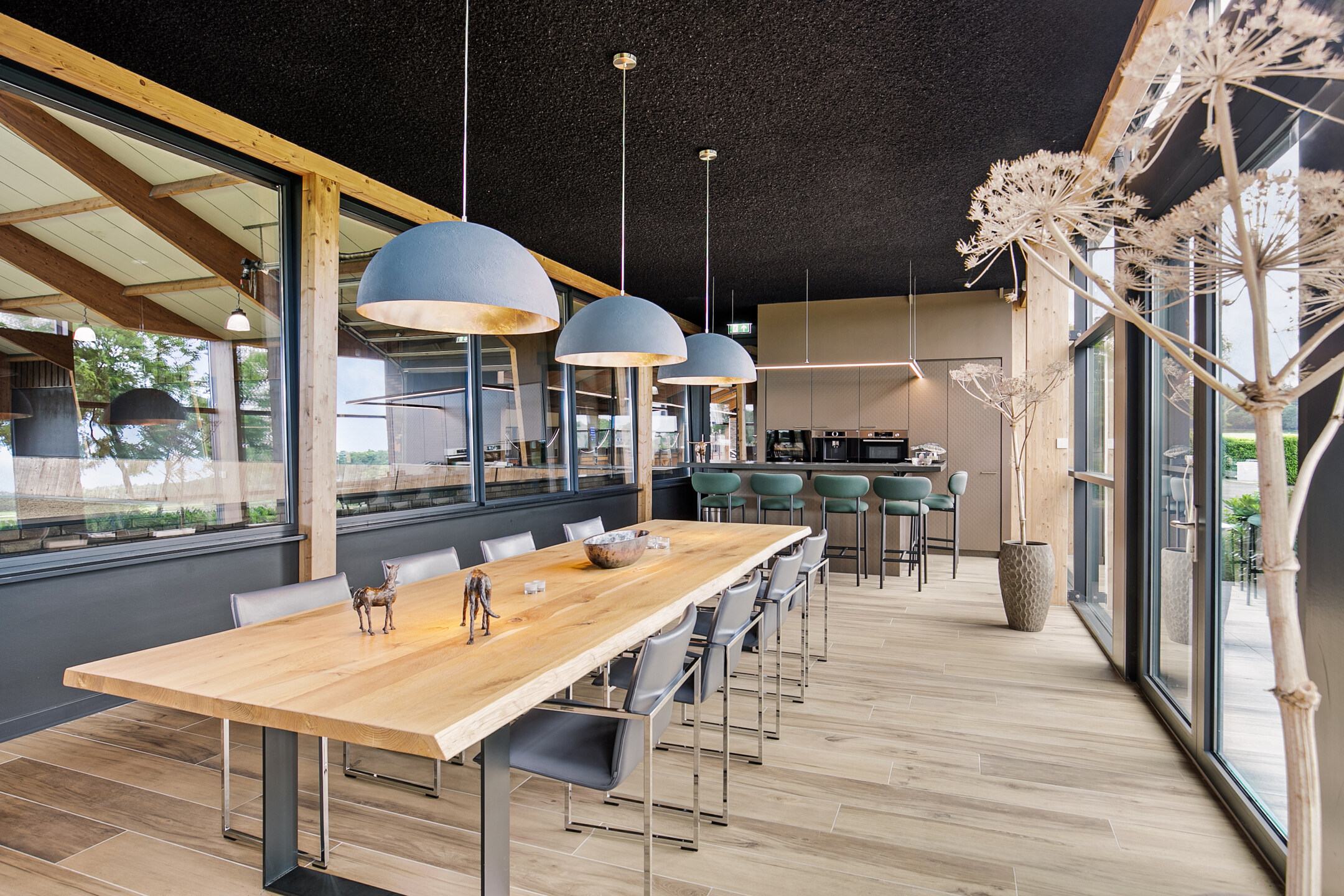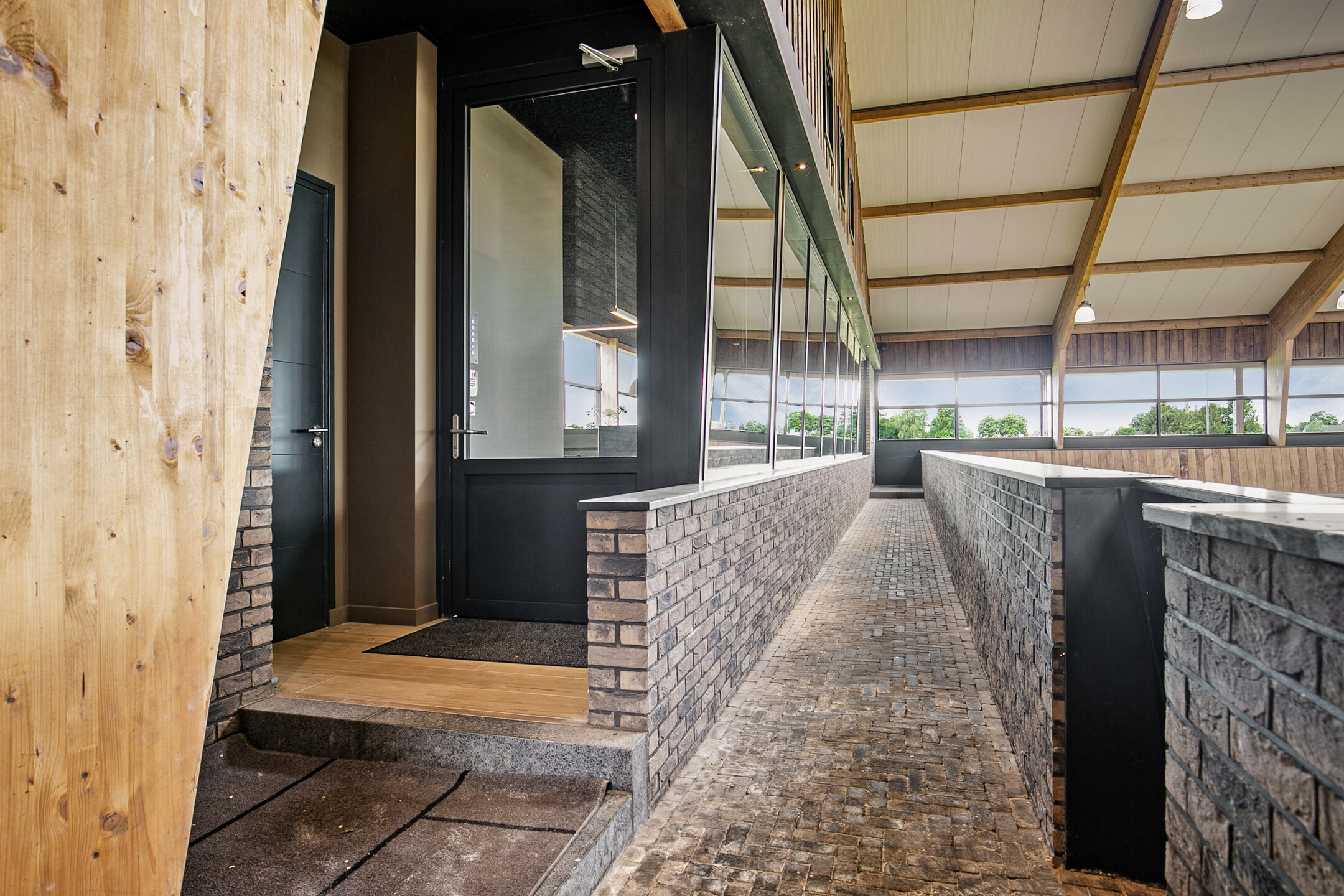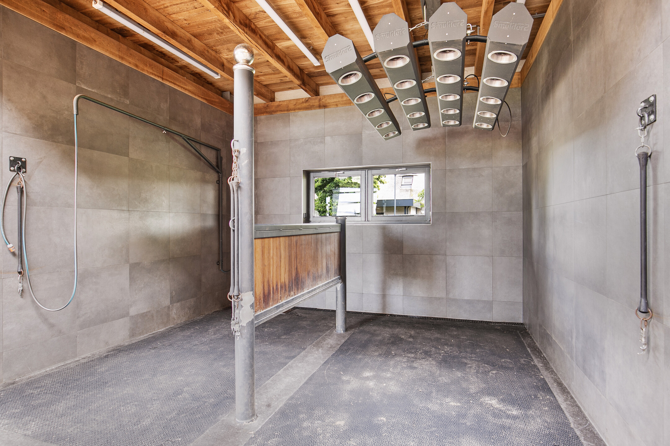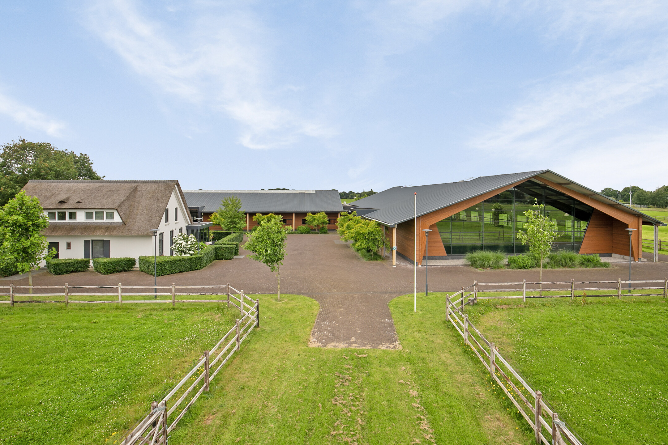 The luxurious reception area offers a beautiful view over the indoor arena through large windows, as well as over the outdoor area with the outdoor arena, lunging circle, horse walker and paddocks. A complete overview! The reception area is accessible from the outdoor arena from the elevated terrace and equipped with a tiled floor with underfloor heating and furnished with a complete bar and a gas fireplace. The bar is equipped with a sink, a dishwasher, coffee machine, combination oven/microwave and a wine fridge. The large exterior windows have electrically operated screens and the acoustic ceiling has recessed lighting. From the reception area, there is direct access to the riding hall with indoor arena. The arena measures approx. 20x40 metres and is fitted with fine wooden rafters and a hardwood arena surround. This arena edge fence can be opened automatically from the stable area, giving direct access to the arena. There is an Equisport ebb and flow floor. The entire end wall consists of imposing windows and the side wall also has plenty of windows. The insulated roof is also equipped with a wide skylight in the ridge. A portal connects the indoor arena and reception area with a toilet room and the multi-purpose room on the 1st floor. The porch has a tiled floor, stucco walls and a stucco ceiling. There is a fixed sink with a cabinet and a storage cupboard offers plenty of storage space. The fully tiled toilet room is equipped with a floating toilet and urinal. The multi-purpose room on the first floor is finished with a PVC floor, stucco walls and a ceiling of insulation panels. Here, too, room-high windows in the rear façade offer a nice view of the outdoor arena, paddocks and other facilities. Next to the indoor arena is a spacious technical room. This is where the sprinkler system, the ebb and flow system, the central heating combi boilers, the unit for the solar panels and the floor heating, as well as the meter cupboard are located.The beautifully finished stable area exudes ambiance and warmth due to the frequent use of wood. The stable is equipped with 12 horse stalls, 2 washing rooms, a tack room, canteen, a laundry room and a toilet room. At the rear of the stable area is a large storage and stabling area, where there are also 2 rearing stalls and a fixed staircase provides access to the attic and mezzanine above the stalls. The horse boxes (approx. 3.50x3.50 m) are fitted with partly hardwood, partly stainless steel and partly powder-coated and lowered front walls with hinged doors. All stalls have an outside hatch. The washing areas are finished with a rubber floor and fully tiled walls. There is also a solarium.The stable area has a floor of baked bricks, wooden rafters and an insulated roof. A large skylight has been installed in the ridge of the roof. Large, translucent roller doors provide access to the surrounding yard. The tack room is furnished with custom-made cupboards, saddle supports and a sink. The room is finished with a tiled floor and panelled walls. The canteen has a tiled floor, wallpapered walls and a wooden beam ceiling. The canteen has kitchen equipment, which is equipped with a sink, fridge and dishwasher. The partly tiled toilet room is equipped with a floating toilet and a hand basin. The laundry room has connections for washing equipment and the installation of the solar panels. The room is finished with a tiled floor. The storage and stabling area is accessible from the stable area through sliding doors and also offers space for 2 rearing stables. A fixed staircase provides access to the attic space and mezzanine on the 1st floor. The rearing stables are equipped with partly hardwood, partly galvanised front and partition walls. The loft area is equipped with fixed cupboards with plenty of storage space and the flybuster system. The attic is finished with a wooden floor.