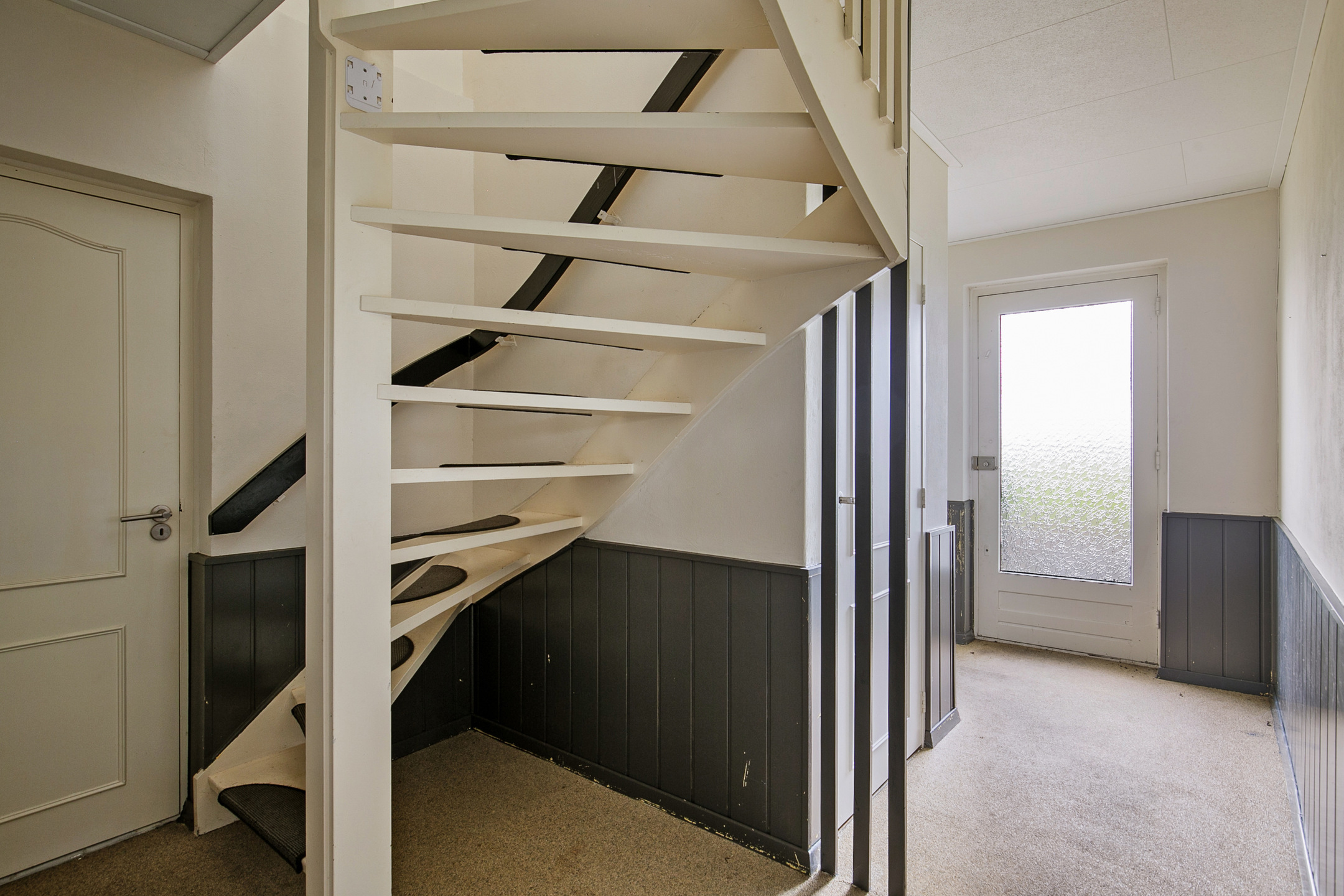 The left part of the house is furnished on the ground floor with a hallway, a spacious living room with an open kitchen, a toilet room, a central heating room and a utility room. The hall has vinyl flooring, stucco walls with wood panelling and a stucco ceiling. The hall provides access to the toilet room, central heating room and the living room. A fixed staircase provides access to the first floor.