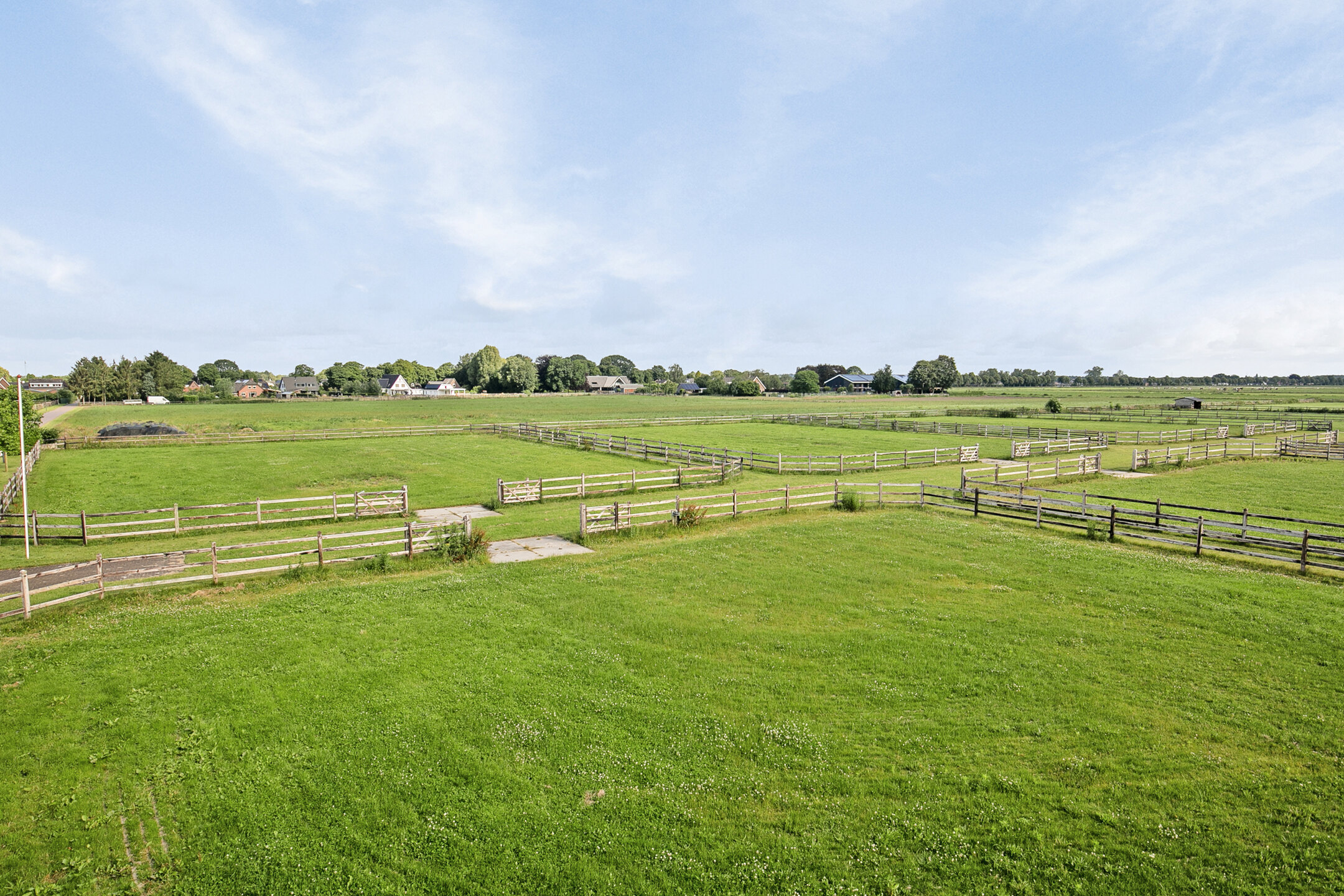 The outside grounds at the rear of the property are equipped with an outdoor arena, a horse walker, a lunging circle, manure pit and paddocks. The entire yard is paved with baked clinkers. The outdoor arena measures approx. 30x60 metres and has an Equisport ebb and flow riding surface. The arena is fenced off with a beech hedge. The horse walker is suitable for 4 horses and has a wooden fence. The sandy soil is mixed with flakes. The lunging circle is equipped with an ebb and flow riding surface and a wooden fence. There are 2 paddocks, which are equipped with a drained sandy soil and a wooden fence. Pastures are located around the accommodation and fenced with wood. Extension of pasture land is possible by buying or leasing neighbouring plots.