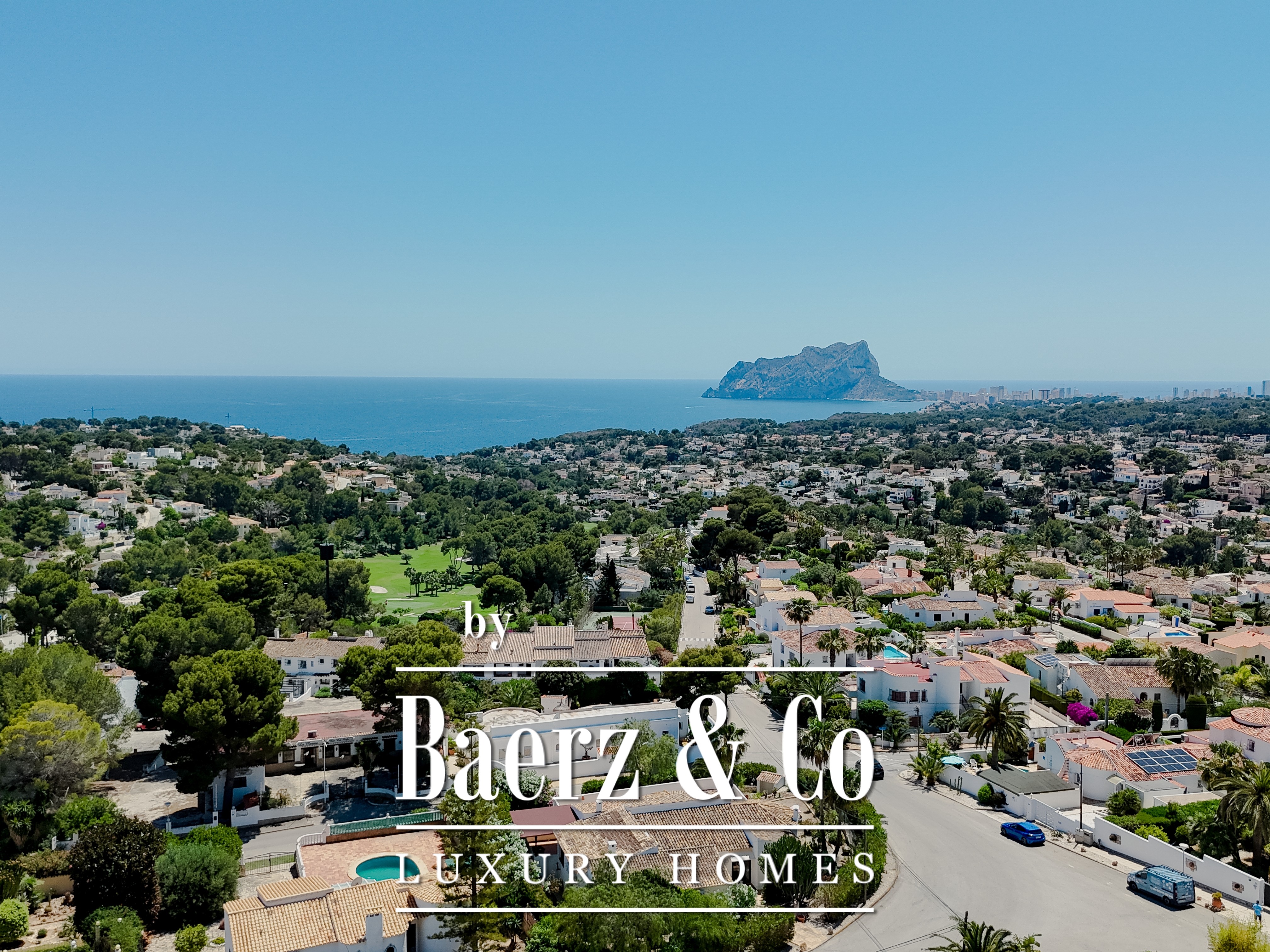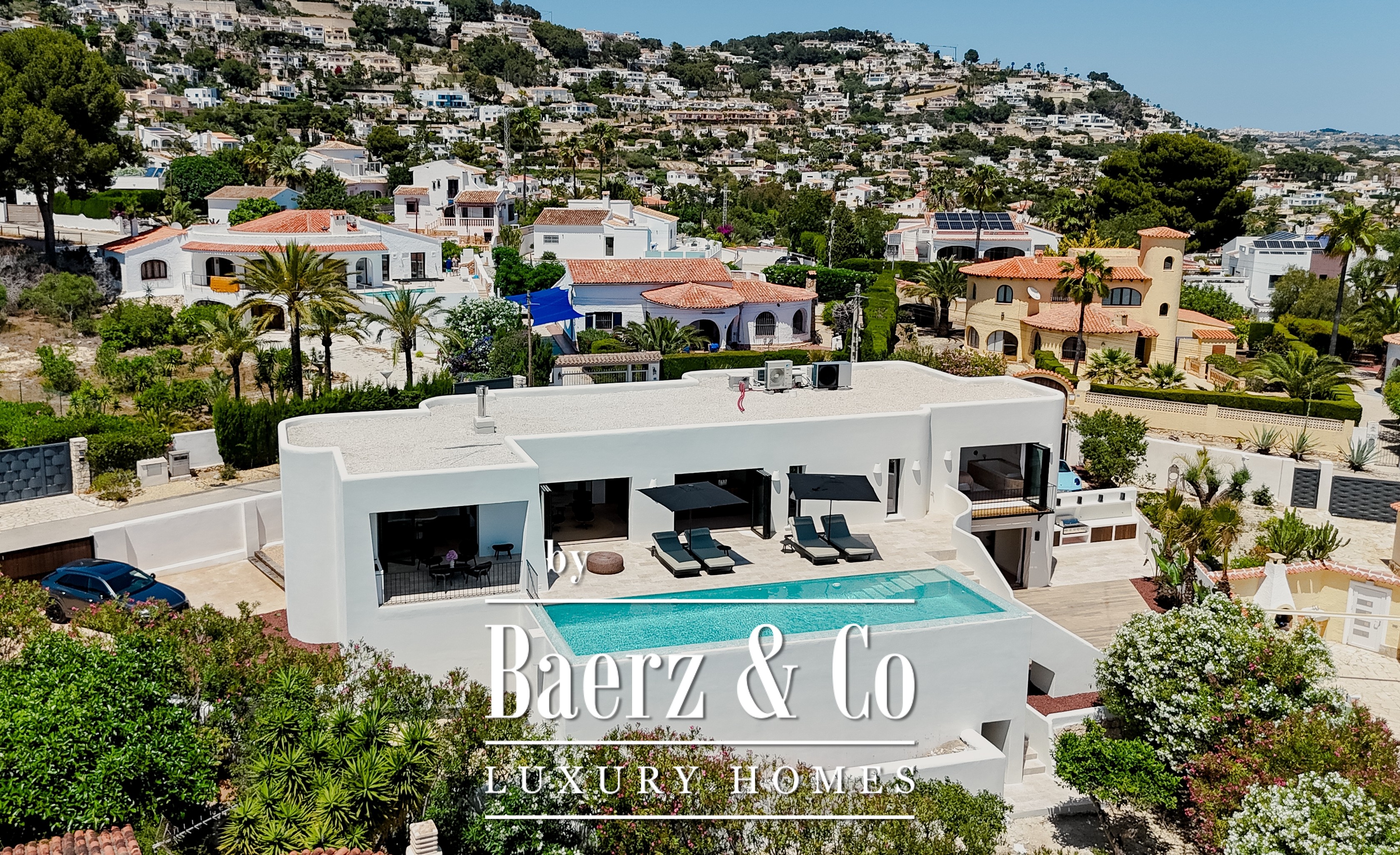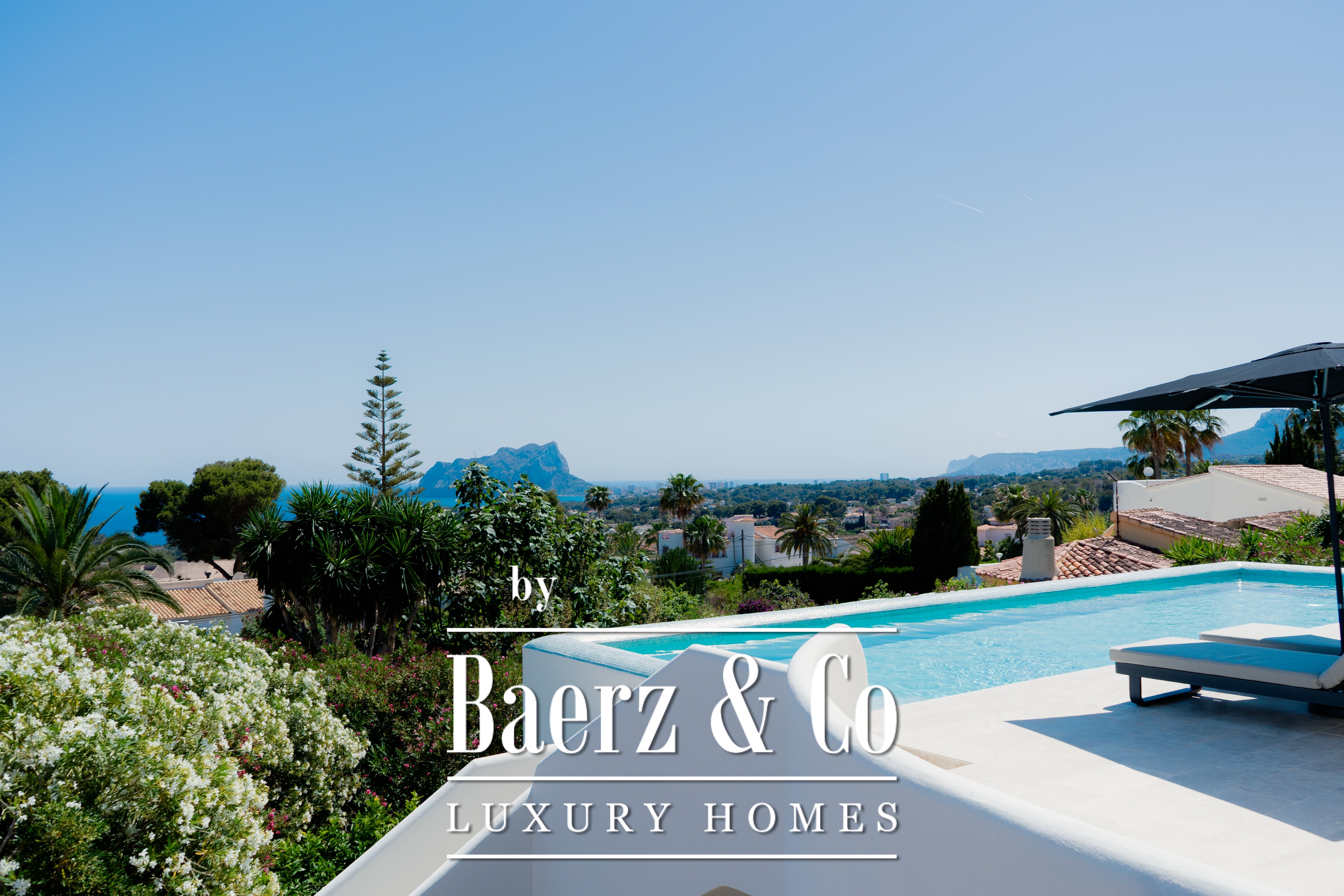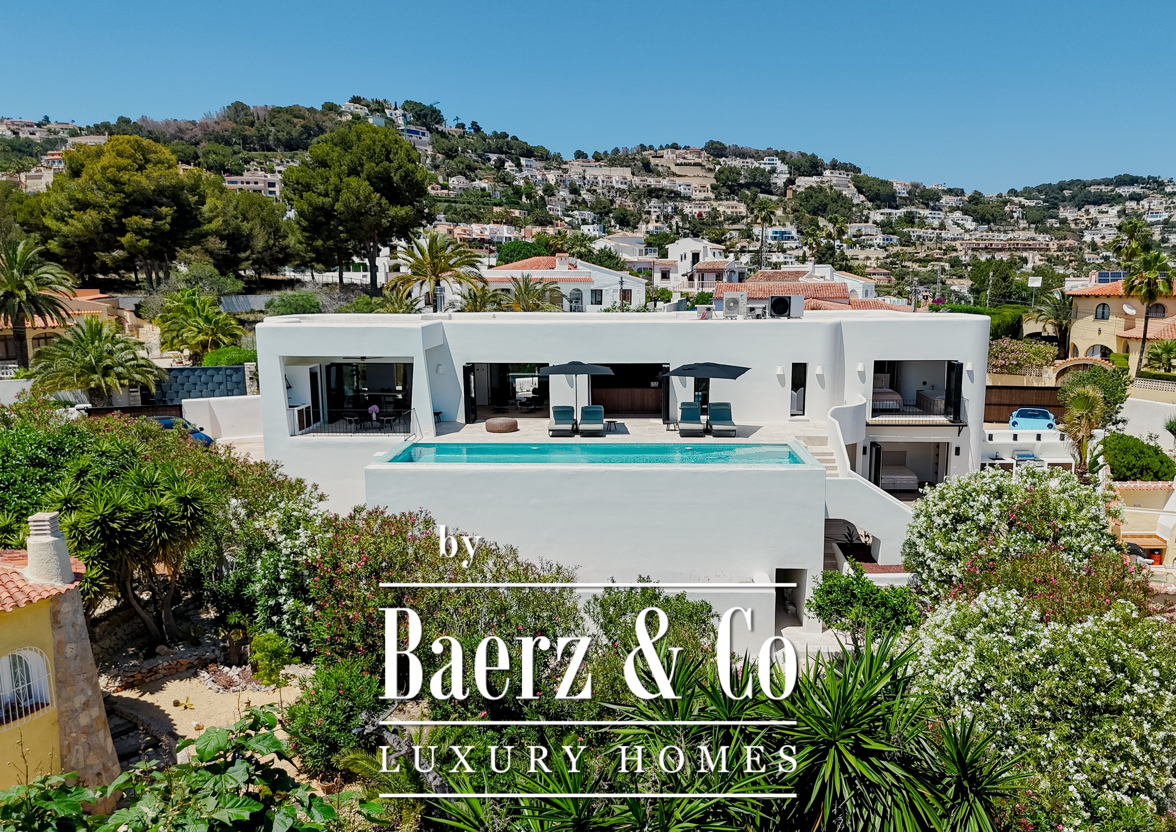 In the prestigious residential area of San Jaime in Moraira lies this exceptional villa, where Mediterranean charm and modern luxury blend seamlessly. The property is situated in a prime location and offers breathtaking views of the Mediterranean Sea and the imposing Ifach Rock. From the moment you arrive, it becomes clear that this is a unique residence: two private driveways with space for four cars and three separate entrances provide an unparalleled combination of comfort, privacy, and flexibility.