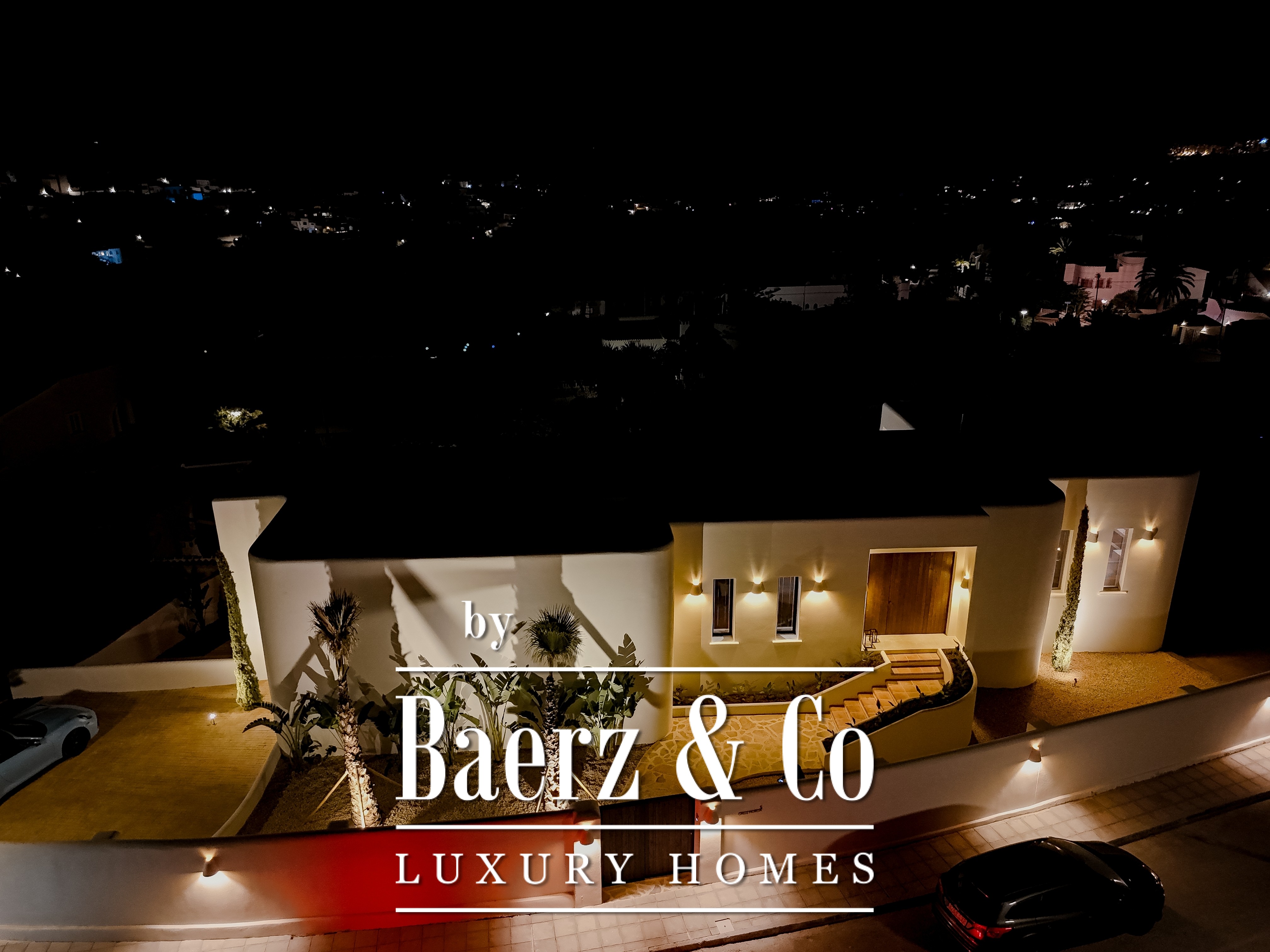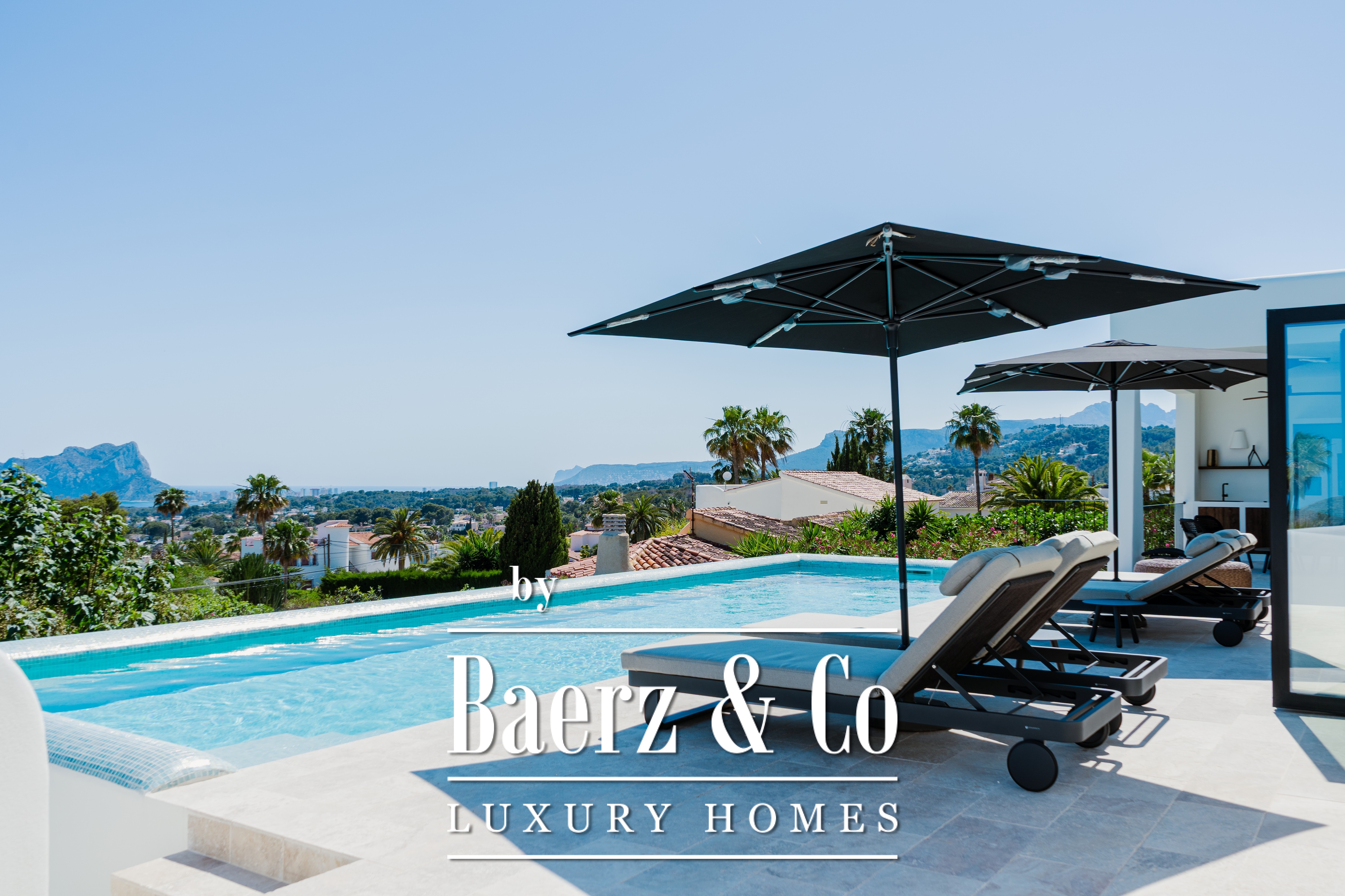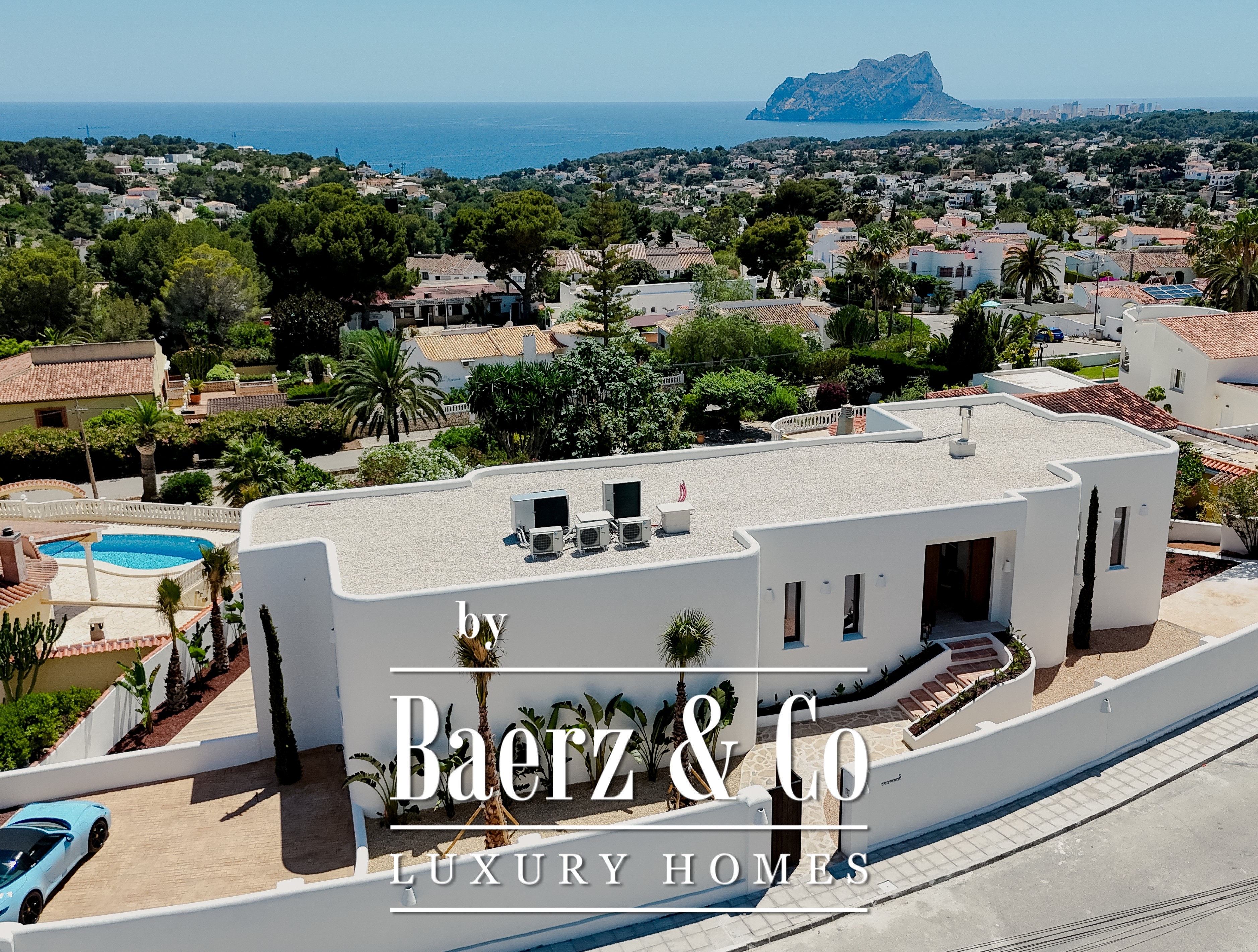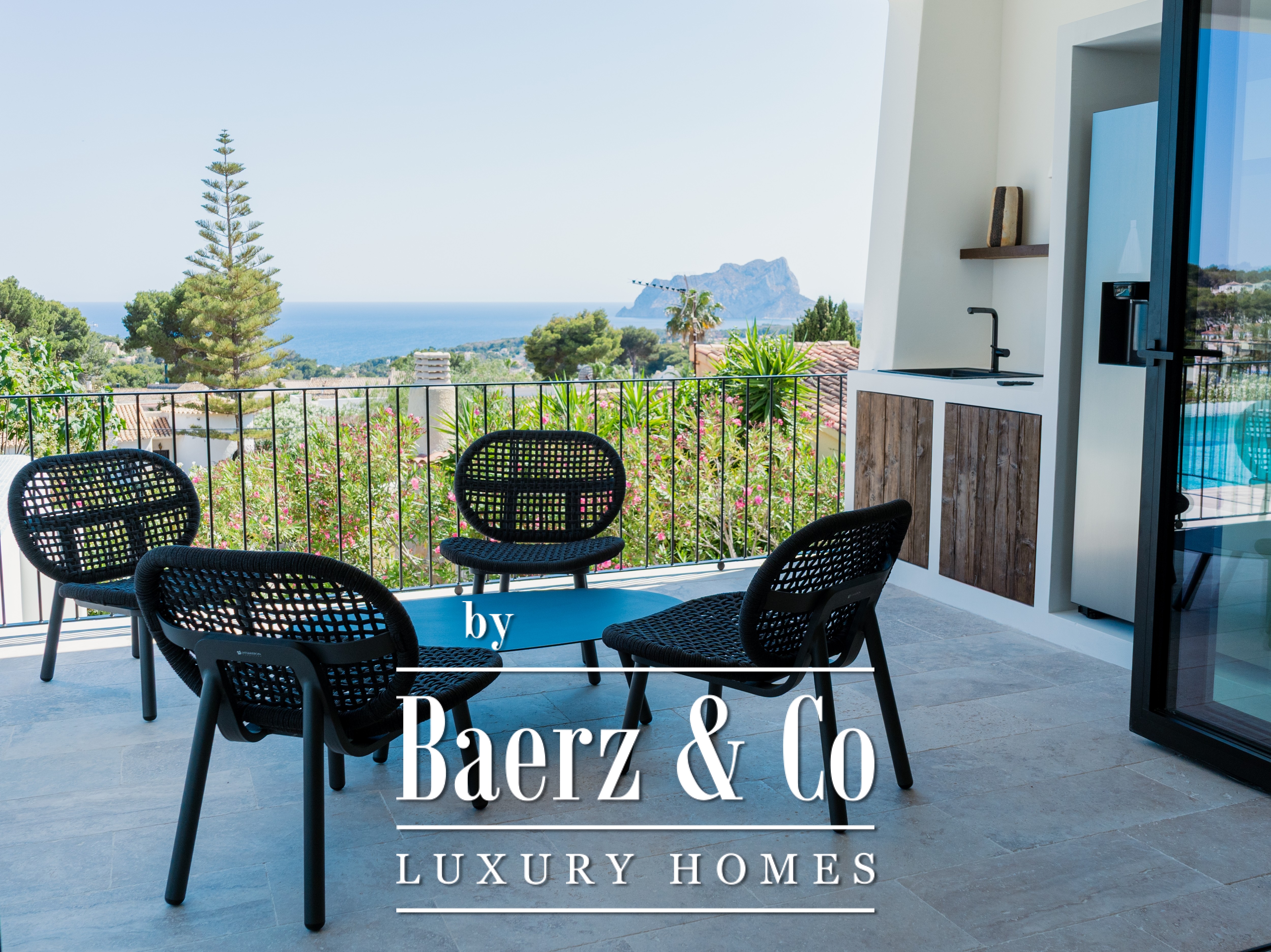 In the prestigious residential area of San Jaime in Moraira lies this exceptional villa, where Mediterranean charm and modern luxury blend seamlessly. The property is situated in a prime location and offers breathtaking views of the Mediterranean Sea and the imposing Ifach Rock. From the moment you arrive, it becomes clear that this is a unique residence: two private driveways with space for four cars and three separate entrances provide an unparalleled combination of comfort, privacy, and flexibility.