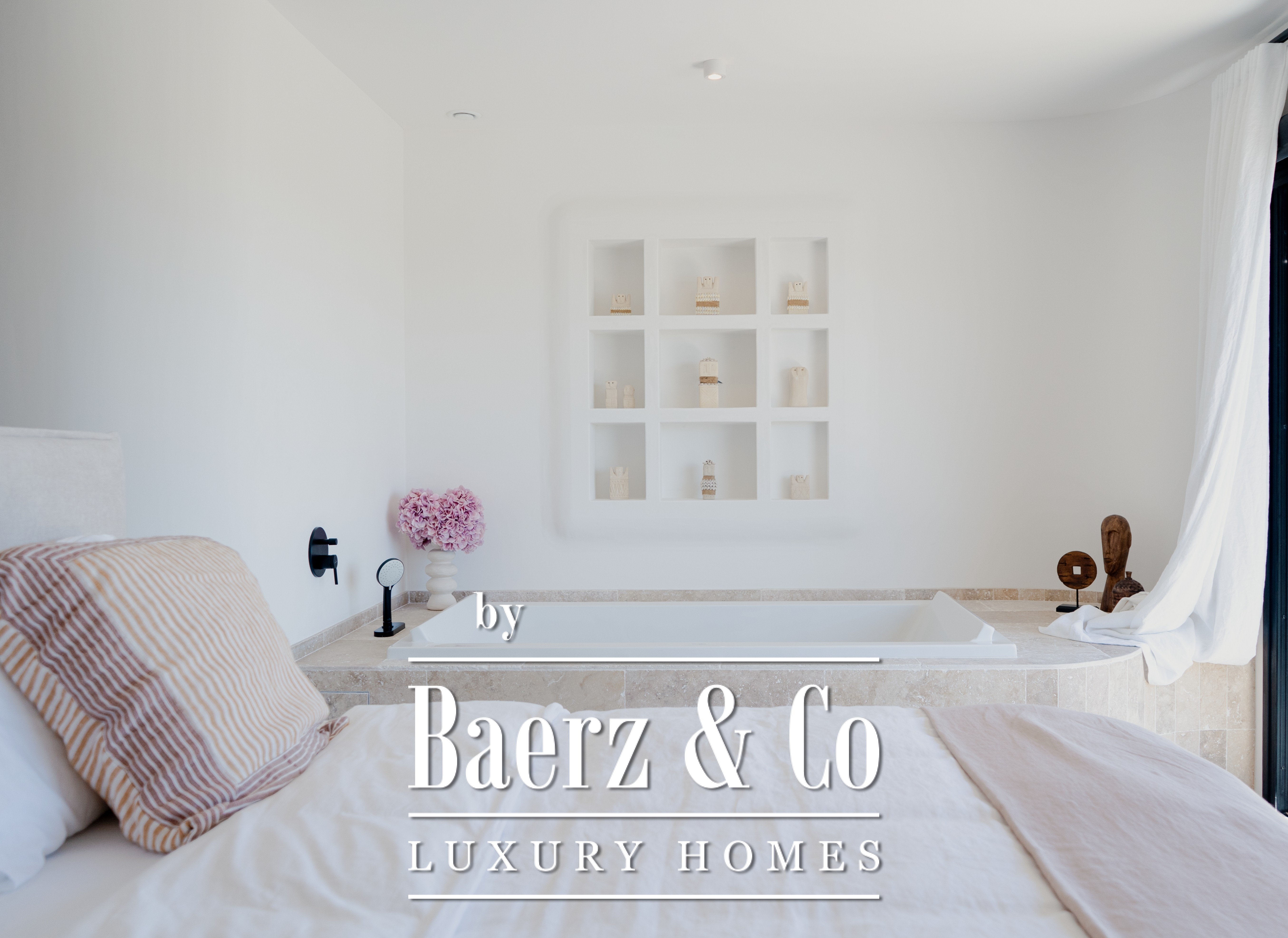 The Mediterranean garden, fully landscaped with automatic irrigation and surrounded by palm trees and lush planting, provides a green setting where peace and beauty take center stage. On the main floor, you will find the impressive master suite with panoramic sea views, a freestanding bathtub, walk-in shower, and a luxurious custom-made dressing room in thermally treated Movingui wood – a sustainable and stylish accent subtly repeated throughout the house.