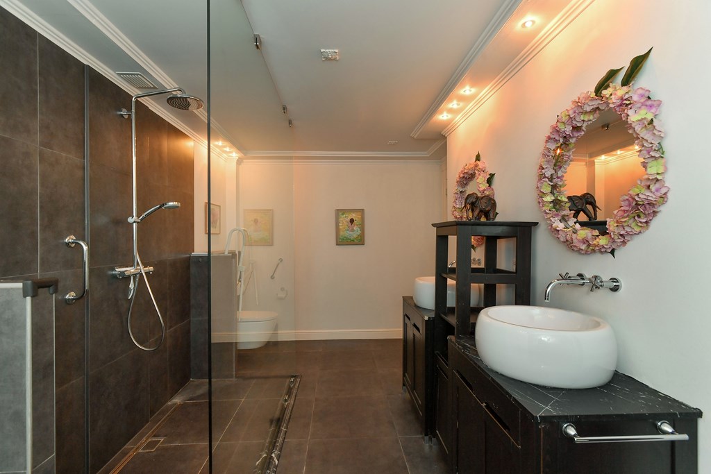 The penthouse offers a spacious bedroom and a luxurious, modern bathroom with a walk-in shower, vanity unit with double sinks, a fully automatic toilet, and the option for a bathtub. The master bedroom includes an adjoining dressing area and a charming French balcony. Both bedrooms have direct access to the bathroom and are designed with comfort and privacy in mind.