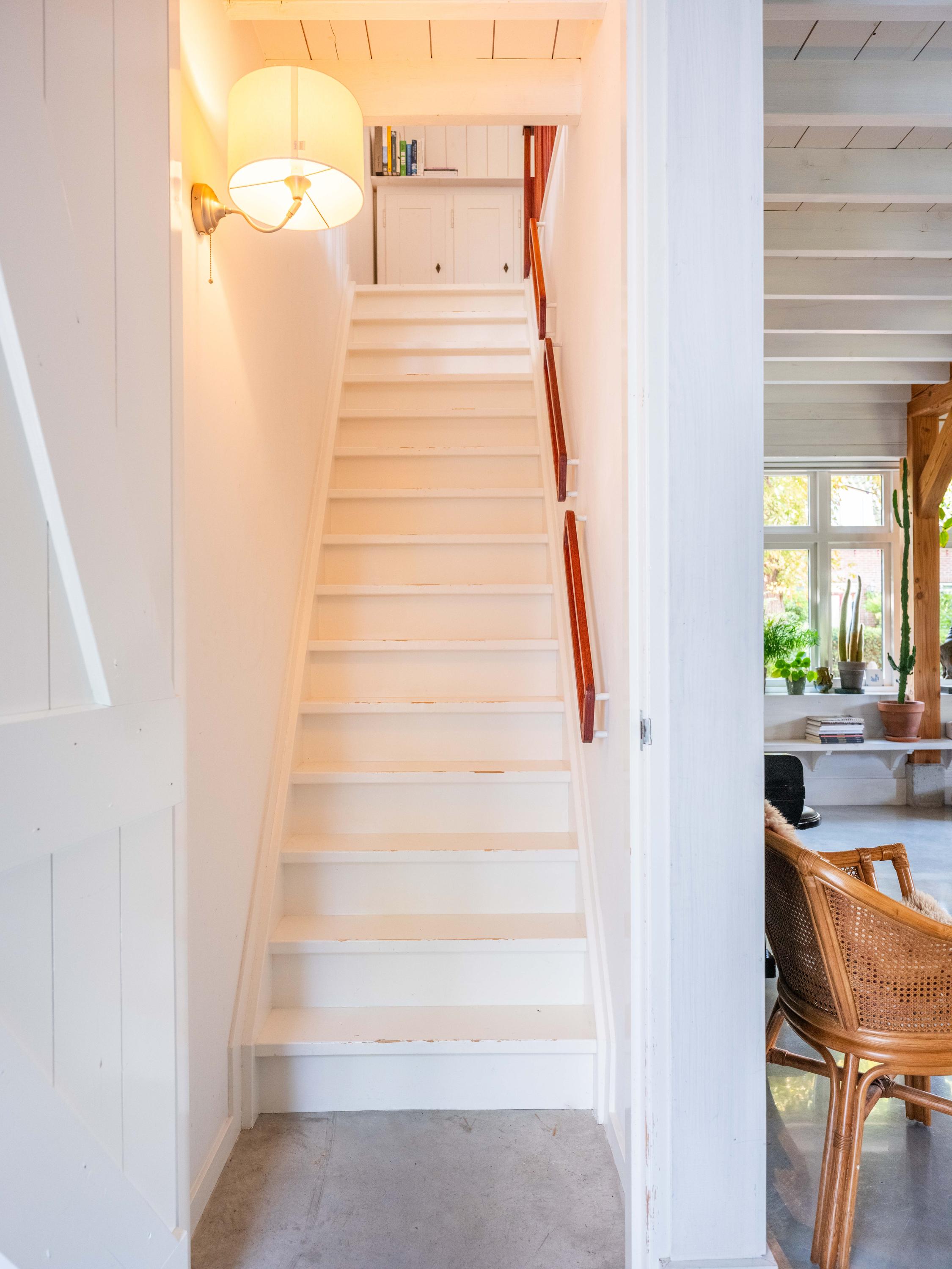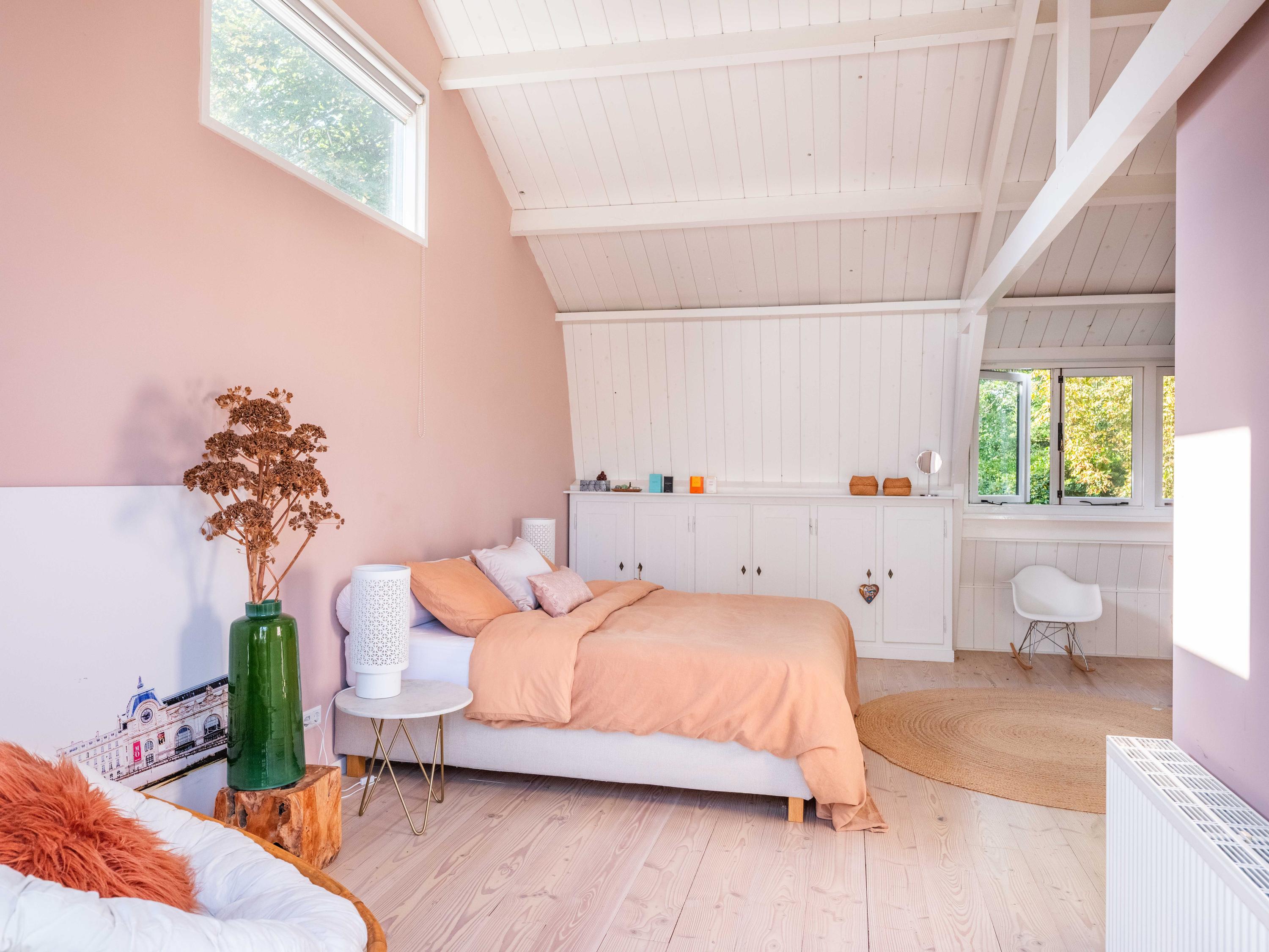 On the other side of the house, you will find the former atelier, now used as a guesthouse with a kitchenette and sleeping area. The roof has been insulated, and the upper floor is beautifully light and spacious.