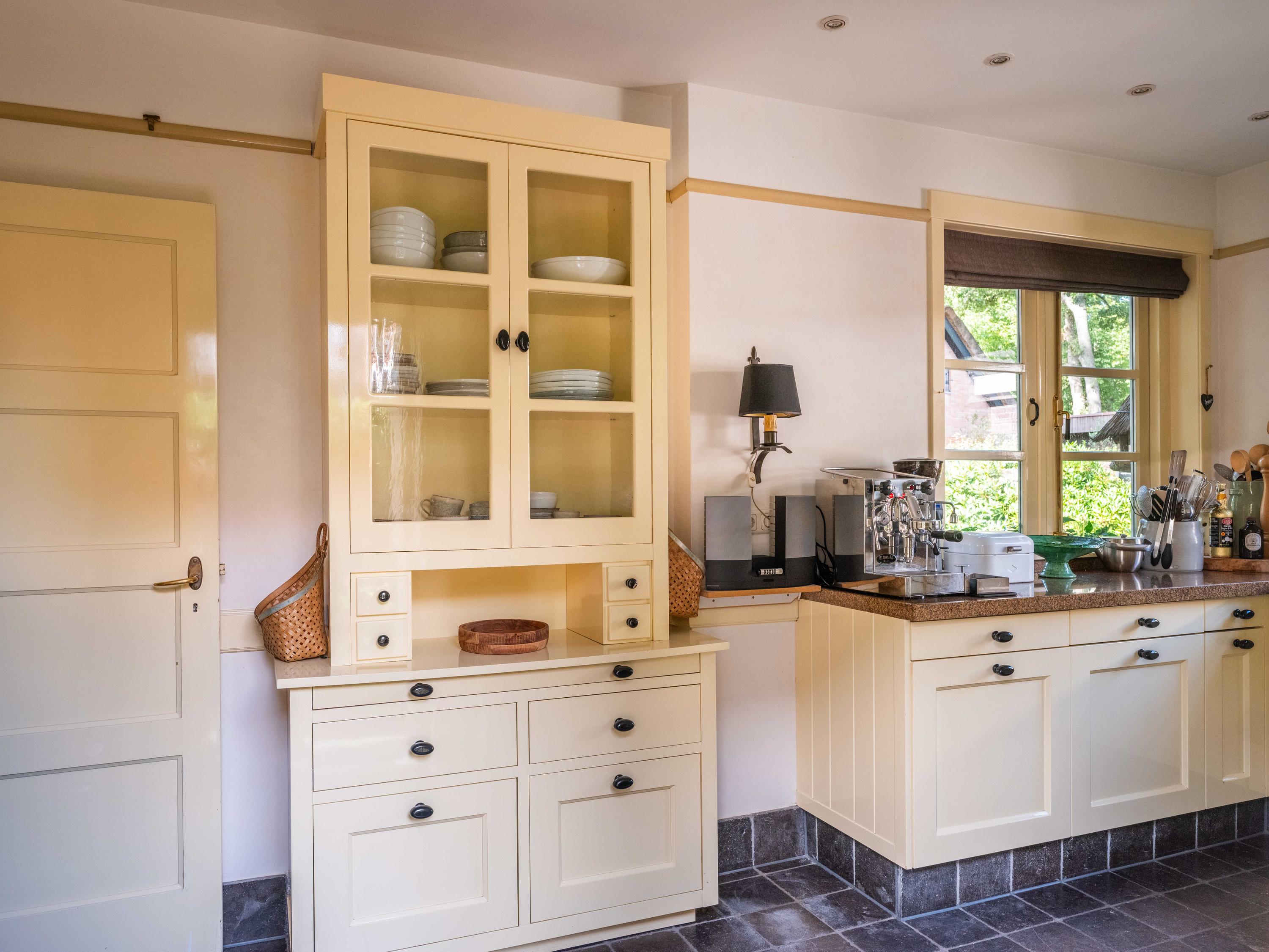 You enter this charming house through the red front door and intermediate hall with meter cupboard. The hallway with stairs to the first floor, a toilet and a large pantry under the stairs, continues into the kitchen. This is equipped with various built-in appliances including ceramic hob, combination microwave oven, fridge and dishwasher. The kitchen is also accessible from outside via a door at the side of the house.