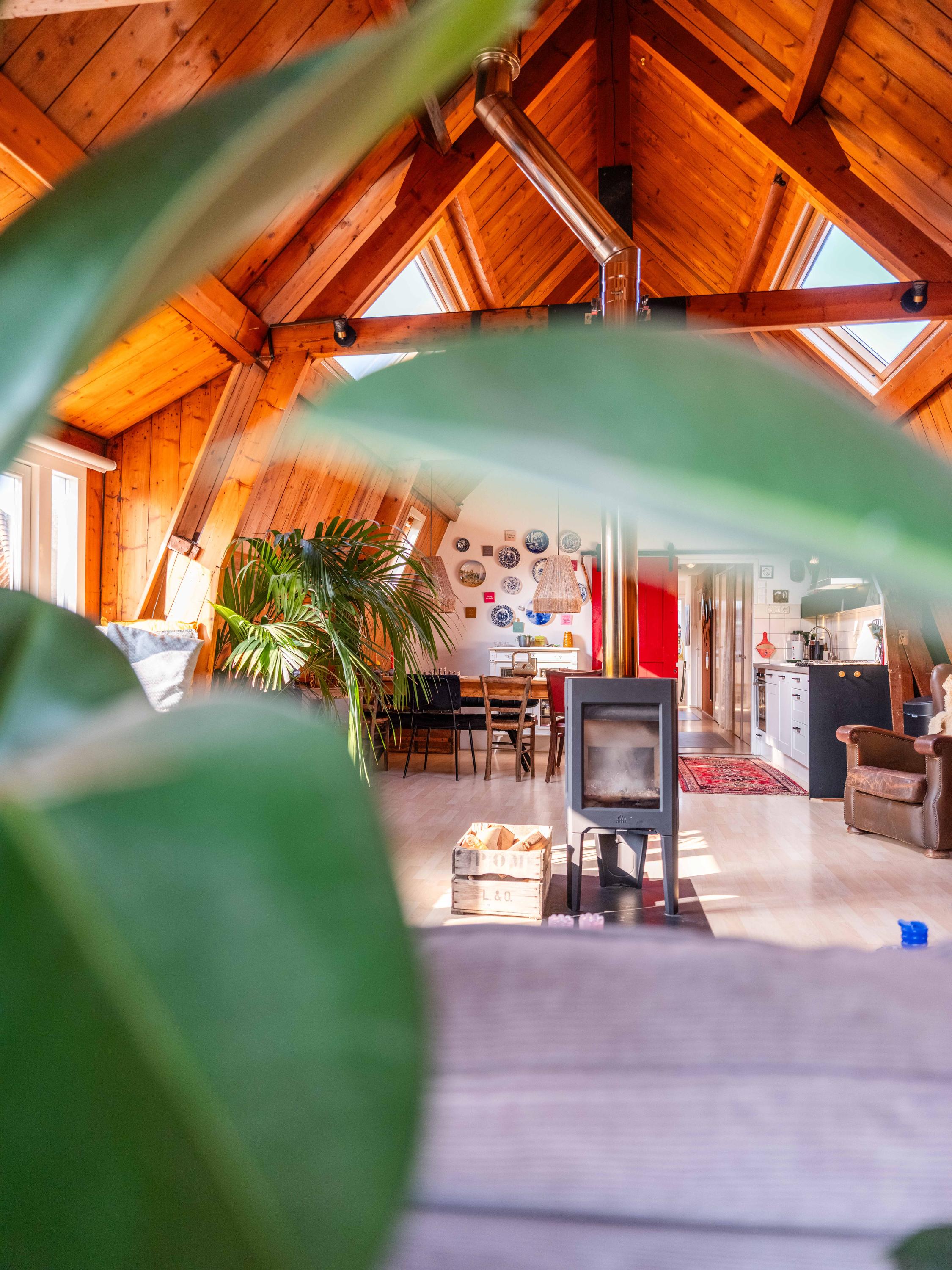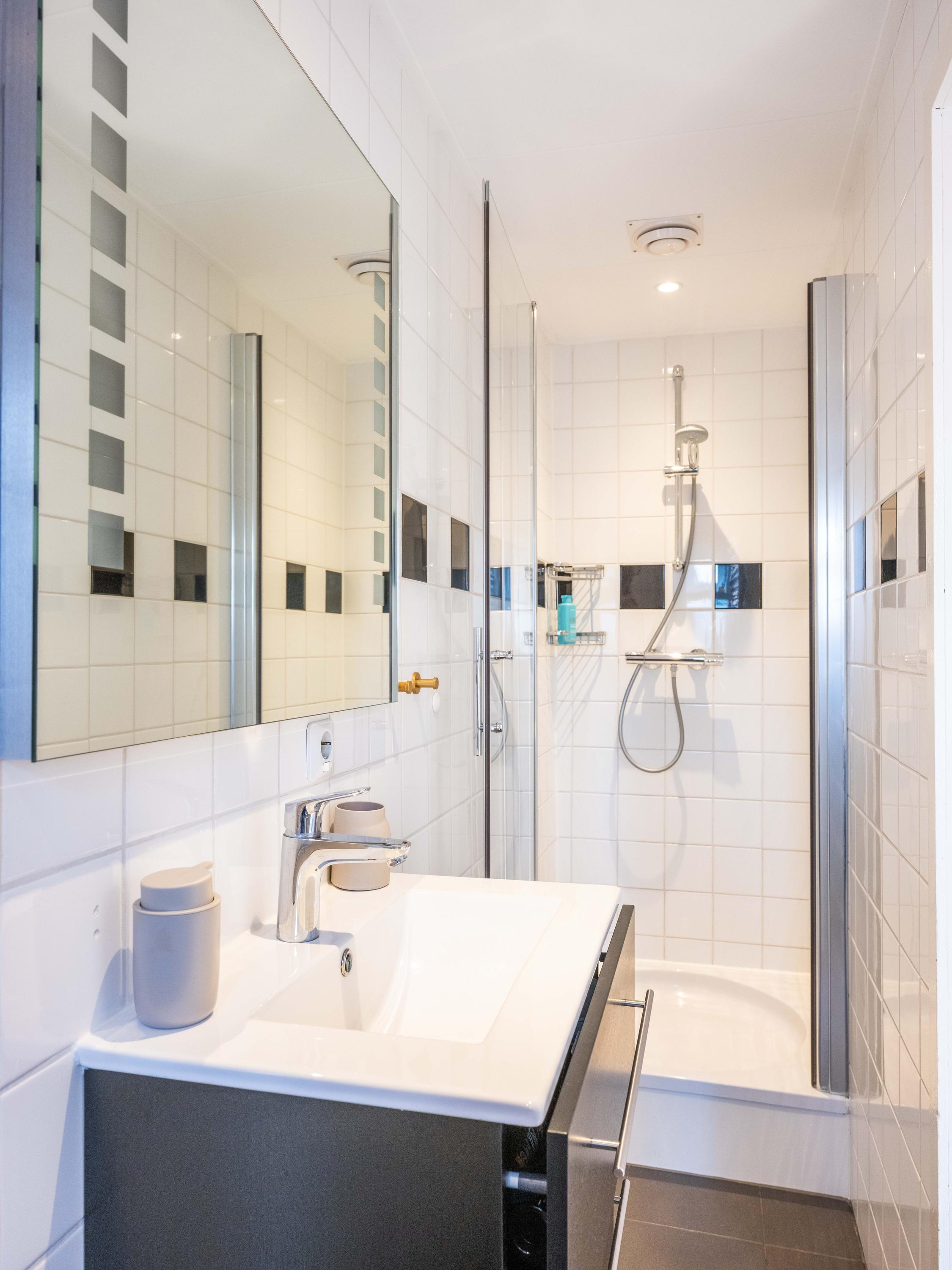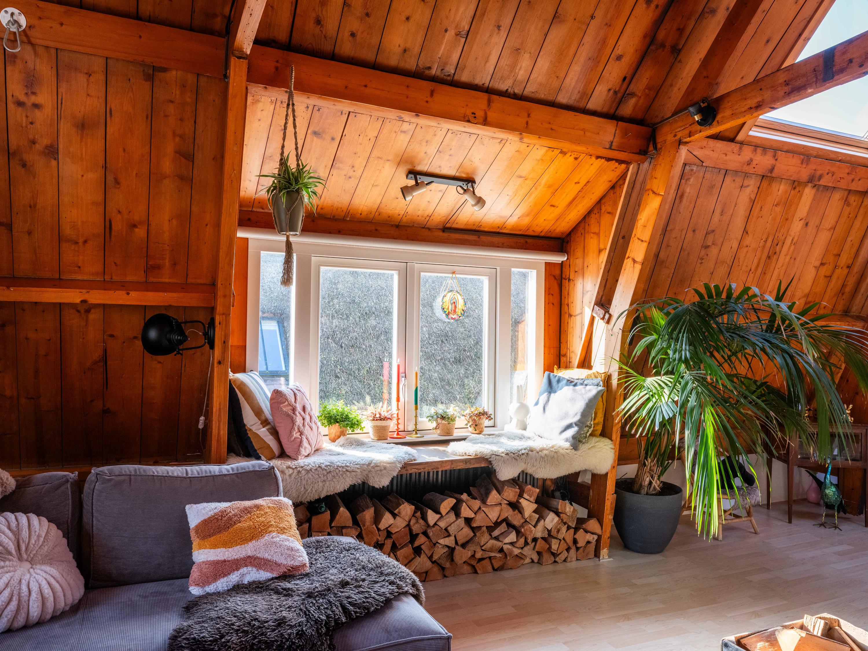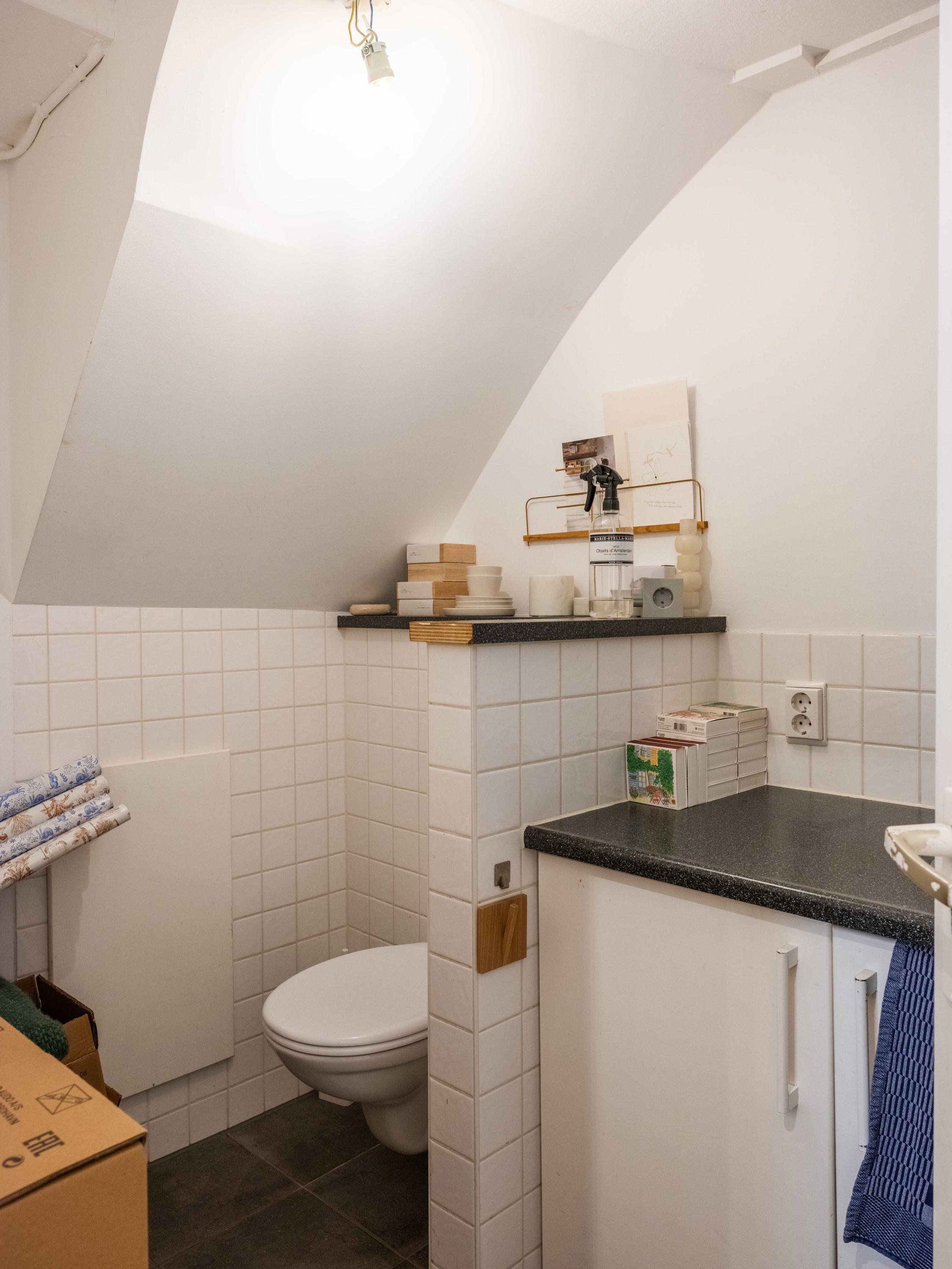 The upstairs apartment (approx. 76 m²) features a very spacious living room with a French balcony and views of Bergen’s two churches. The charming dormer window was fitted with a new frame and insulated glass in 2023 and is currently used as a cozy sitting area. The centrally located wood-burning stove not only creates atmosphere but also provides a pleasant and comfortable indoor climate.