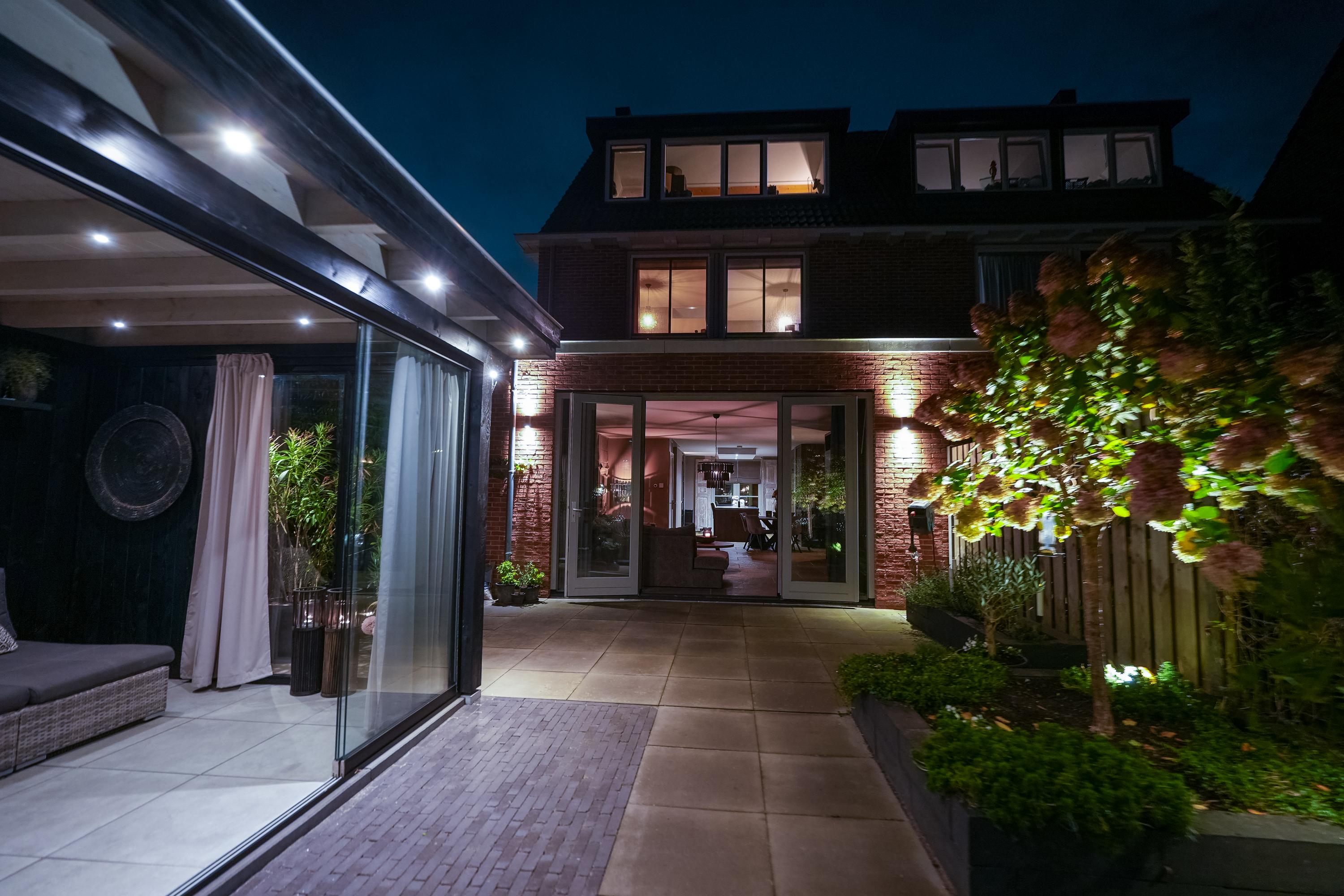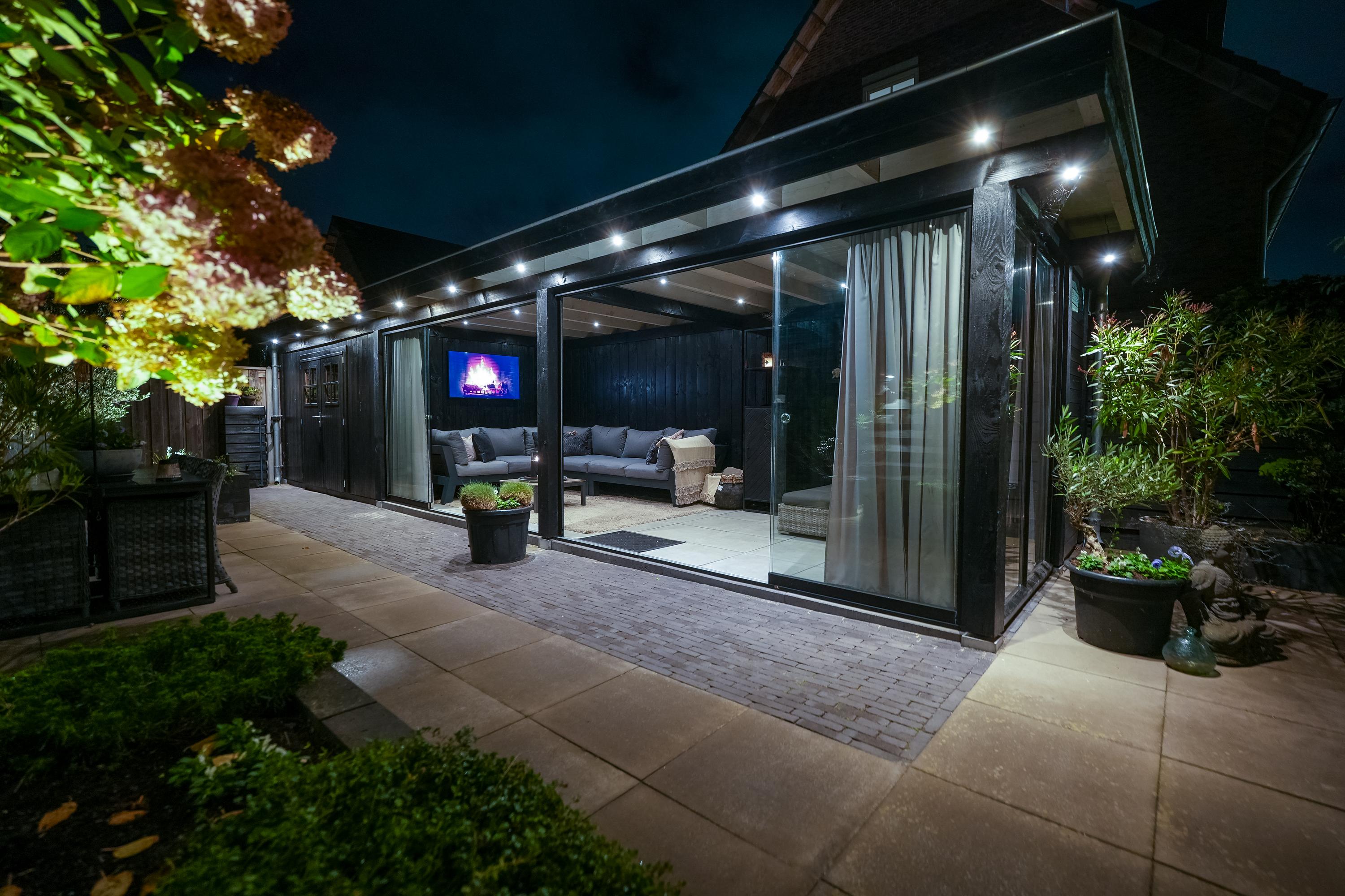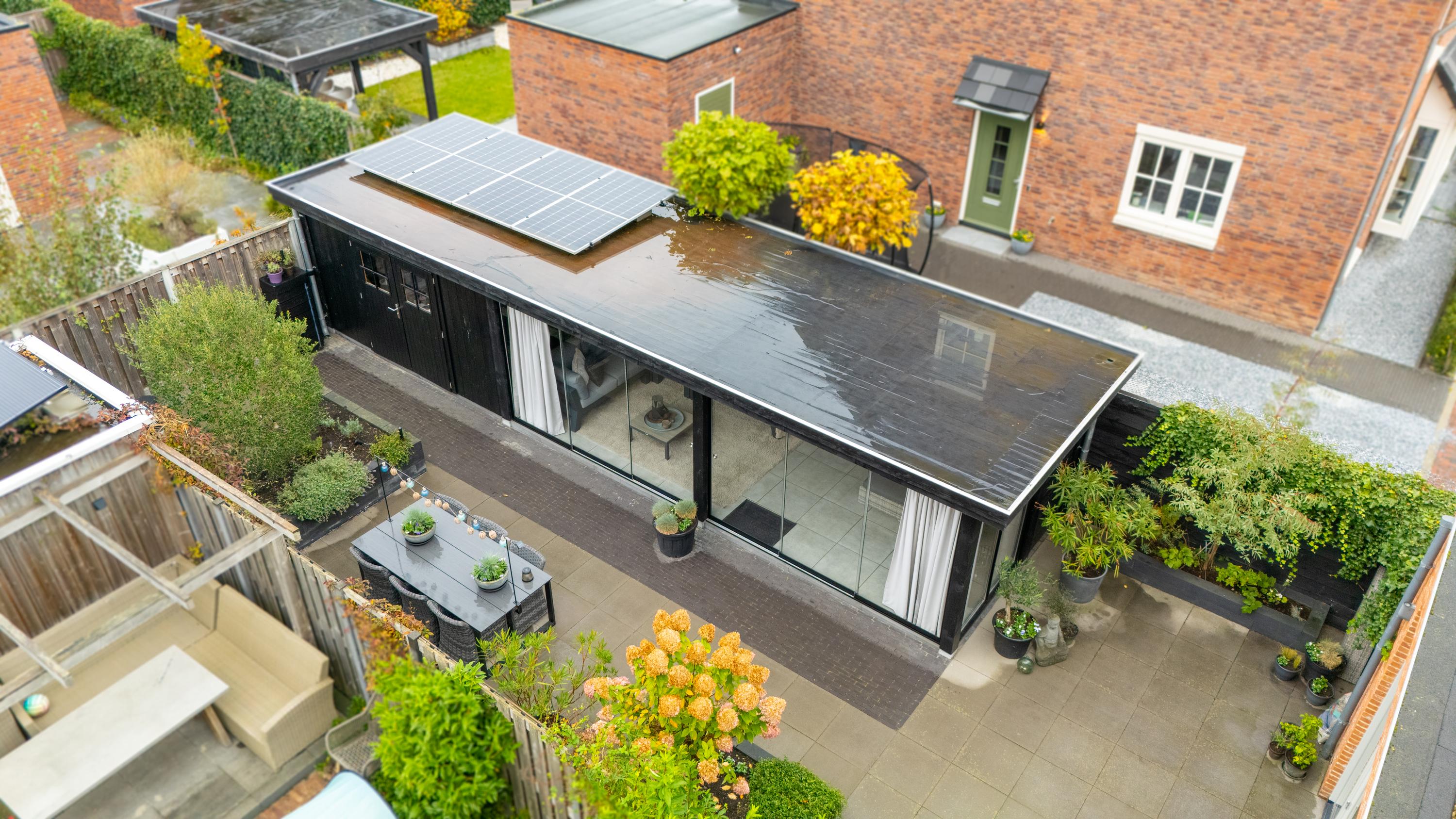 A sunny garden with an attractive covered terrace with glass enclosure, fitted with electricity and internet. The space is fully insulated and equipped with skirting heating, making it comfortable throughout the year. In addition, four solar panels contribute to an energy-efficient and sustainable home.