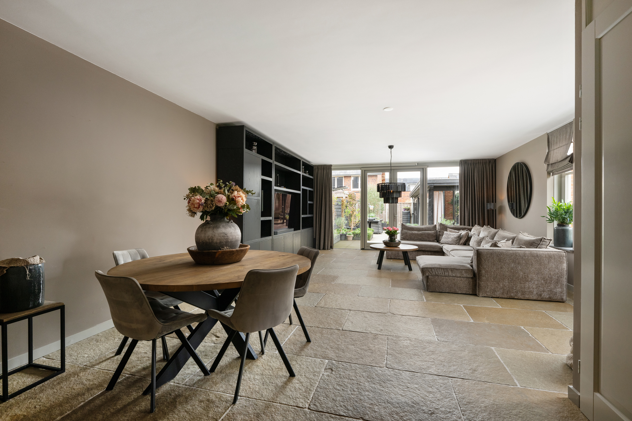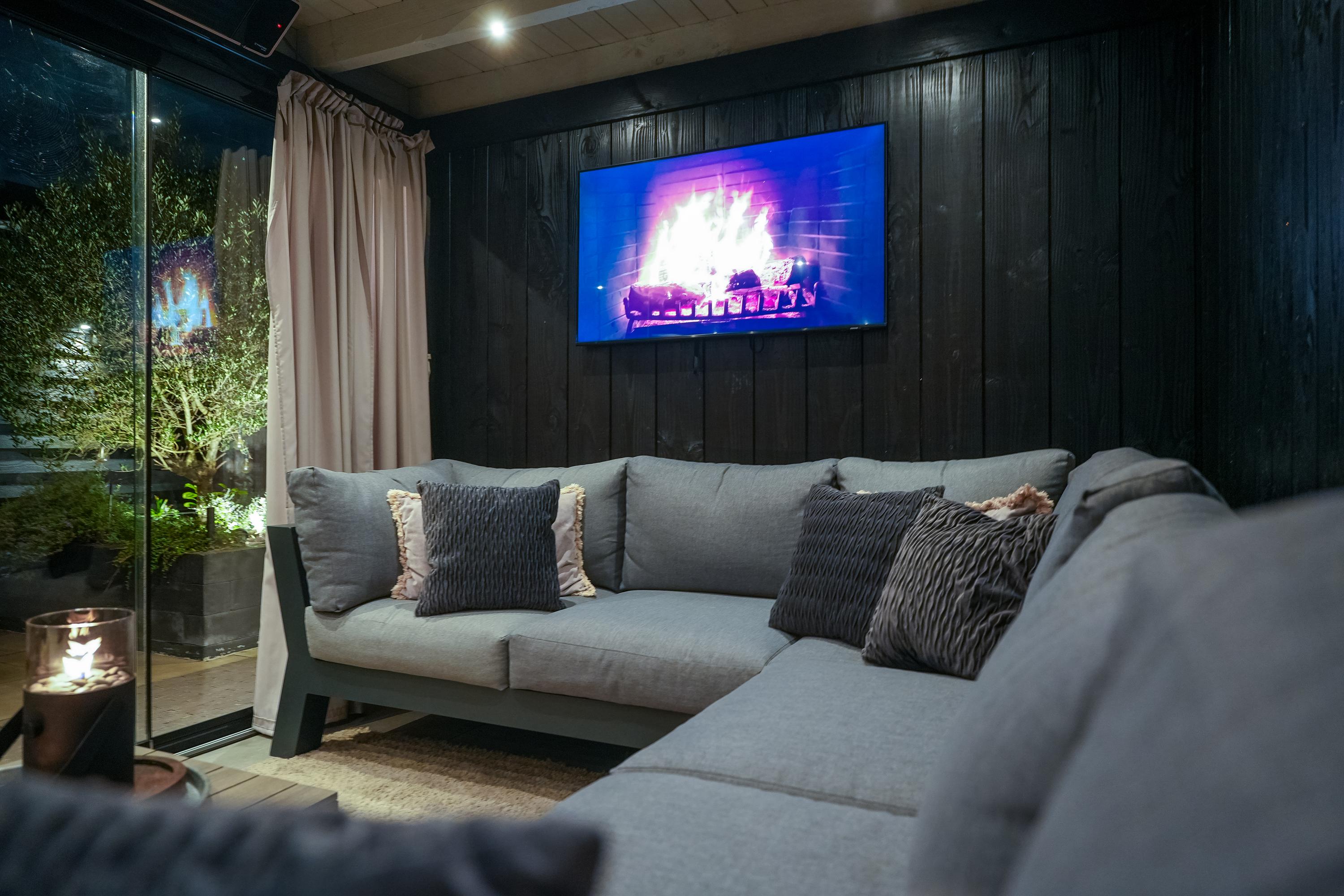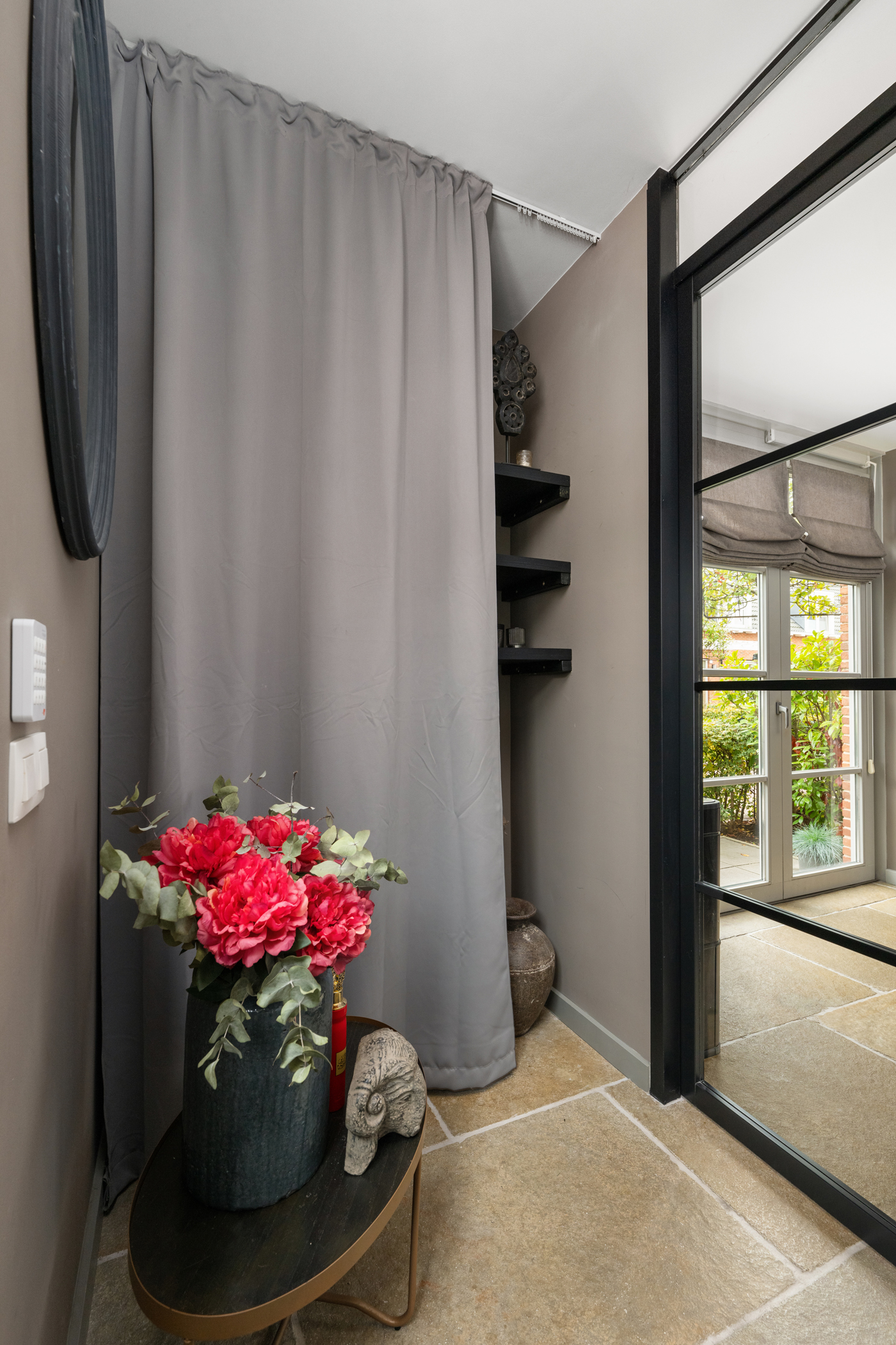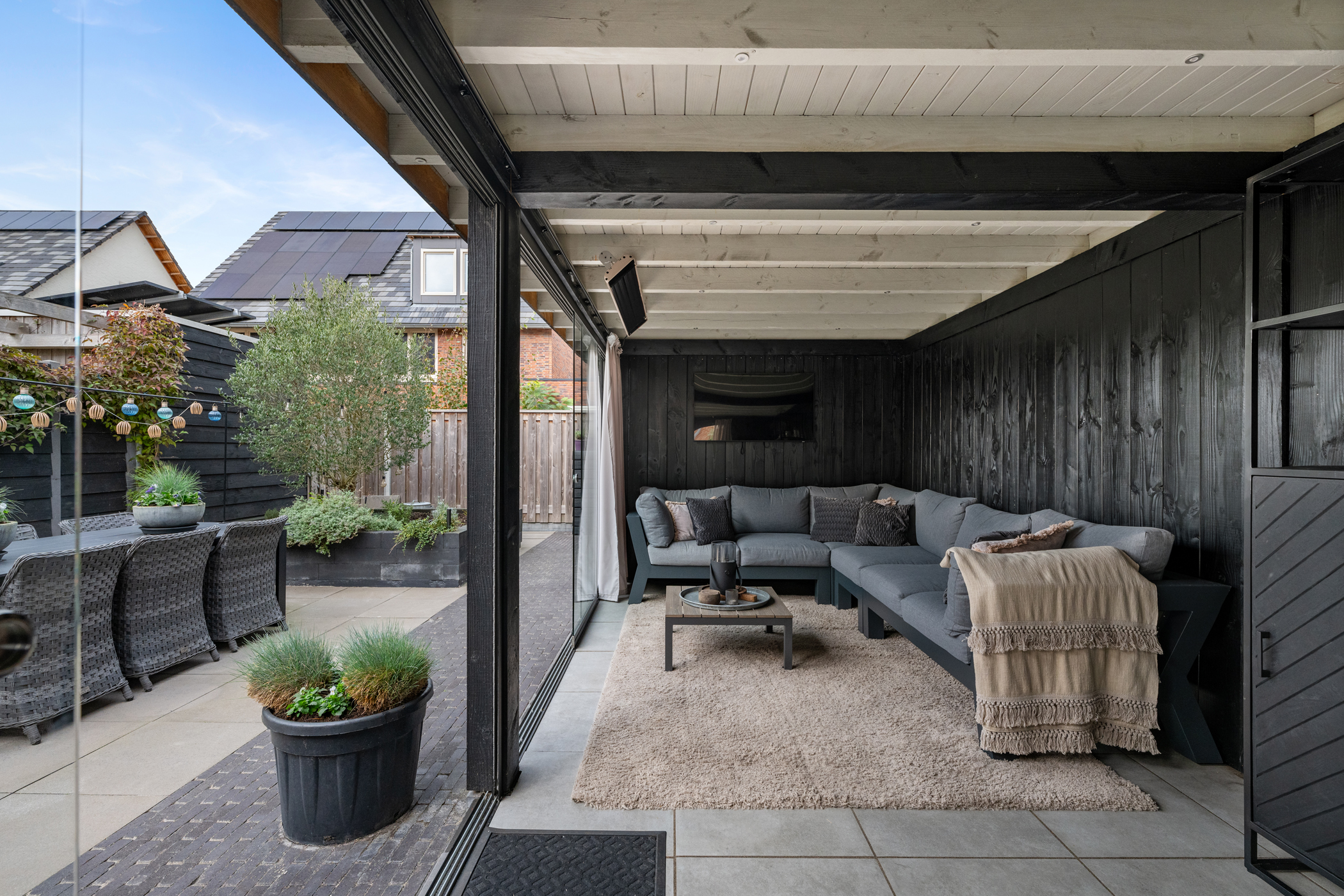 A sunny garden with an attractive covered terrace with glass enclosure, fitted with electricity and internet. The space is fully insulated and equipped with skirting heating, making it comfortable throughout the year. In addition, four solar panels contribute to an energy-efficient and sustainable home.