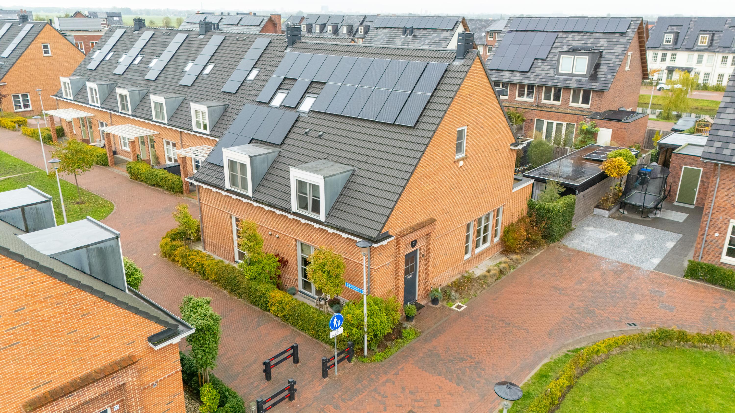 Set along a quiet green area at the front, the house features a well-kept front garden. Entry through the hall with wardrobe space, meter cupboard and a tiled toilet with wall-mounted toilet and basin. The living room is spacious and bright, finished with a Bourgondisch dallen natural stone floor with underfloor heating. The staircase to the first floor is located in the living room and the stair-cupboard is used as extra wardrobe space. Patio doors lead to the deep garden with covered terrace and detached wooden shed. At the front of the house is the modern kitchen with a large cooking- and sink-island and high-quality built-in appliances including a pantry pull-out, sink, gas hob, extractor hood, convection oven, refrigerator and dishwasher.