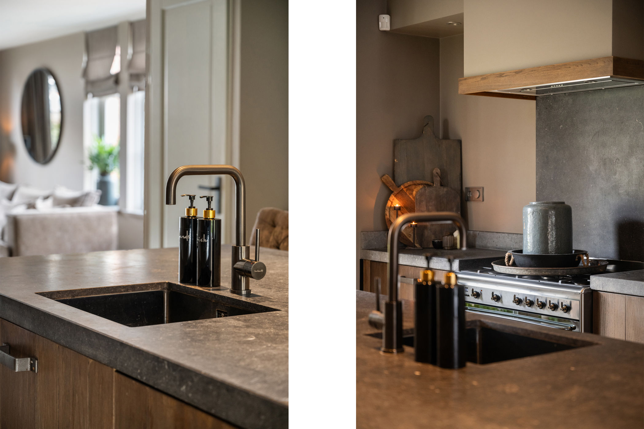 Modern open kitchen with large cooking- and sink-island;