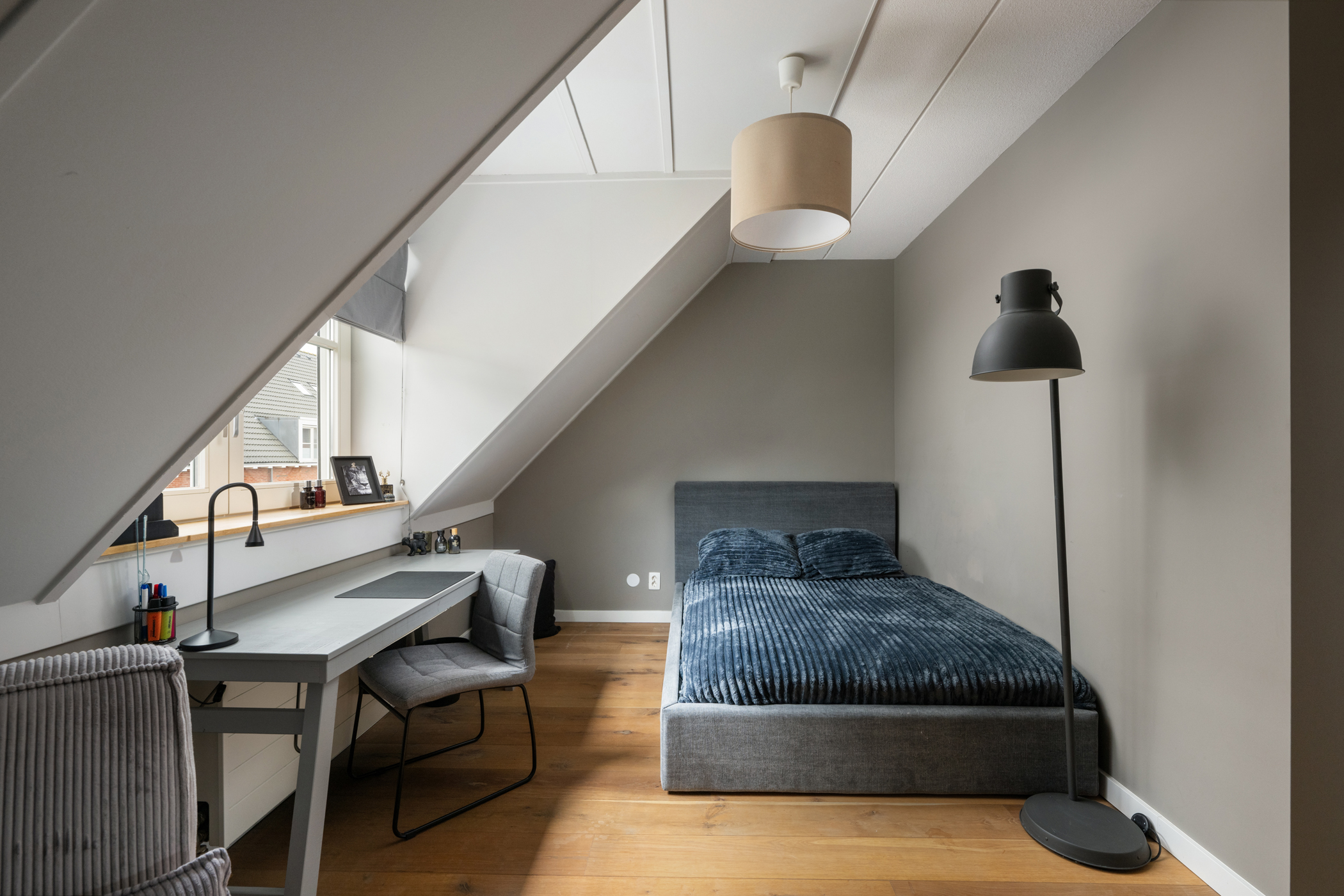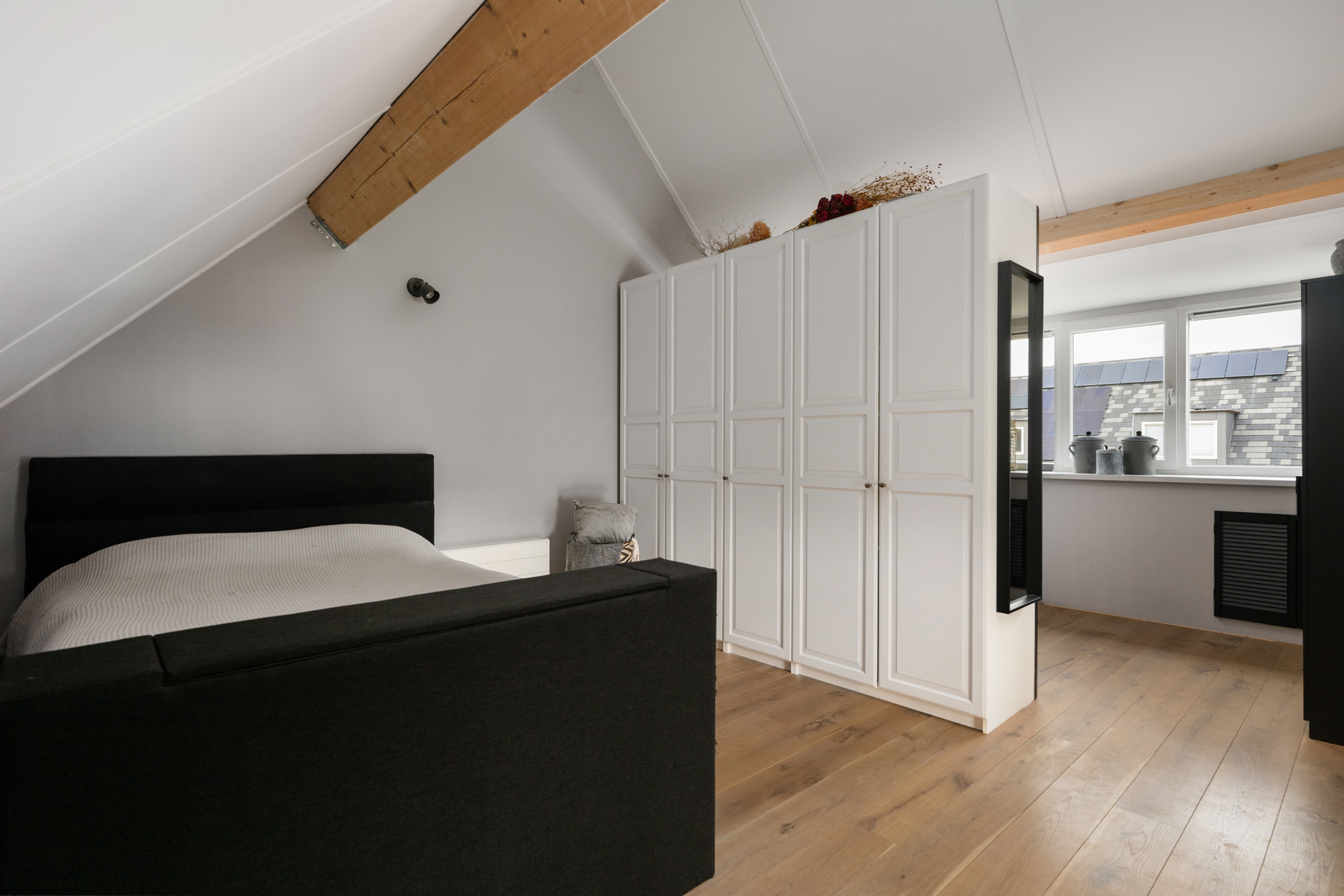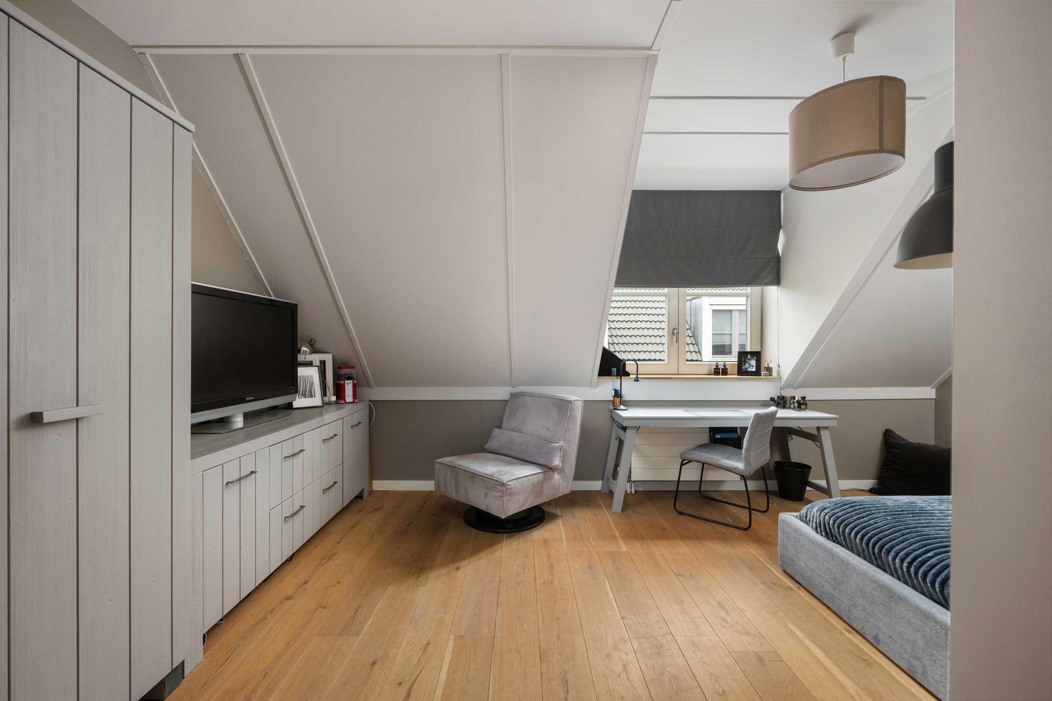 The spacious open attic level features a wooden floor, a dormer and knee-wall storage. There is a separate laundry area with the central heating system (Intergas 2019), mechanical ventilation unit, washing machine, dryer and inverter for the PV-solar panels. The open layout offers plenty of scope to convert into two additional bedrooms — ideal for extension or multifunctional use.