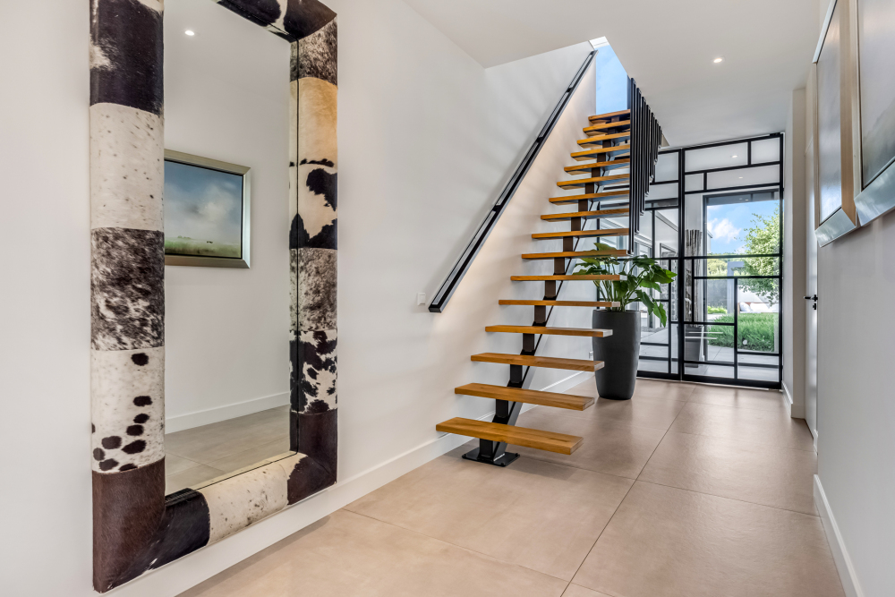 Approx. 19.5 m², with tiled flooring, plastered walls and ceiling with recessed lighting, a wardrobe, floating staircase with access to the master suite and first floor, and a floor-to-ceiling steel door leading to the corridor.