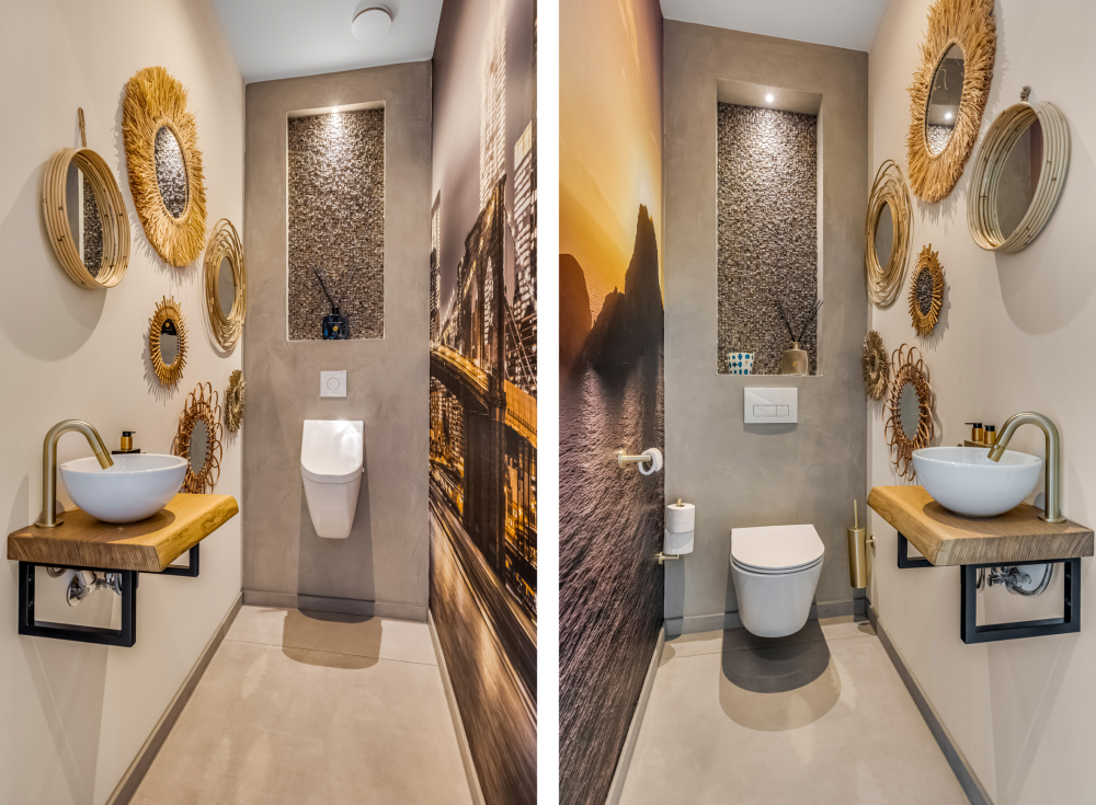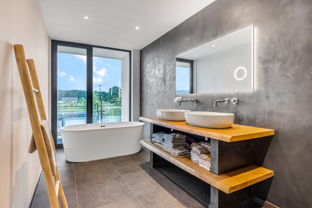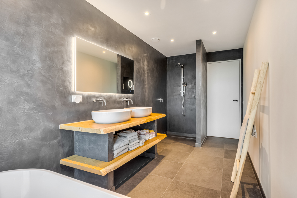 Approx. 8.5 m², with tiled flooring, plastered walls (beton ciré), plastered ceiling, walk-in shower, and a vanity unit with two sinks.